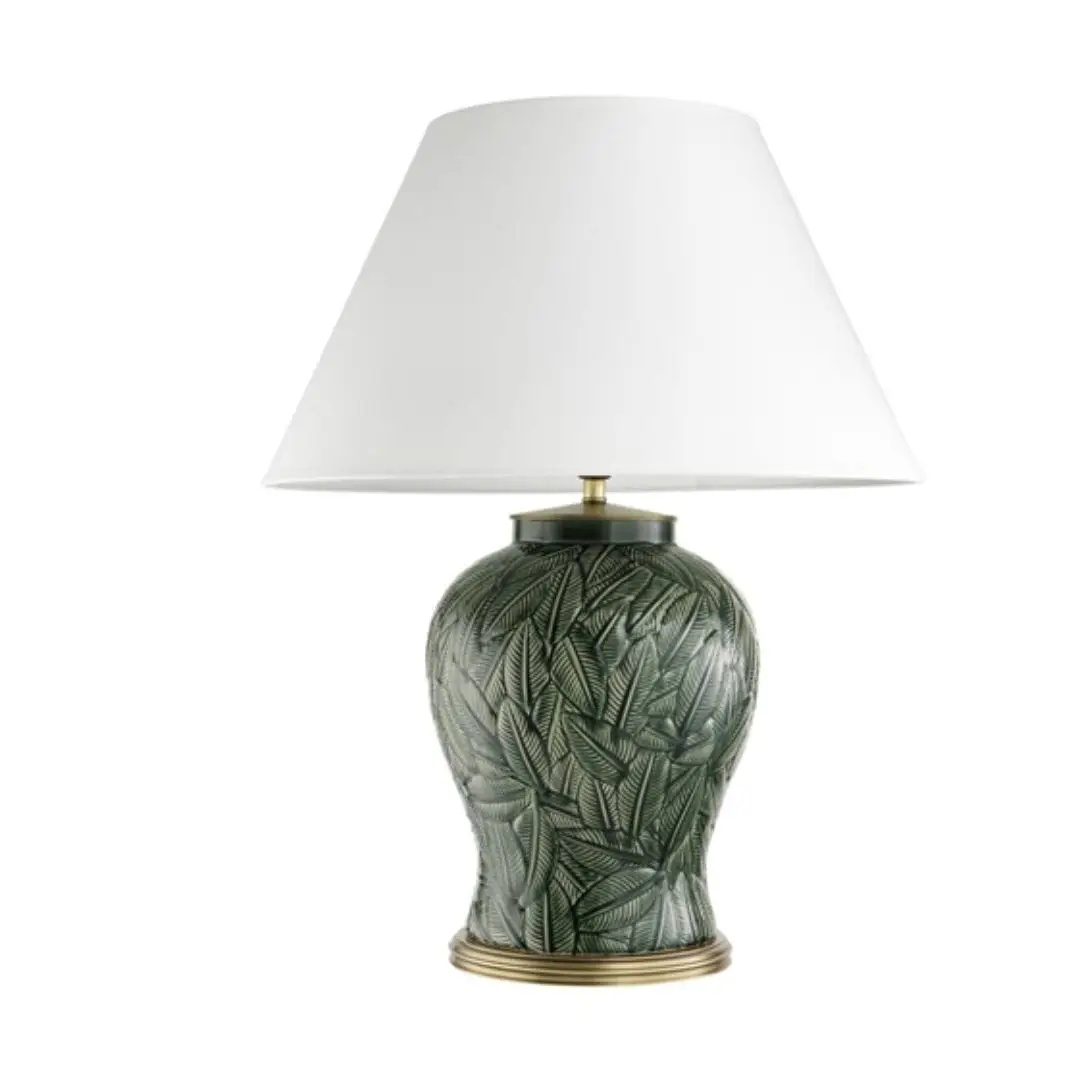 If you love the botanical jungle trend, the Cyprus Table Lamp is a must-have for you! This arborous beauty will give your home décor a tropical touch. The white ceramic lamp base features a wonderful leaf relief and a ribbed rim with antique brass finish. It comes with an off-white lampshade.