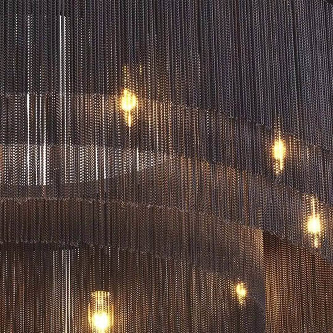 Provided with an antique brass finish, the large Tissot Chandelier lends a fanciful touch to your space due to its eye-catching design. With four rows of thin chains that remind one of fringe flapper dresses from the 1920s, it radiates the glamour and extravagance of The Great Gatsby. Combine with one or more small Tissot Chandeliers for added dimension.