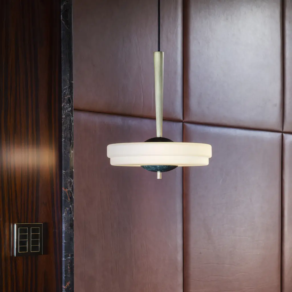 Suspended from a reeded fluted brass stem, the shade of the Trave Pendant Lamp features a two tier soft finish opal glass. The addition of marble highlights produce a light that is soft and ambient for a warm but dramatic atmosphere.