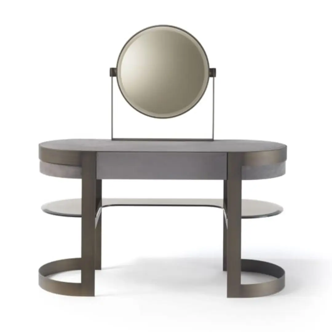 A console whose essential contours combine marble or leather to glass and metal, for a result of formal perfection.