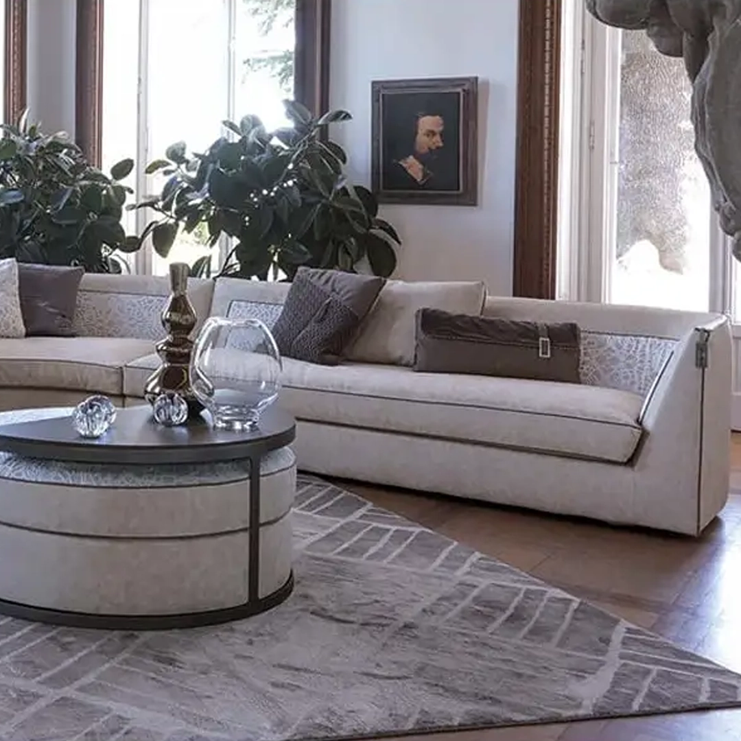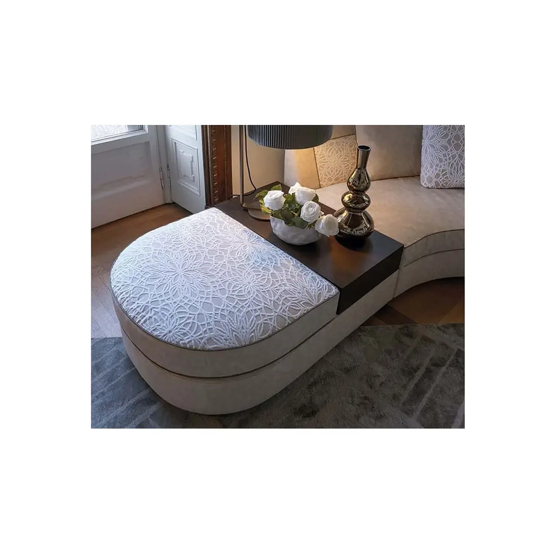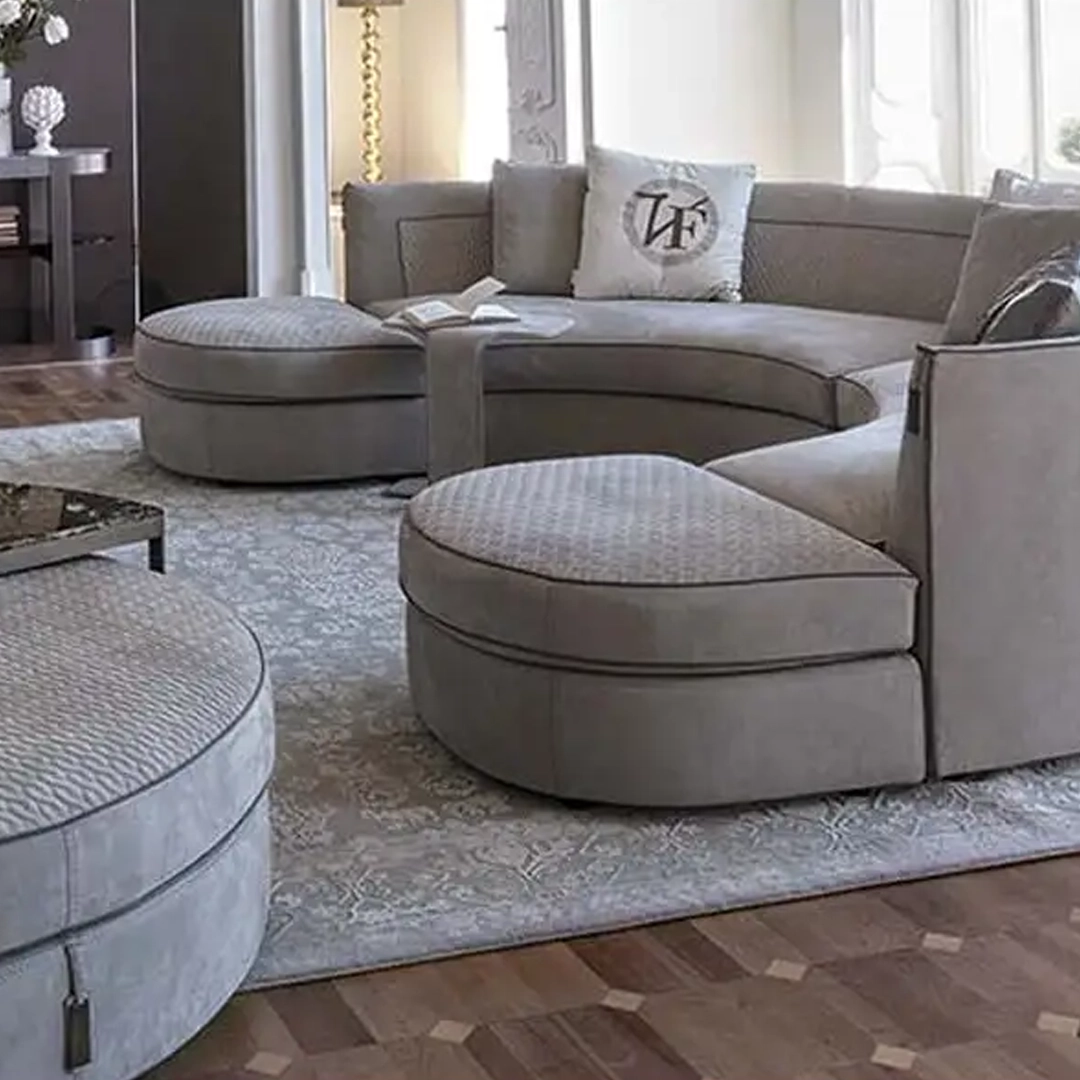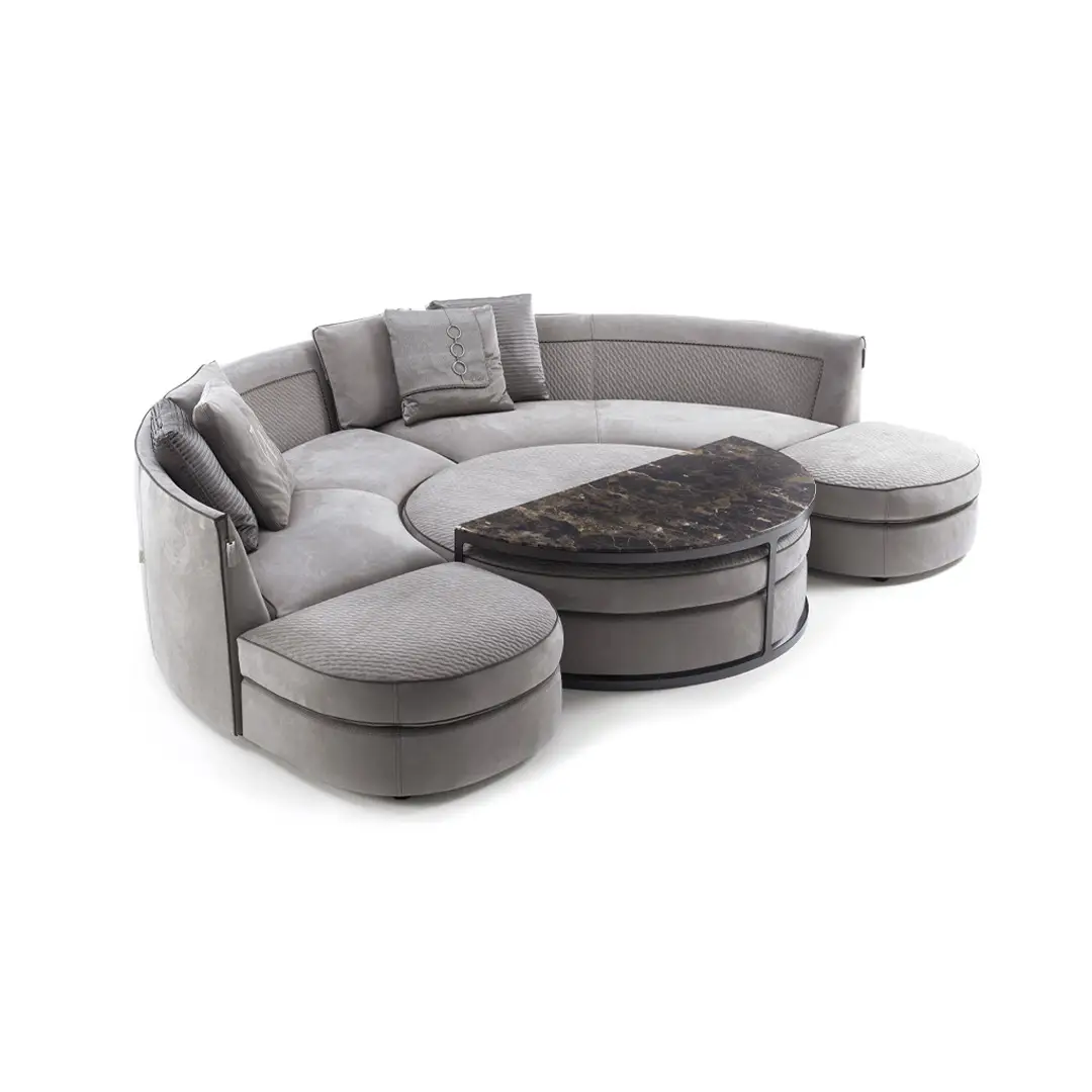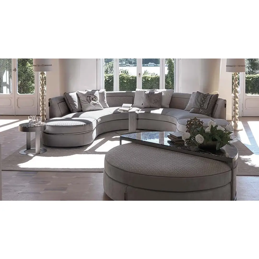 The distinctive feature of the Borromeo sofa is its classic and contemporary taste, with modern proportions and an elegant and luxurious style. The collection is divided into linear solutions with closed or modular sofas, classic corner solutions and above all it is enhanced in the iconic version with curved corner with round pouf and coordinated semicircle-shaped coffee table. The harmonious element of the collection is the dedicated quilting inside the backrest and repeated on the surface of the poufs finished with a contrasting hand-stitched profile, while the rest of the sofa is finished with a refined smooth profile. The collection is completed by a series of accessories such as semi-circular tables and island poufs with inserts in wood or marble-effect porcelain stoneware.