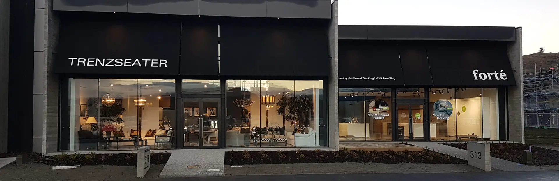 TRENZSEATER’s Queenstown showroom is a purpose-built, design-focused furniture store located on Hawthorne Drive in Frankton. With a 5-metre stud height, expansive glass façades, matte black joinery and a stacked concrete exterior softened by black awnings, the space reflects TRENZSEATER’s refined, architectural aesthetic.