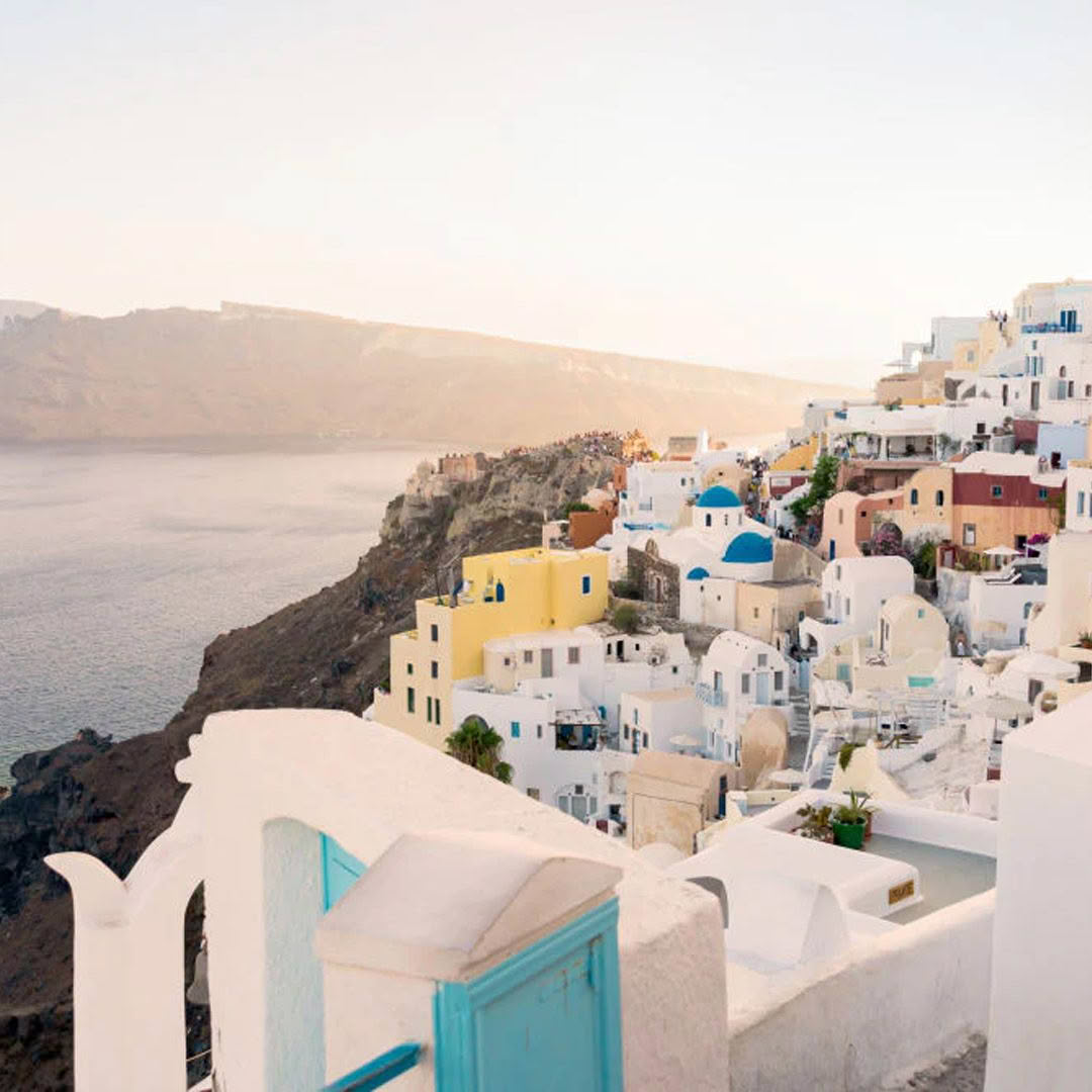 Bask in the breathtaking beauty of the Greek Isles with The View, Santorini, Greece, a fine art photography print from Gray Malin’s Greek Isles series. This captivating image captures the iconic white-washed architecture and brilliant blue rooftops of Santorini, set against the sparkling Aegean Sea and the warm hues of a setting sun, offering a perfect slice of Mediterranean paradise.