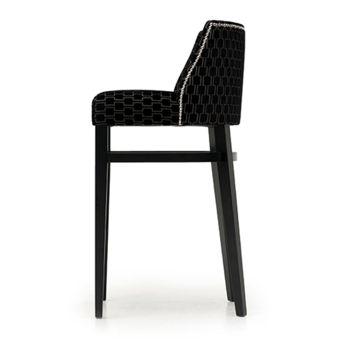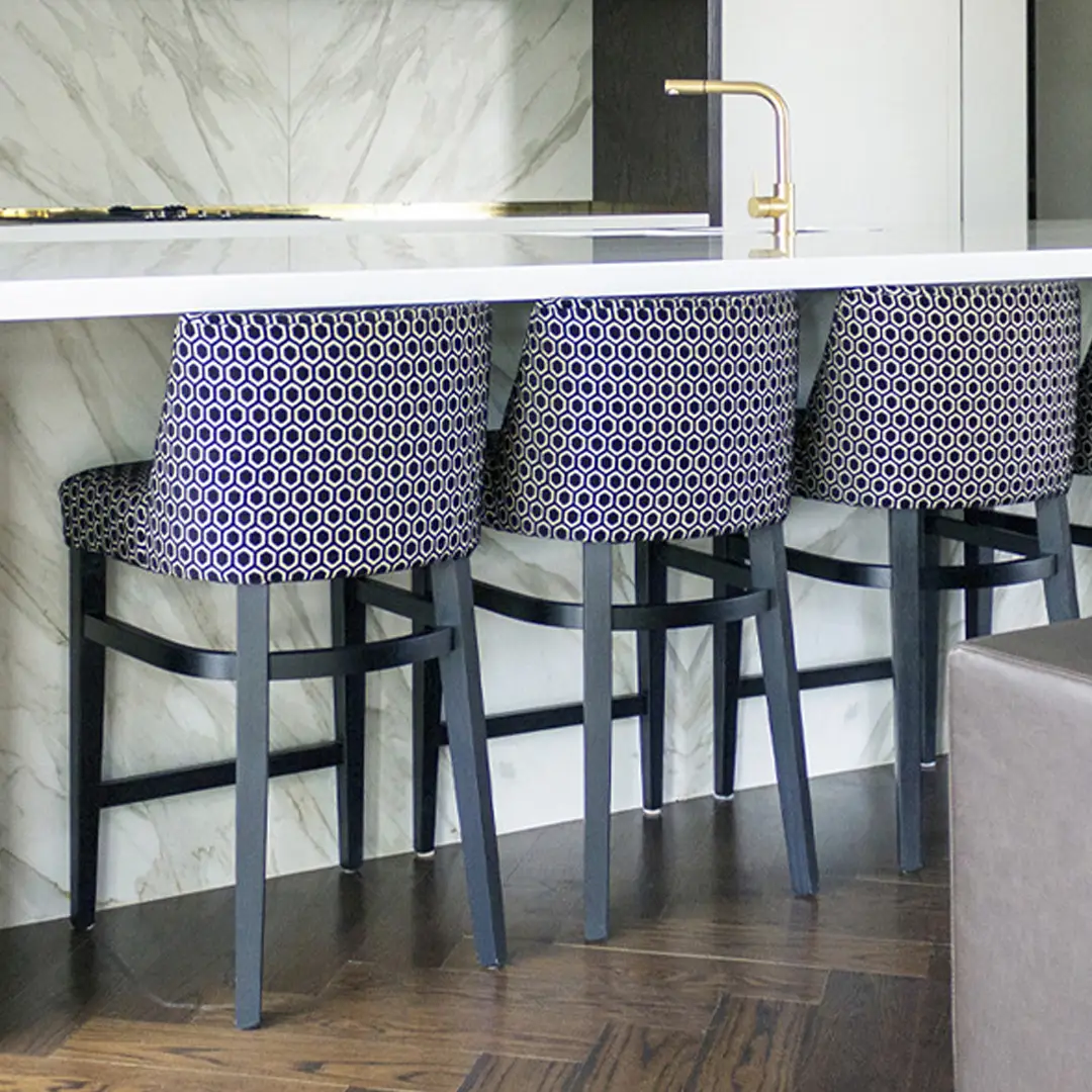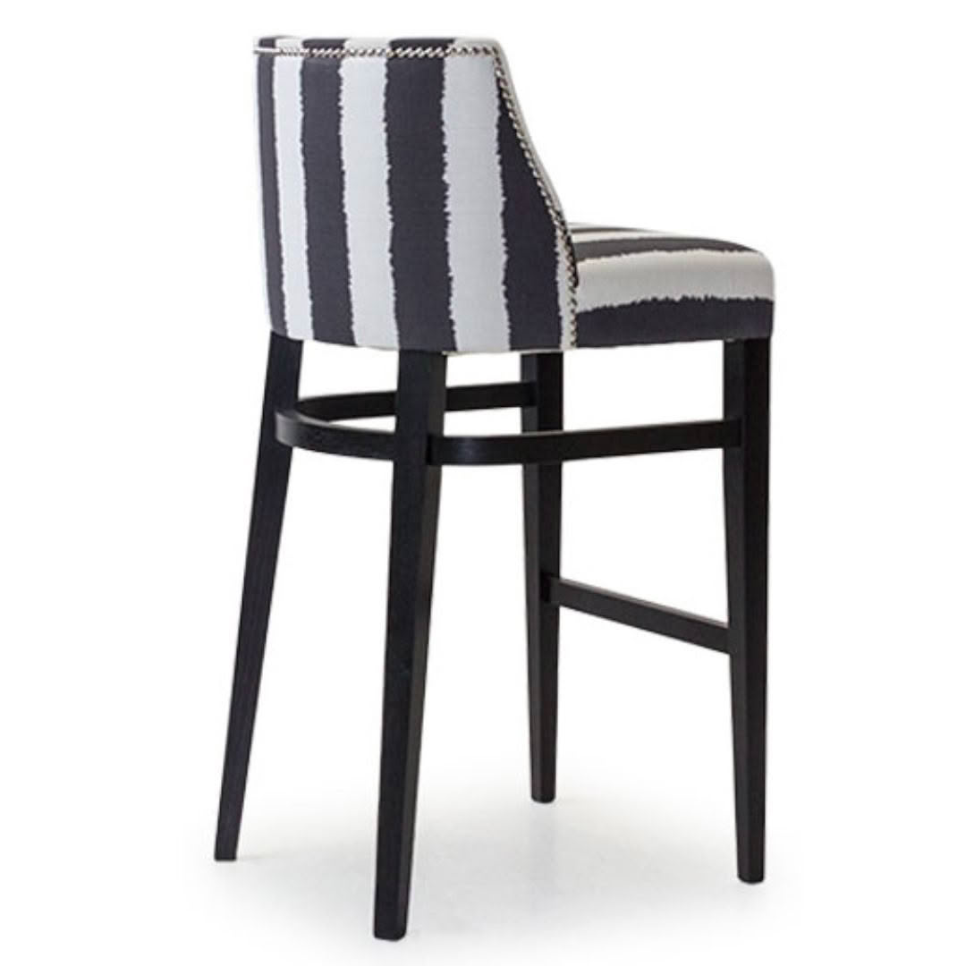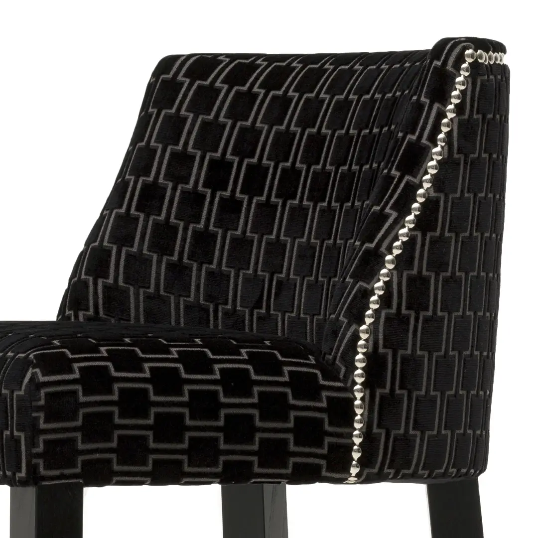 Elegant barstool with tapered leg, upholstered seat with stud detailing. Made with your choice of fabric or leather.