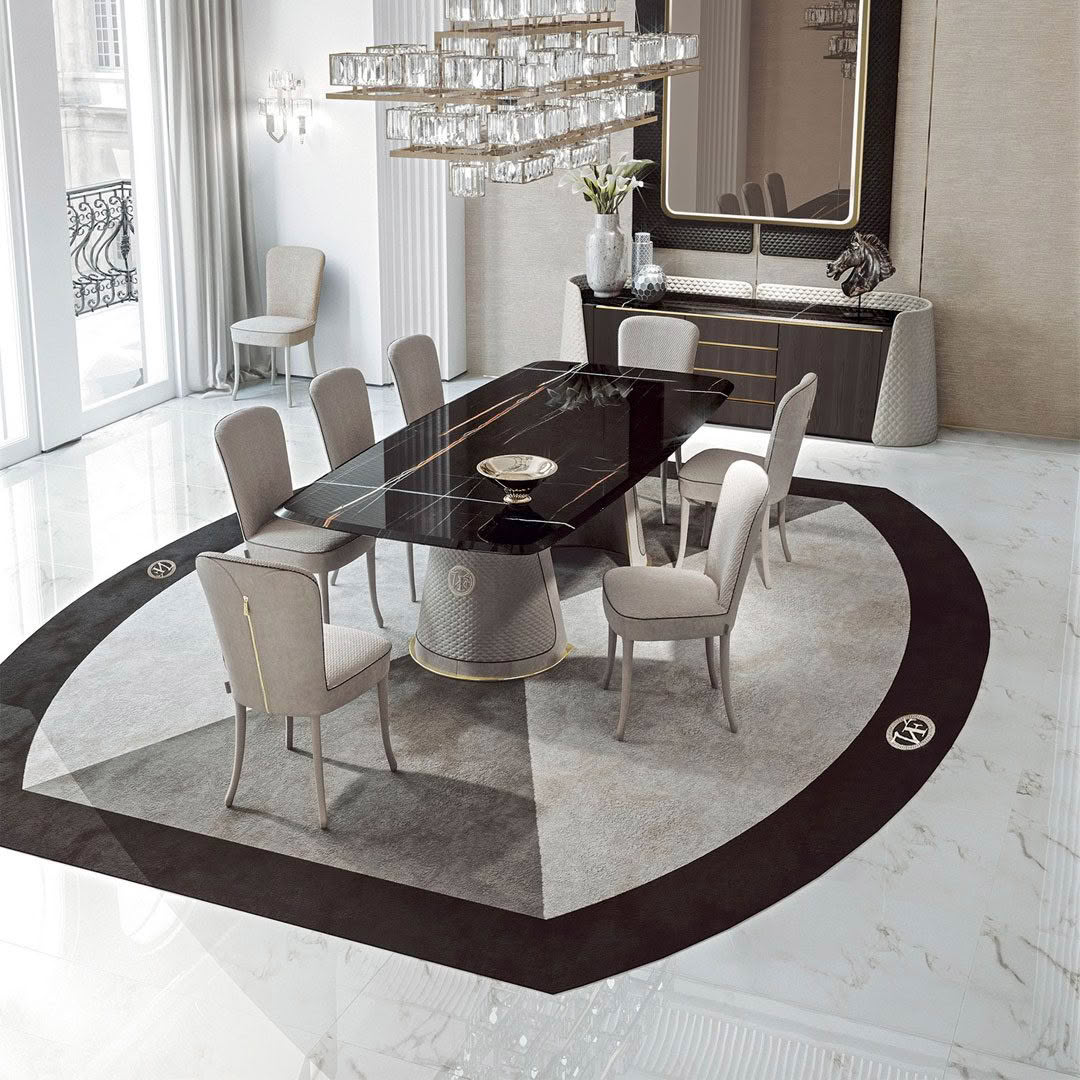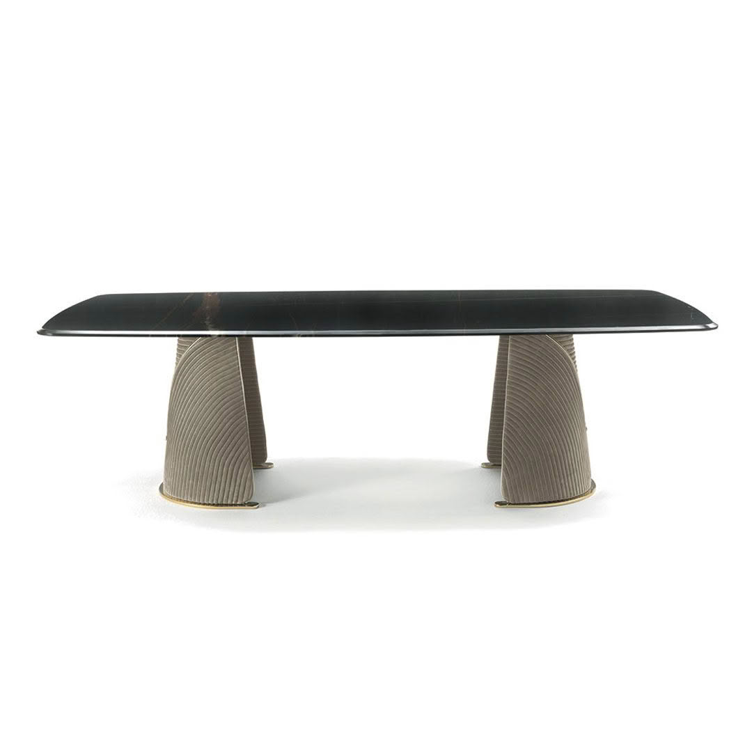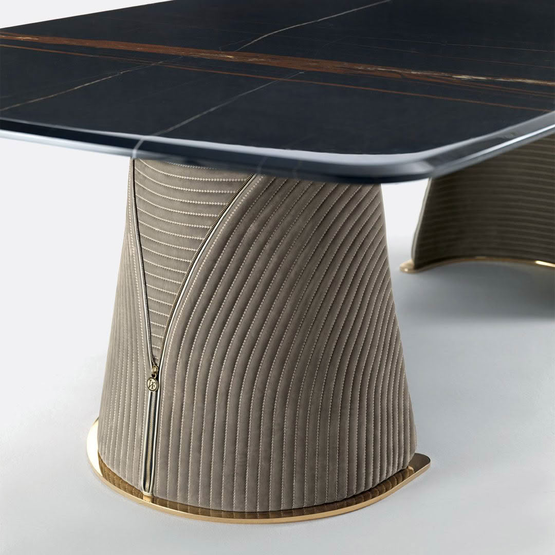 The tables of the Foscari collection are available in both round and rectangular versions with rounded corners. The top in its extreme simplicity enhances the materials, while the bases available in two versions offer original furnishing choices. The A version of the Foscari base highlights two half-moon legs covered in fabric or leather with dedicated embroidery and gold chrome zip as a further beauty detail, while the B version is characterized by a cover in fabric or leather with dedicated quilt and logo VF embroidered in contrast for an even more luxurious effect. In both cases the bases rest on a metal plate in the colours of the VF collection.