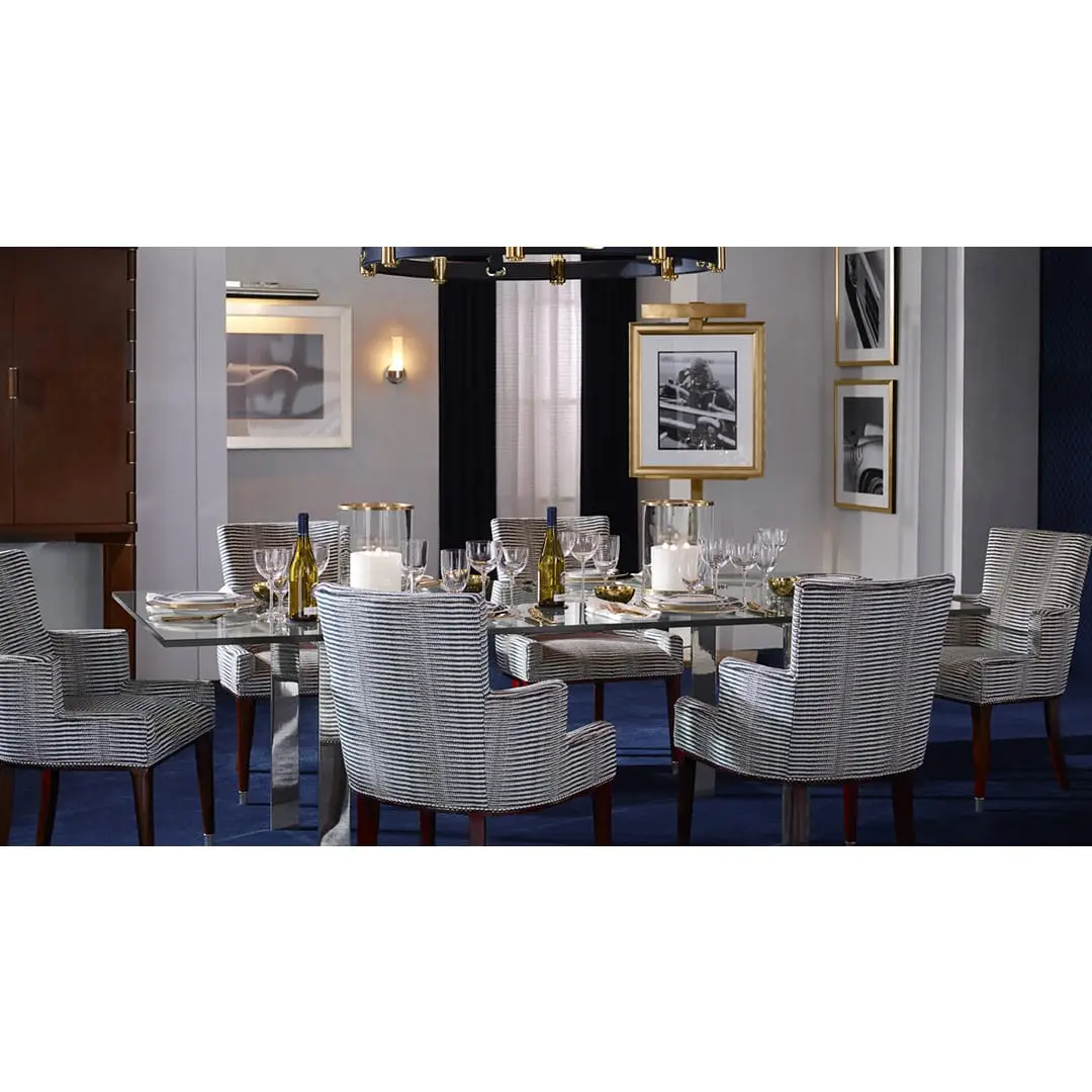 Ralph Lauren’s Langham dining table has a contemporary silhouette is designed with clean lines and ample surface space.