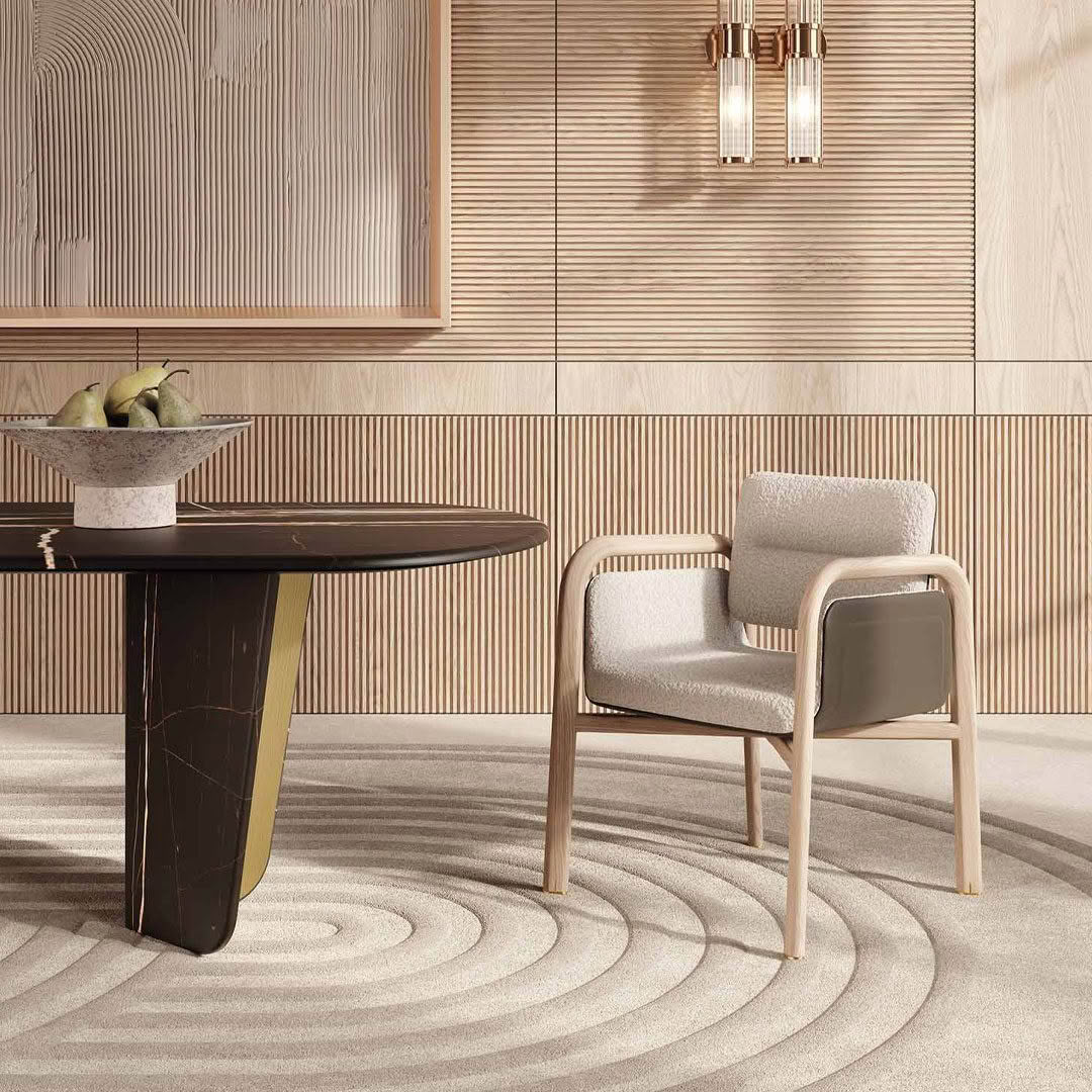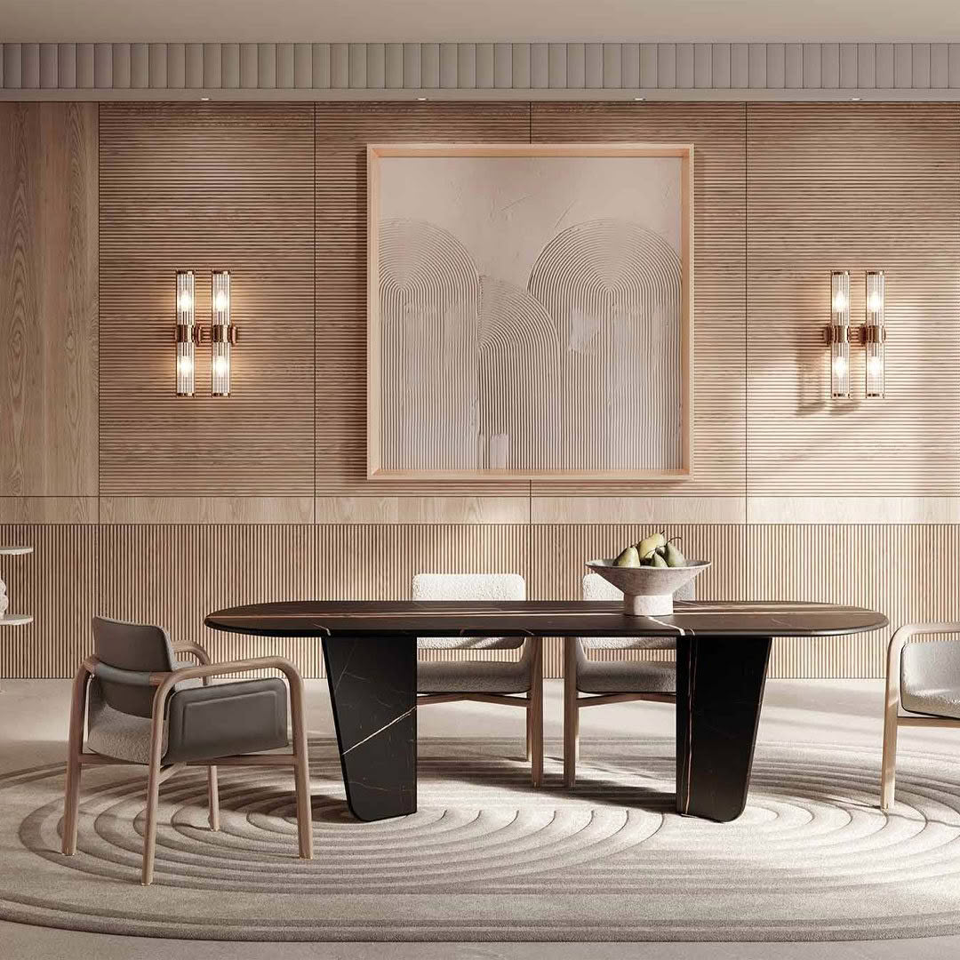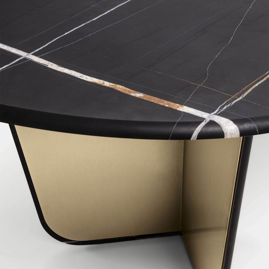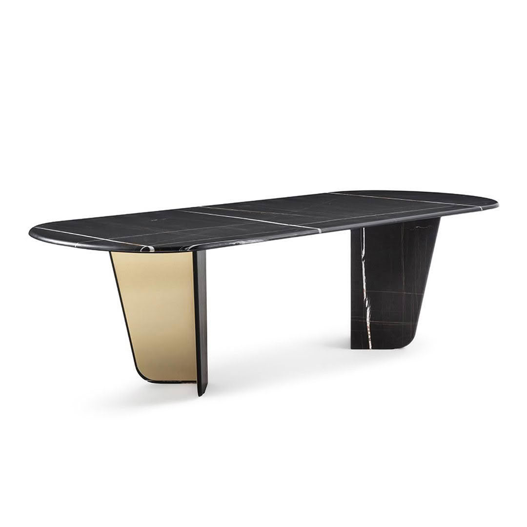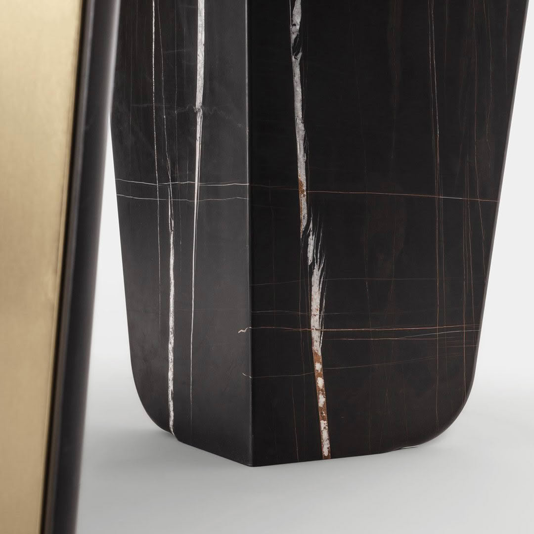 Giorgio Bonaguro design hallmarks is the research of new materials and contamination between different arts, for a style featuring simple and elegant lines. The dining table Monroy embodies the designer’s peculiarity for sleek forms for table with legs shaped like two opposite reversed sails for geometrical pure lines. The top and the legs are made of marble and the legs feature a visual and matter contrast: on the external part of the marble leg a metal plate is applied creating a striking contrast in term of colour and texture.