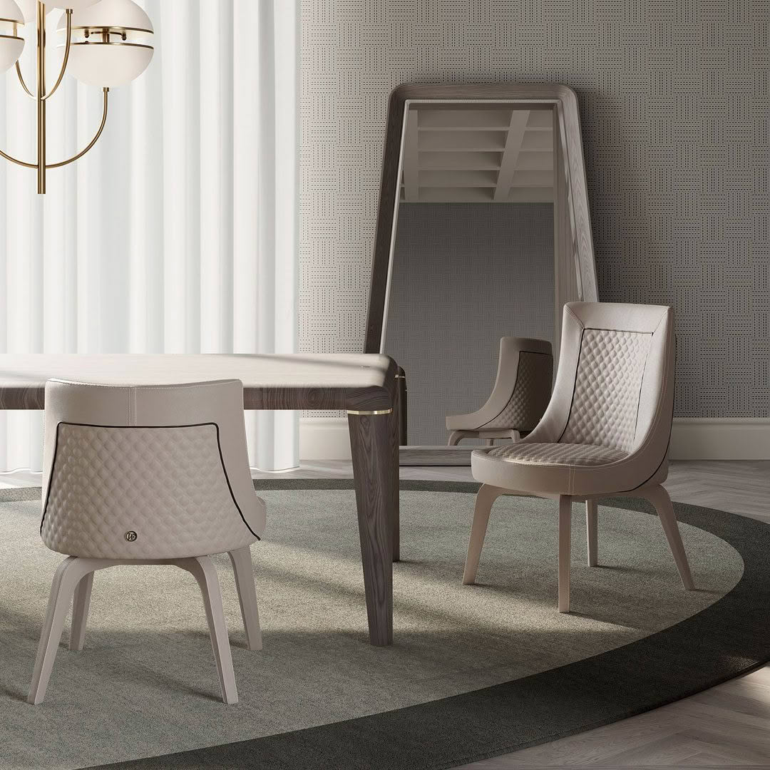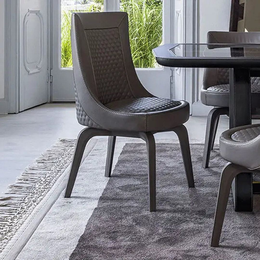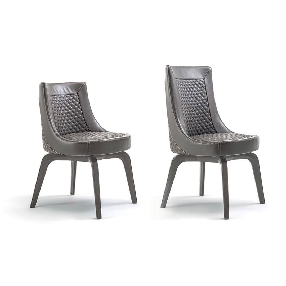 The Perla swivel chair is a jewel of craftsmanship and technology. The chair rests on a solid wood base with a swivel mechanism that allows the shell to automatically return to its original sitting position. The shell is upholstered in fabric or leather with an external and internal quilt on the back and seat. An interesting and comfortable chair available in two different backrest heights to further expand the possibility of personalizing your furnishing choice.
