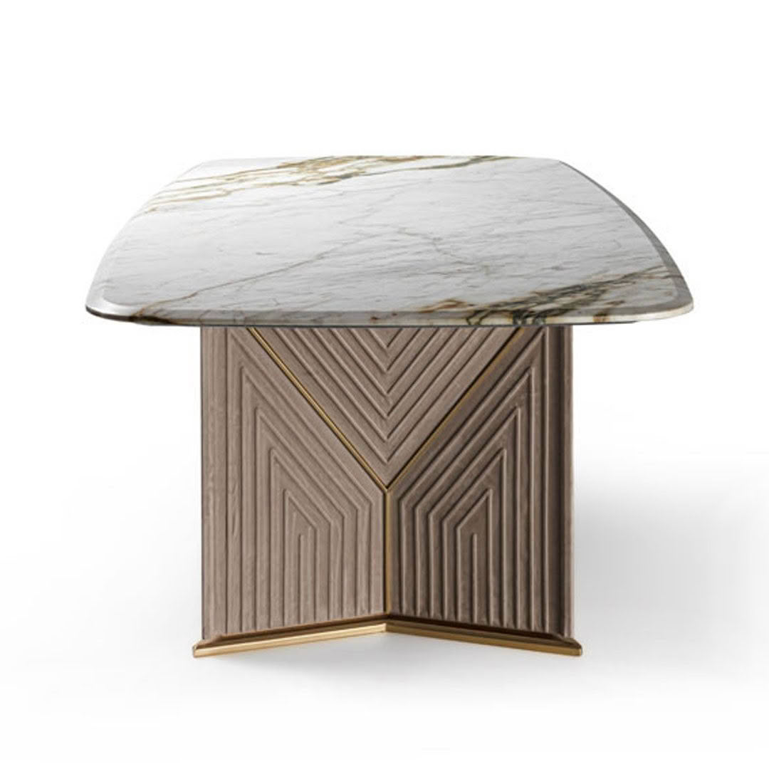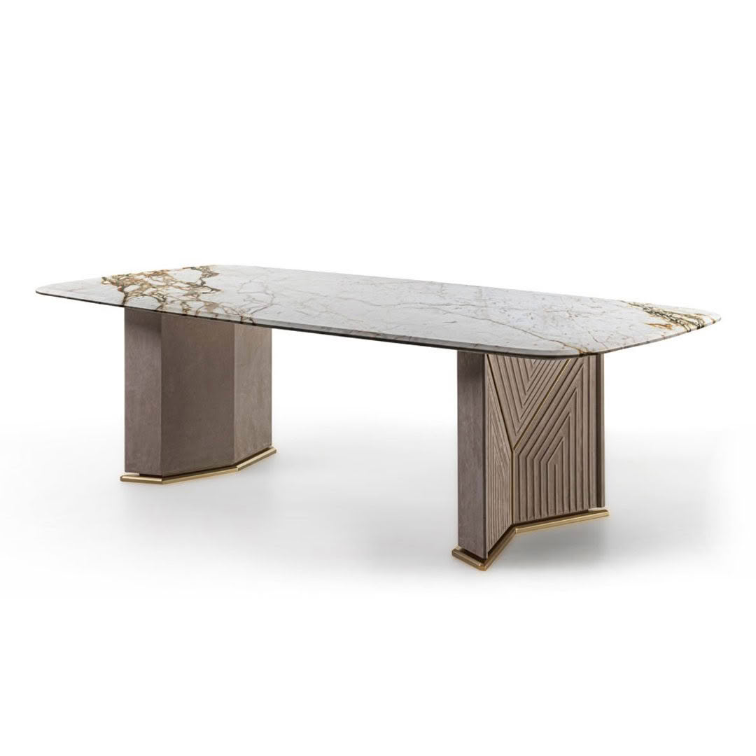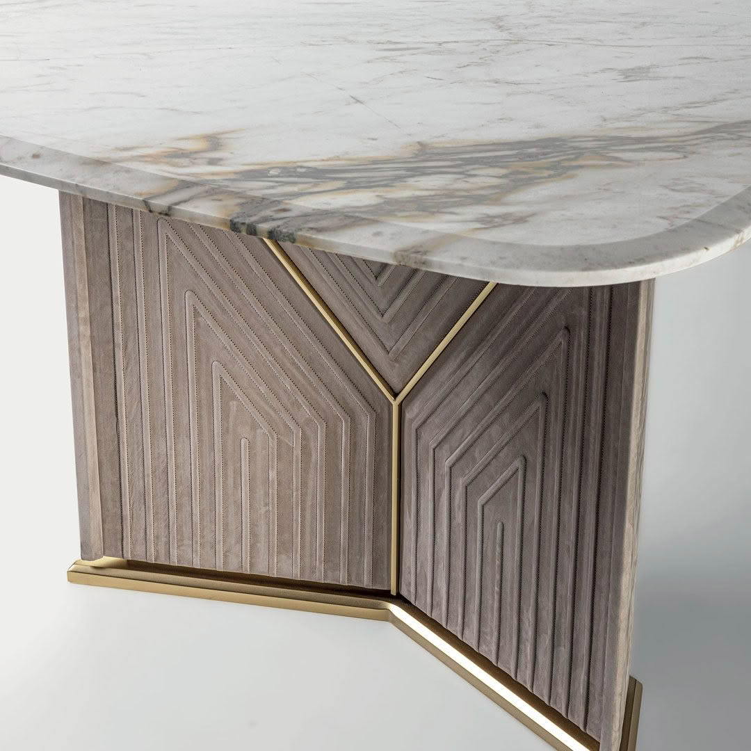 Noble by nature, Pinto dining table by Vittoria Frigerio enhances the collection’s tailoring skills, for a result of great visual impact and elegance. The chamfered marble top is available in precious finishes; the quilted base, with its rigorous geometric shape, is available in two different versions, for a versatile and refined proposal.
