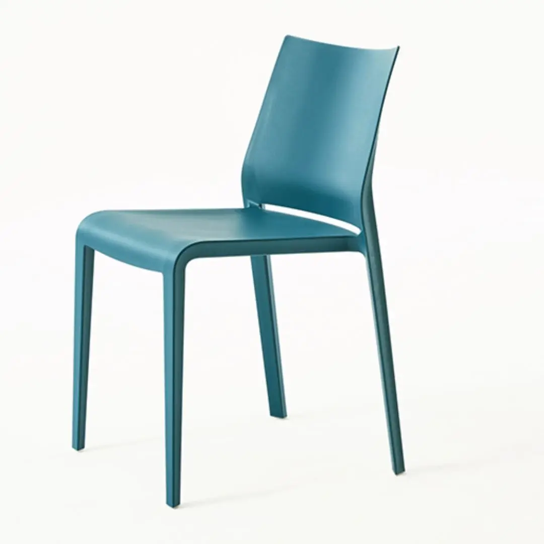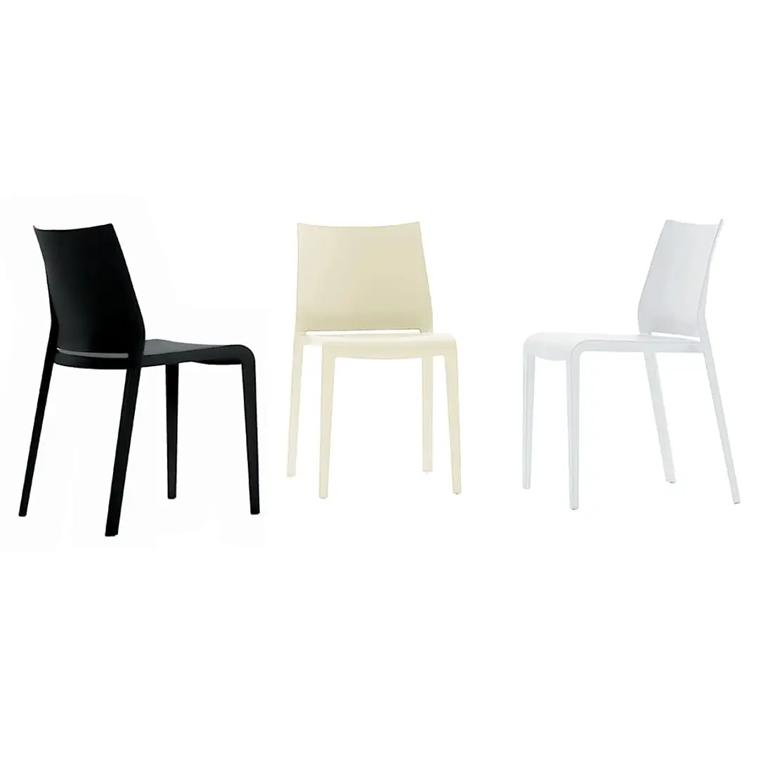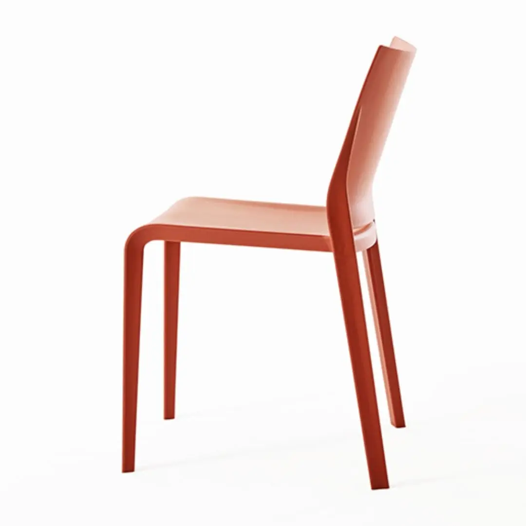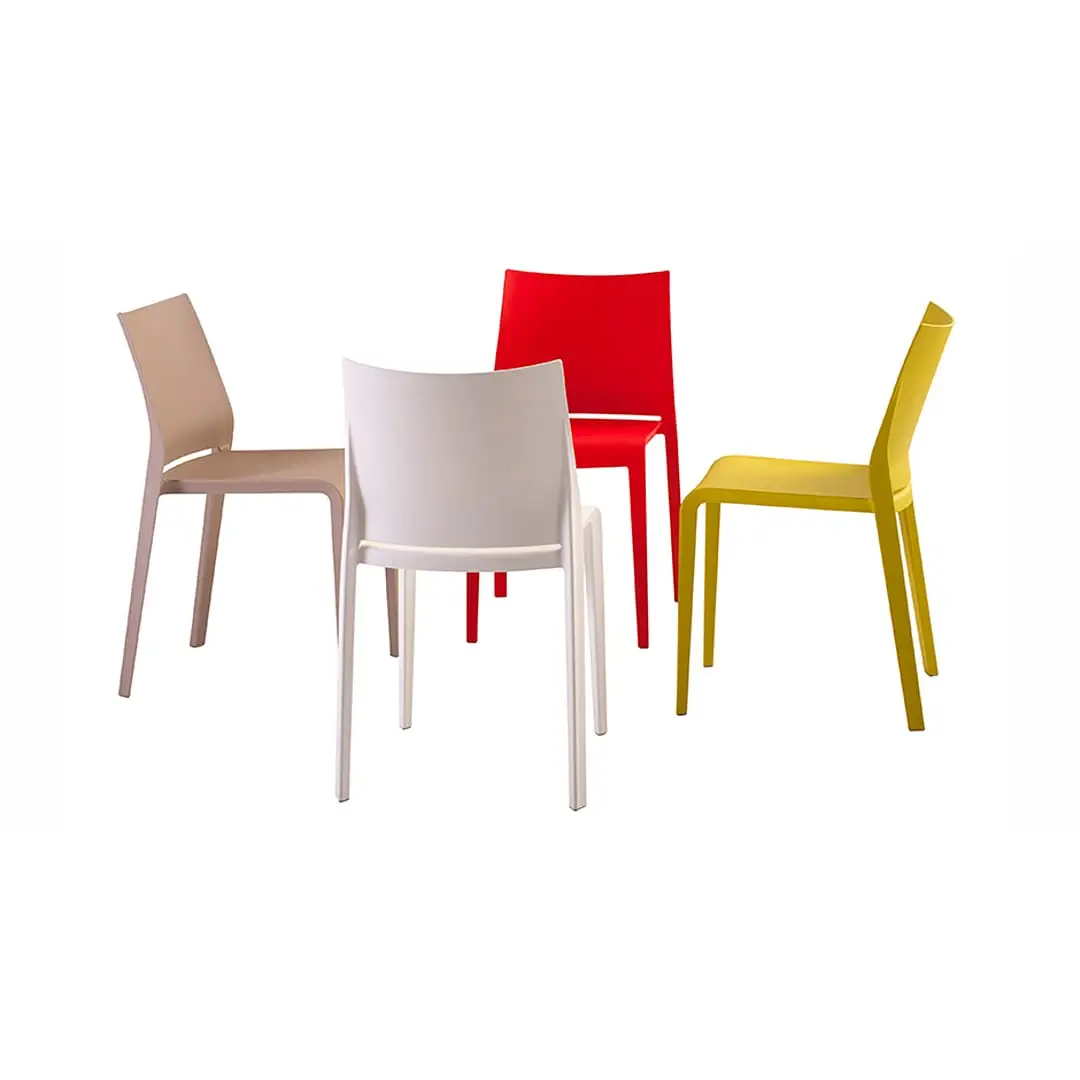 Comfortable, lightweight, stackable, formally refined in every detail. Riga is practical and robust maintaining a delicate elegance. Stackable chair made of polypropylene reinforced with fibre glass, produced with air moulding technology, suitable for outdoor use. Available in the following colours: white, light grey, “curry”, green “Gauguin”, dove, black, red, sand, grass green, anthracite, petrolio, ruggine.