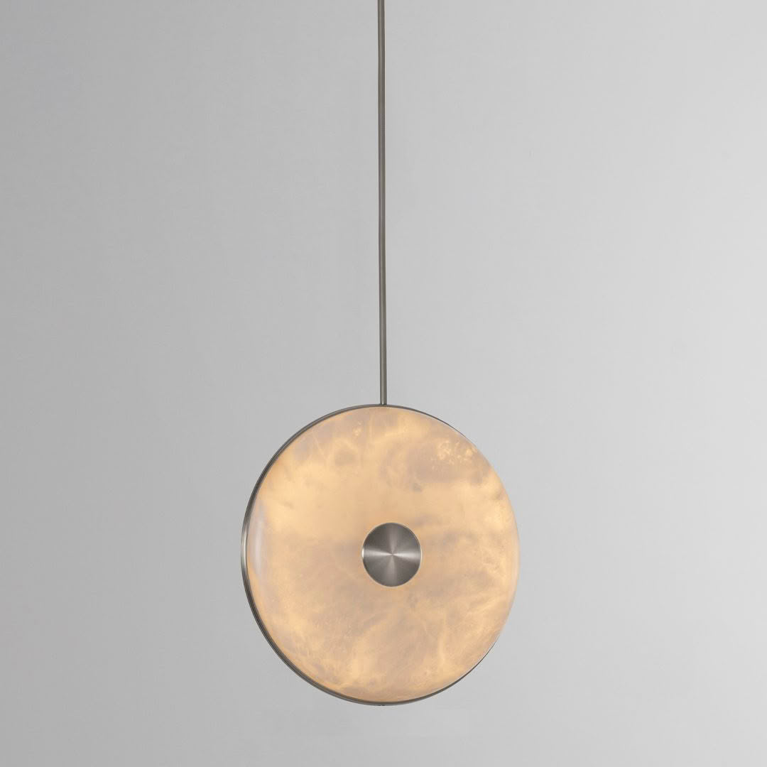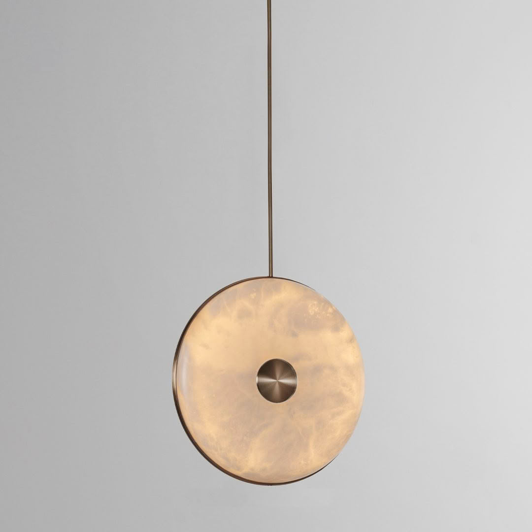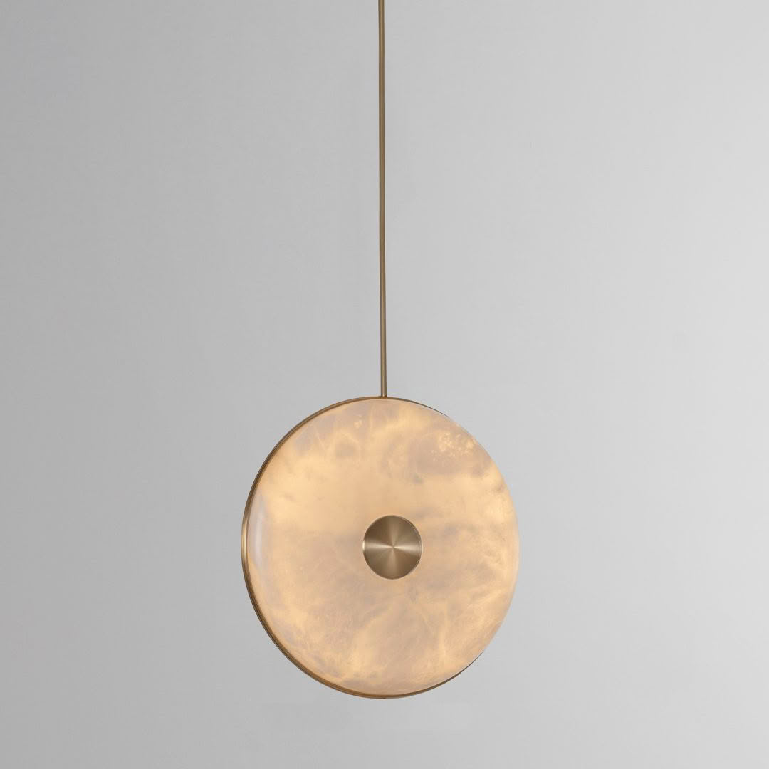 The range’s natural alabaster stone diffuser has been merged with precision machined brushed brass and suspended from a solid brass stem, resulting in a graceful pendant light. Whether hung alone or in a cluster with alternating heights, the warm ambient glow and unique veining of the stone will adorn the space with style and effortlessness.