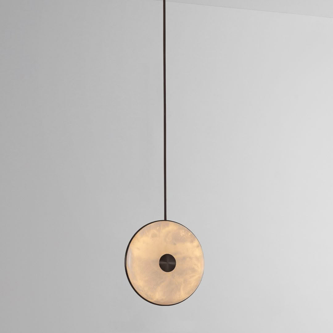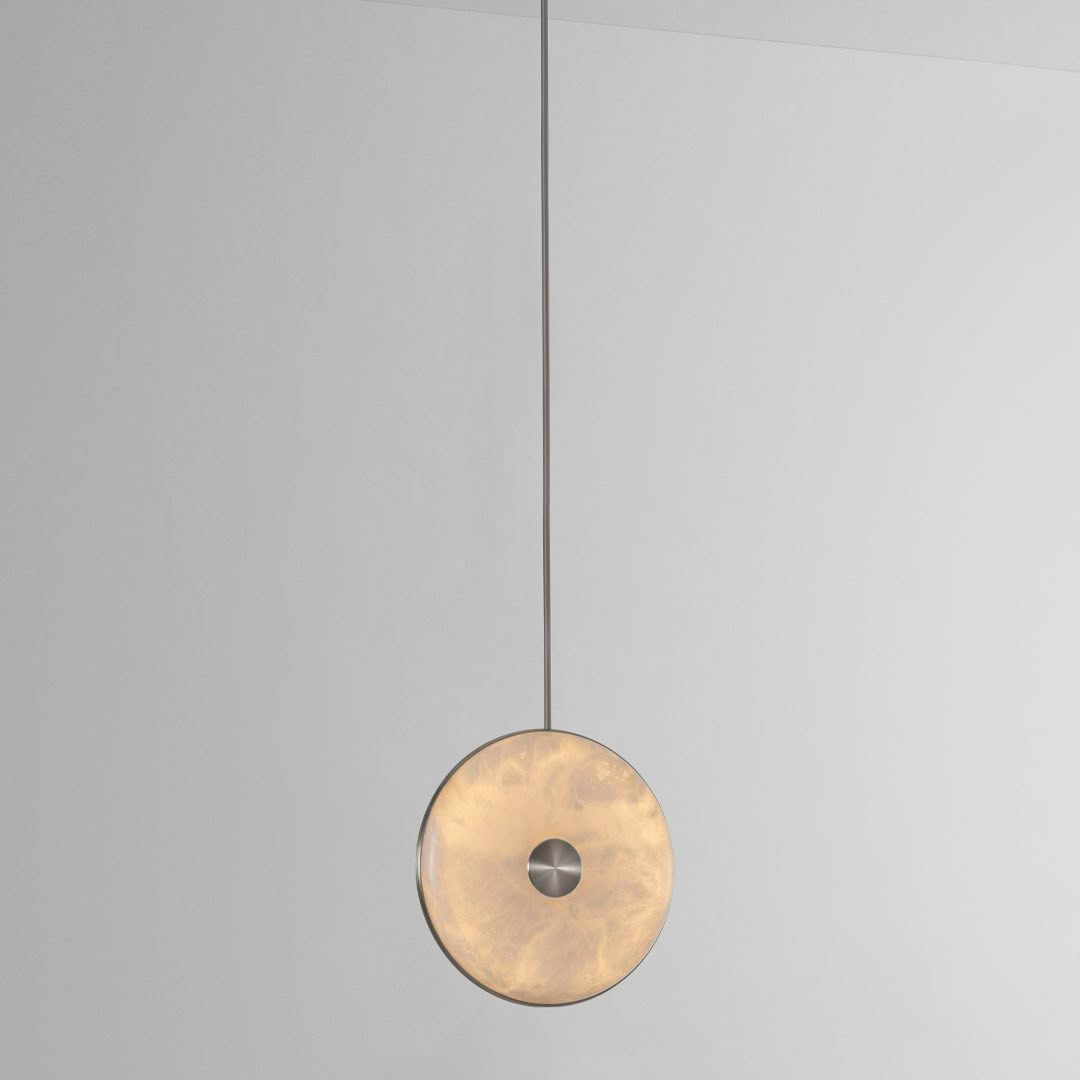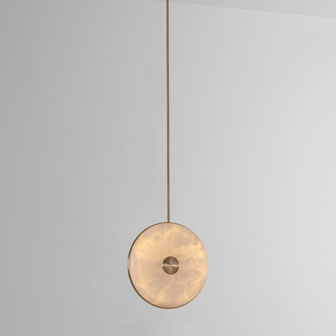 The range’s natural alabaster stone diffuser has been merged with precision machined brushed brass and suspended from a solid brass stem, resulting in a graceful pendant light. Whether hung alone or in a cluster with alternating heights, the warm ambient glow and unique veining of the stone will adorn the space with style and effortlessness.