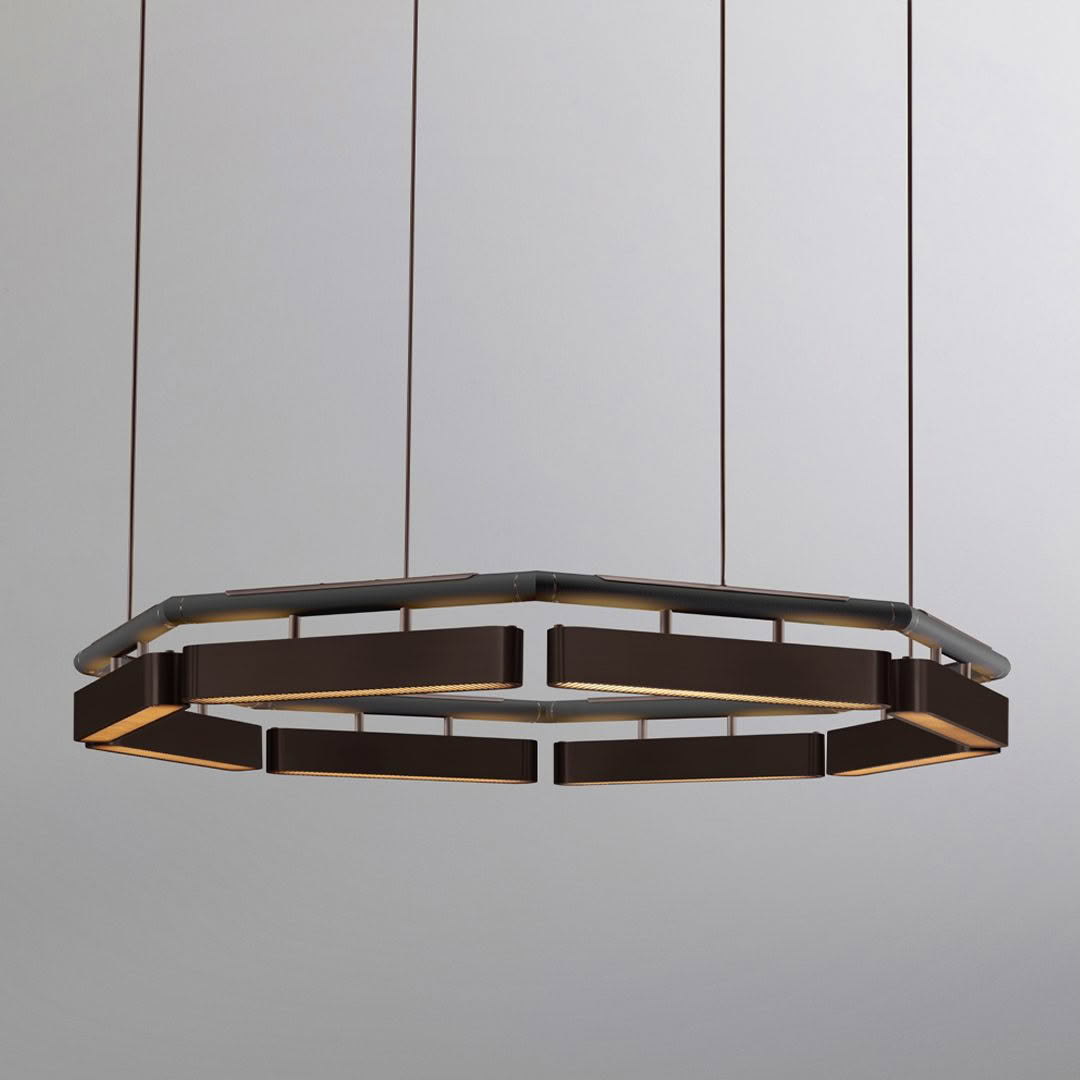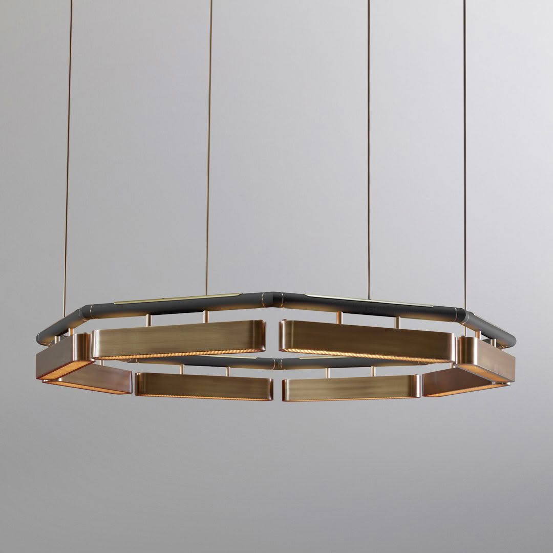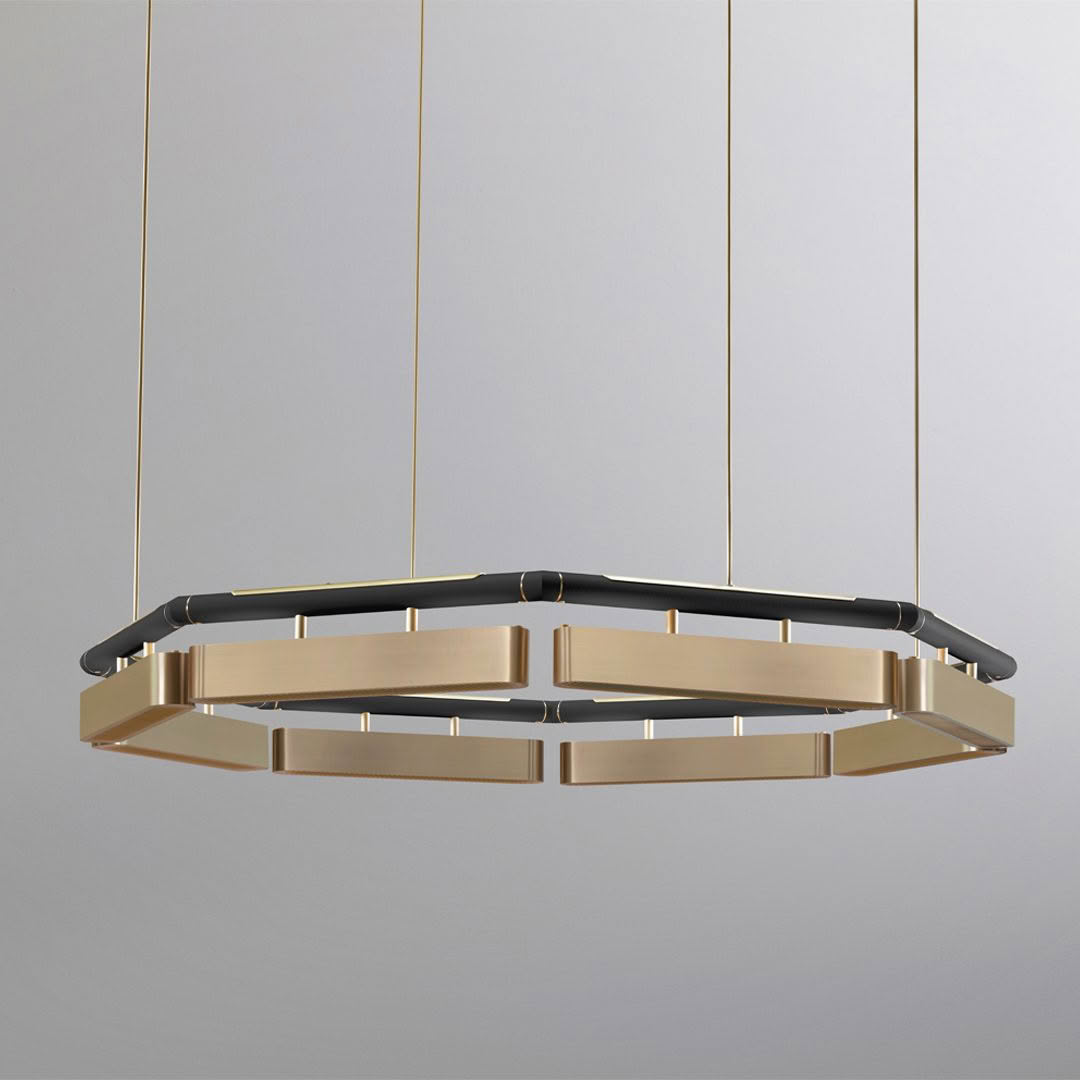 Experience geometric elegance with the Octagon chandelier. Featuring eight linear elements and triple machine-cast brass diffusers with slotted opal inserts.