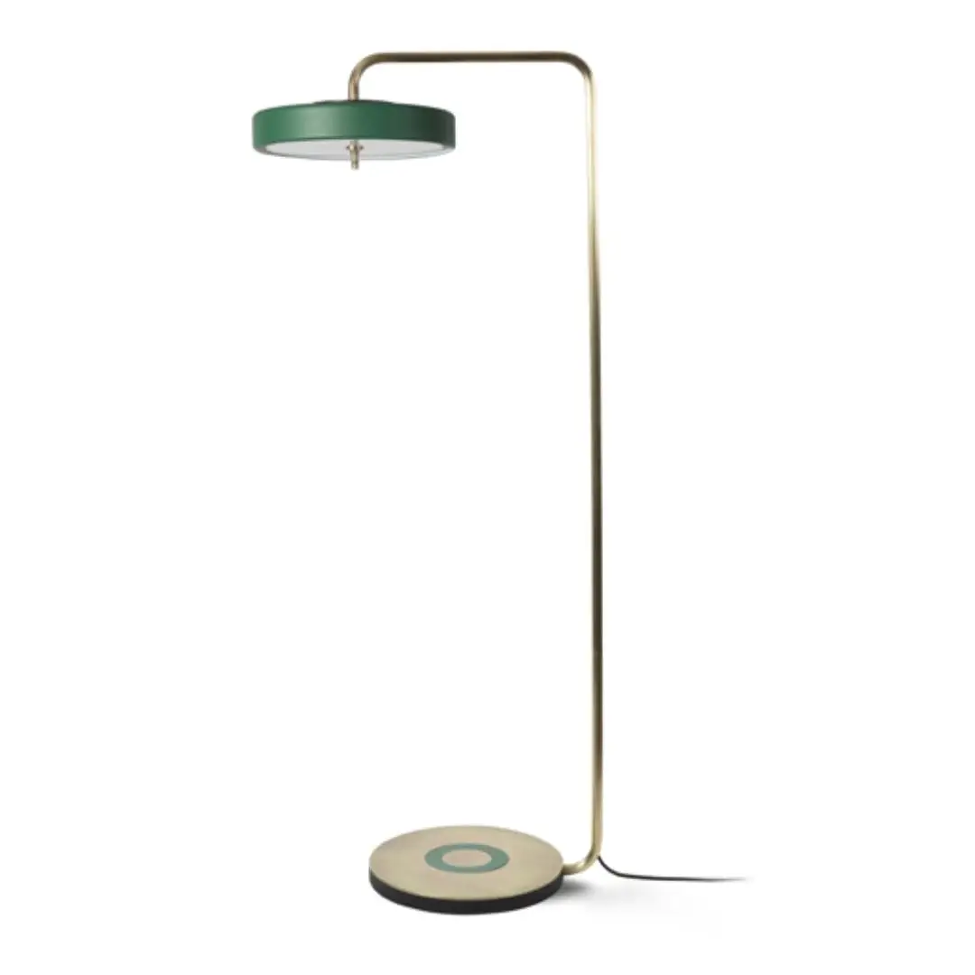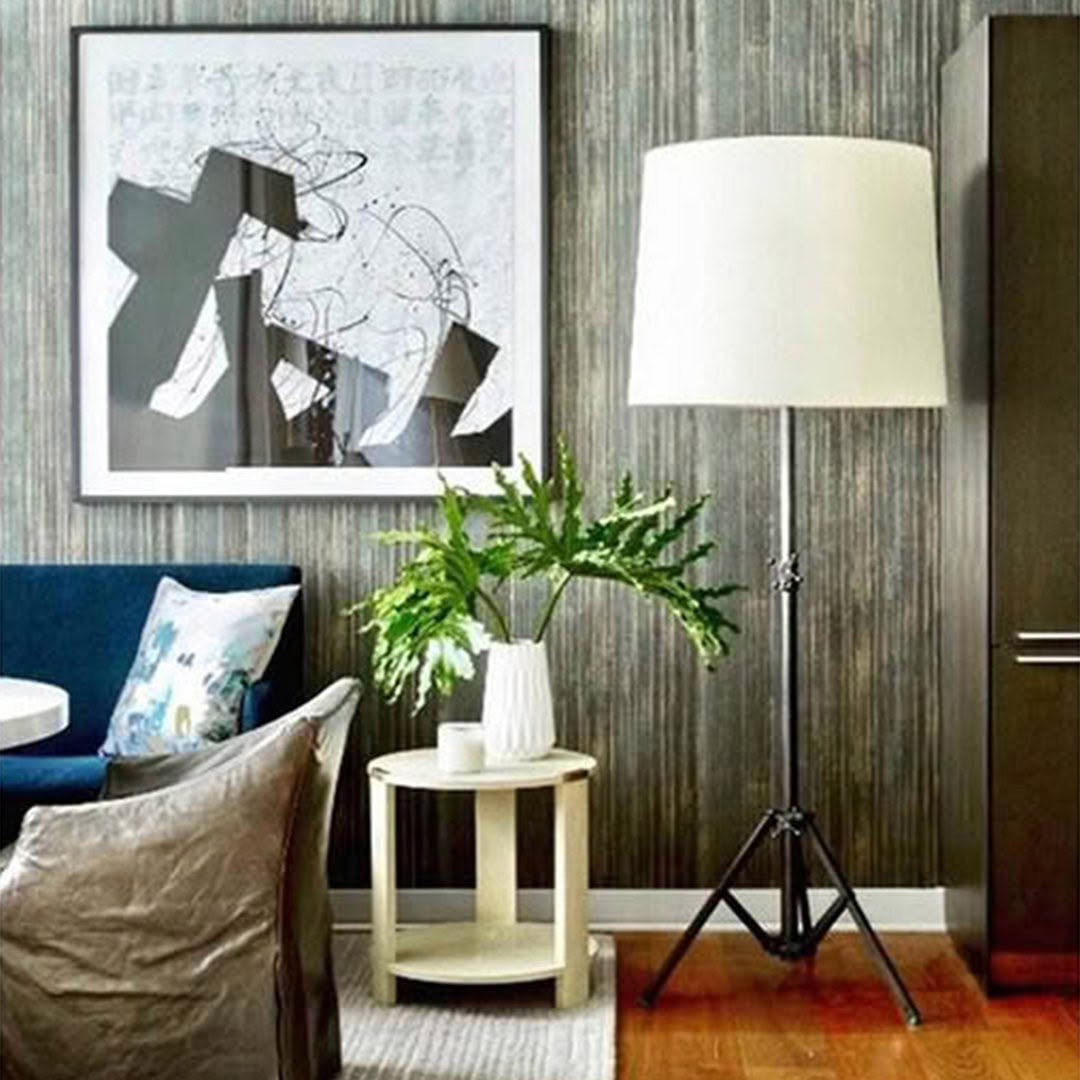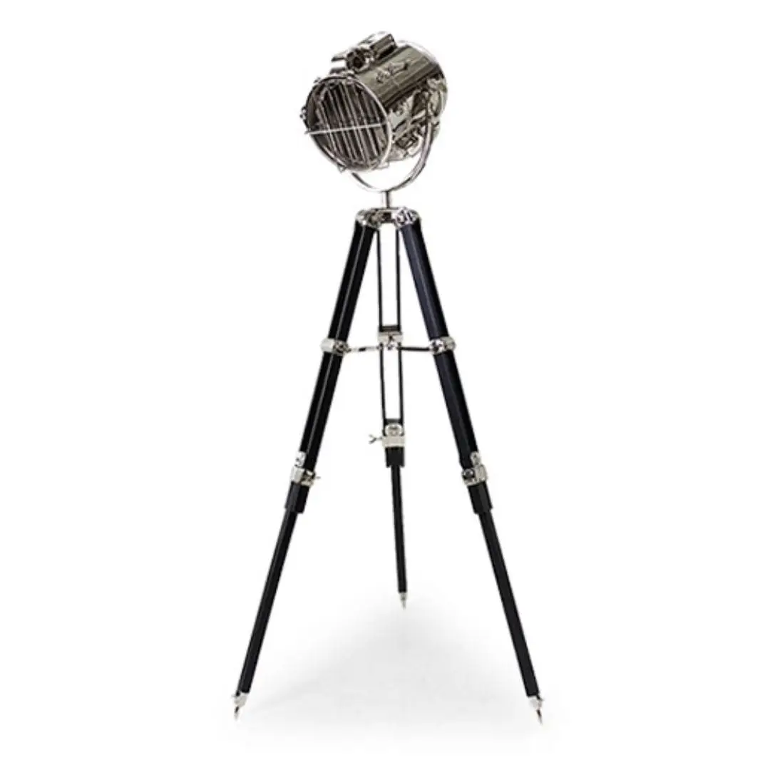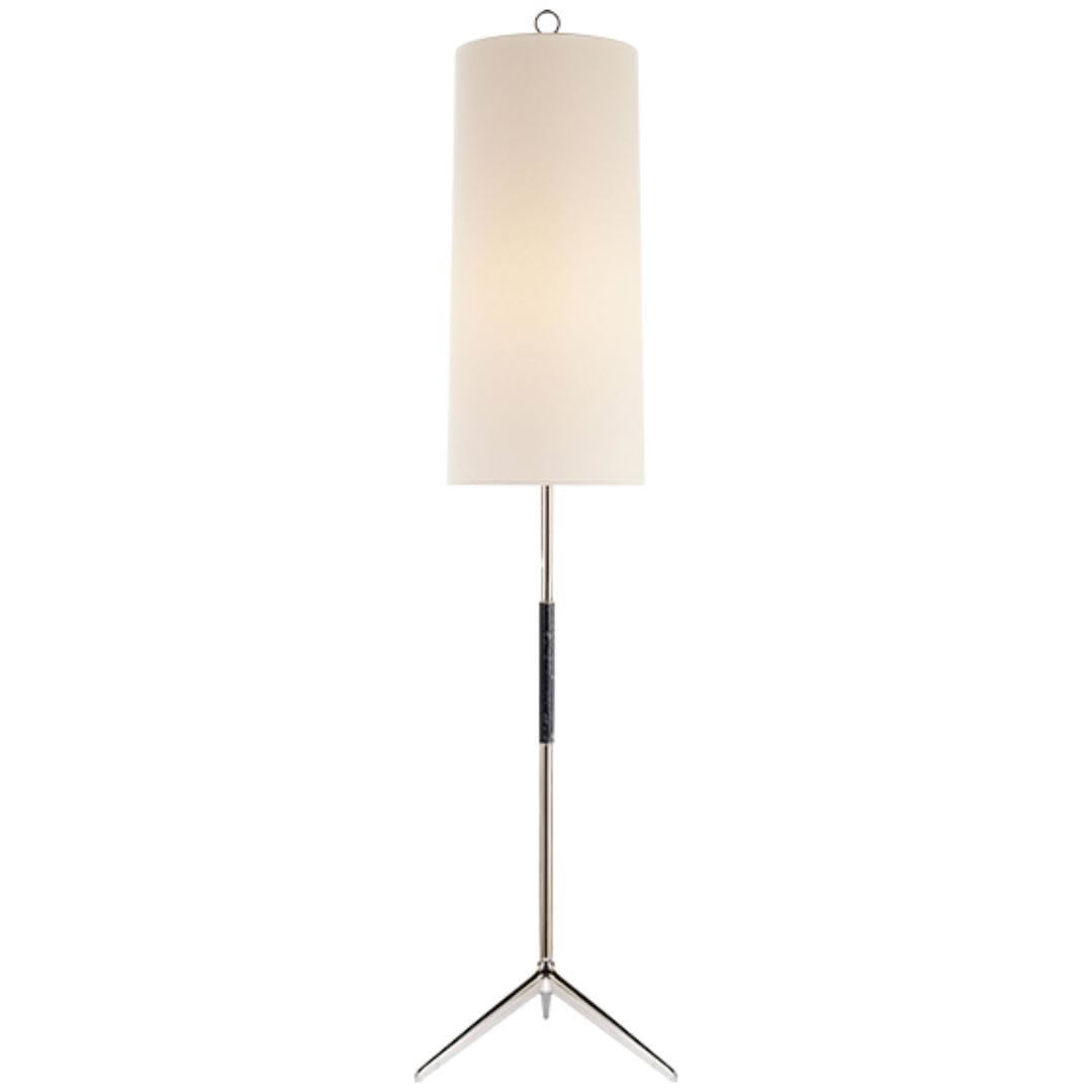 Modern tripod floor lamp with beige lampshadeElegant living room with green coffee table and art