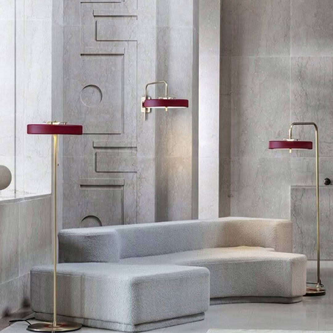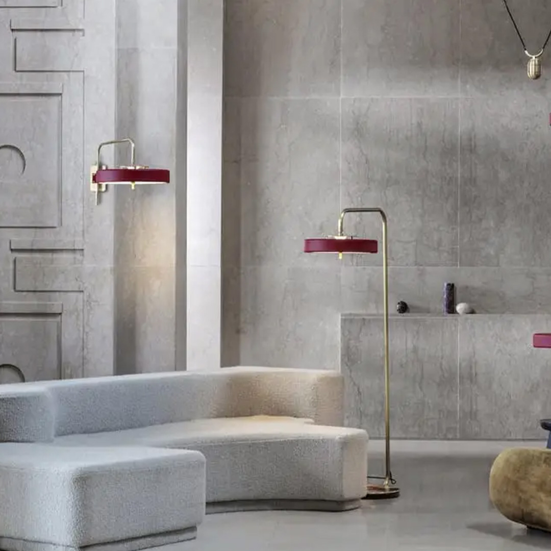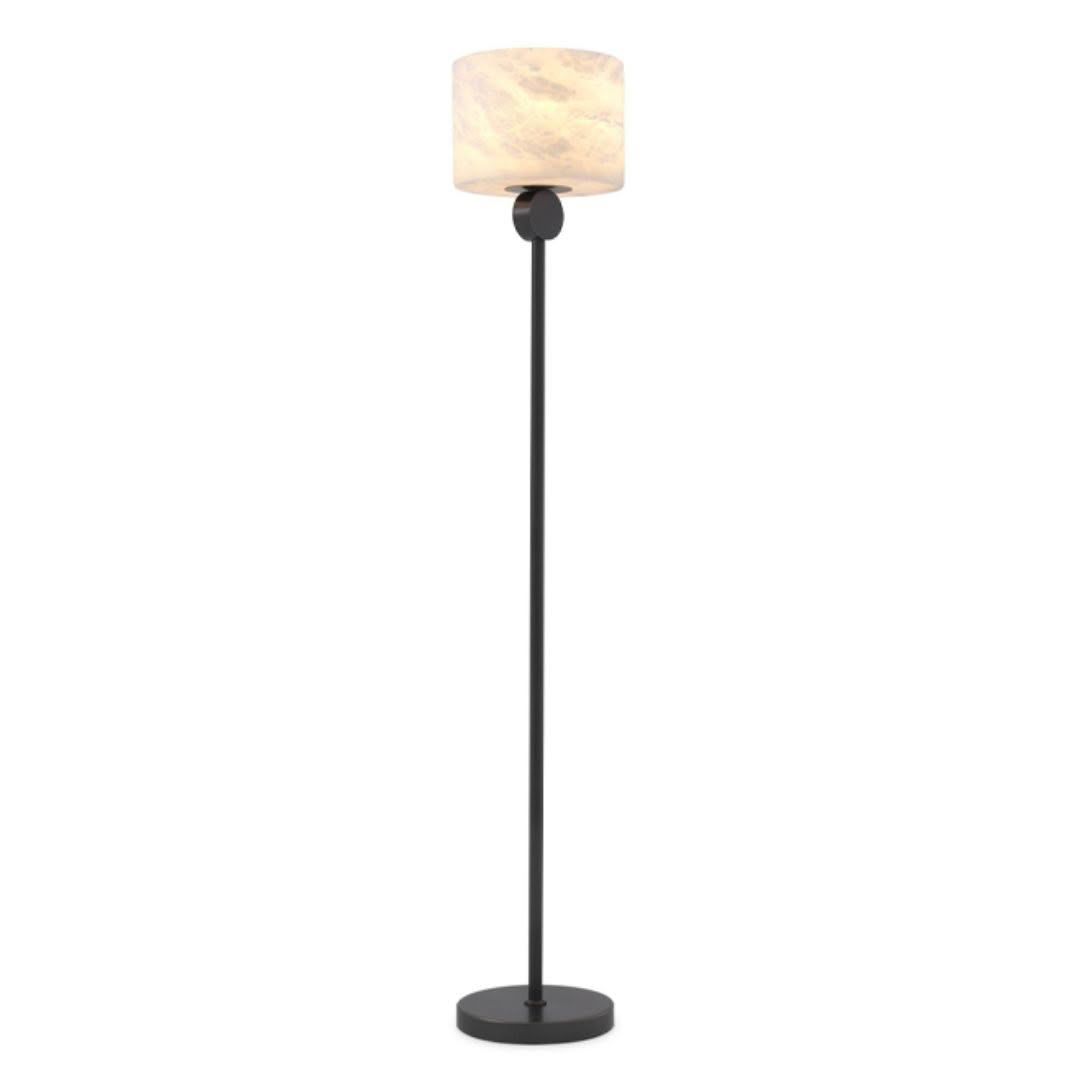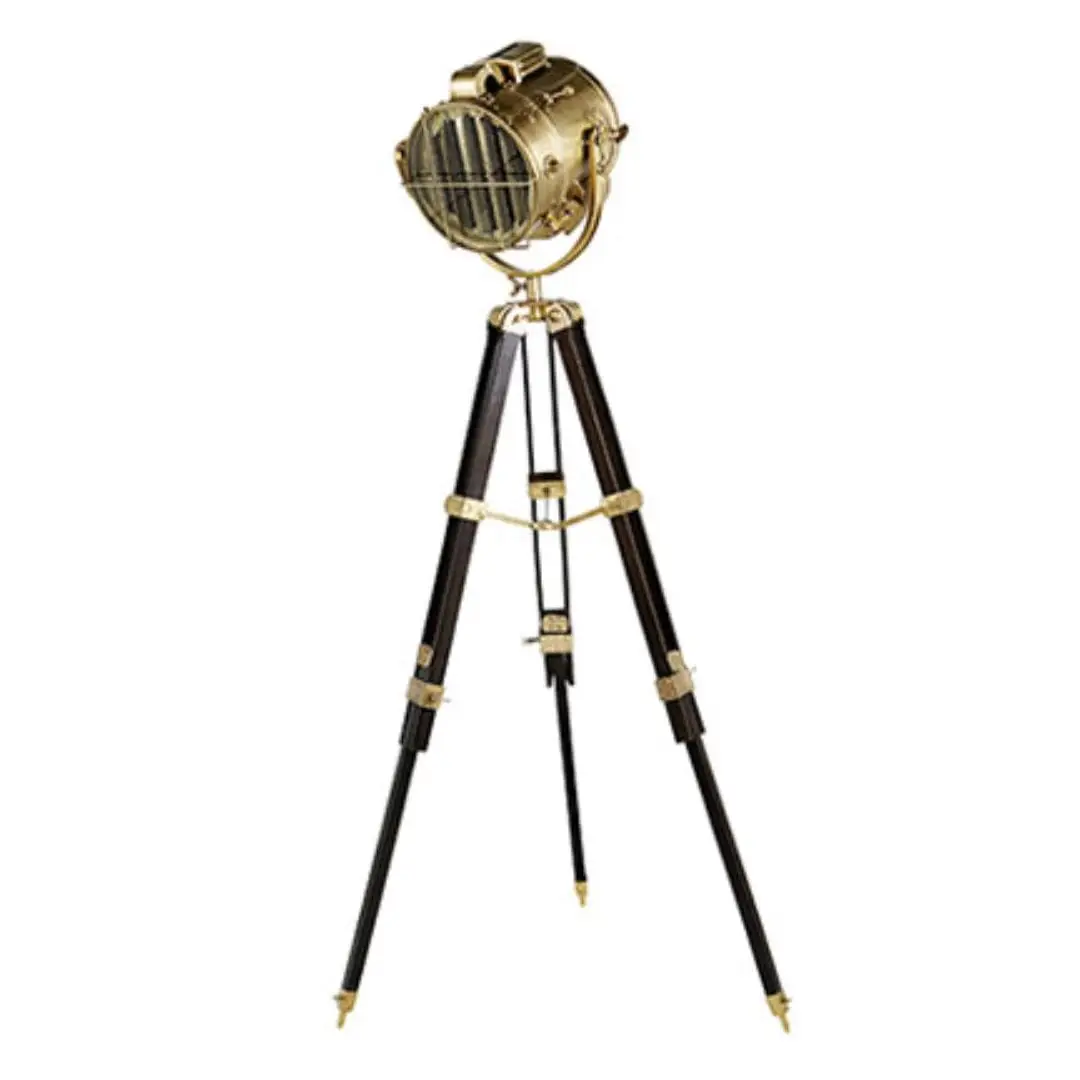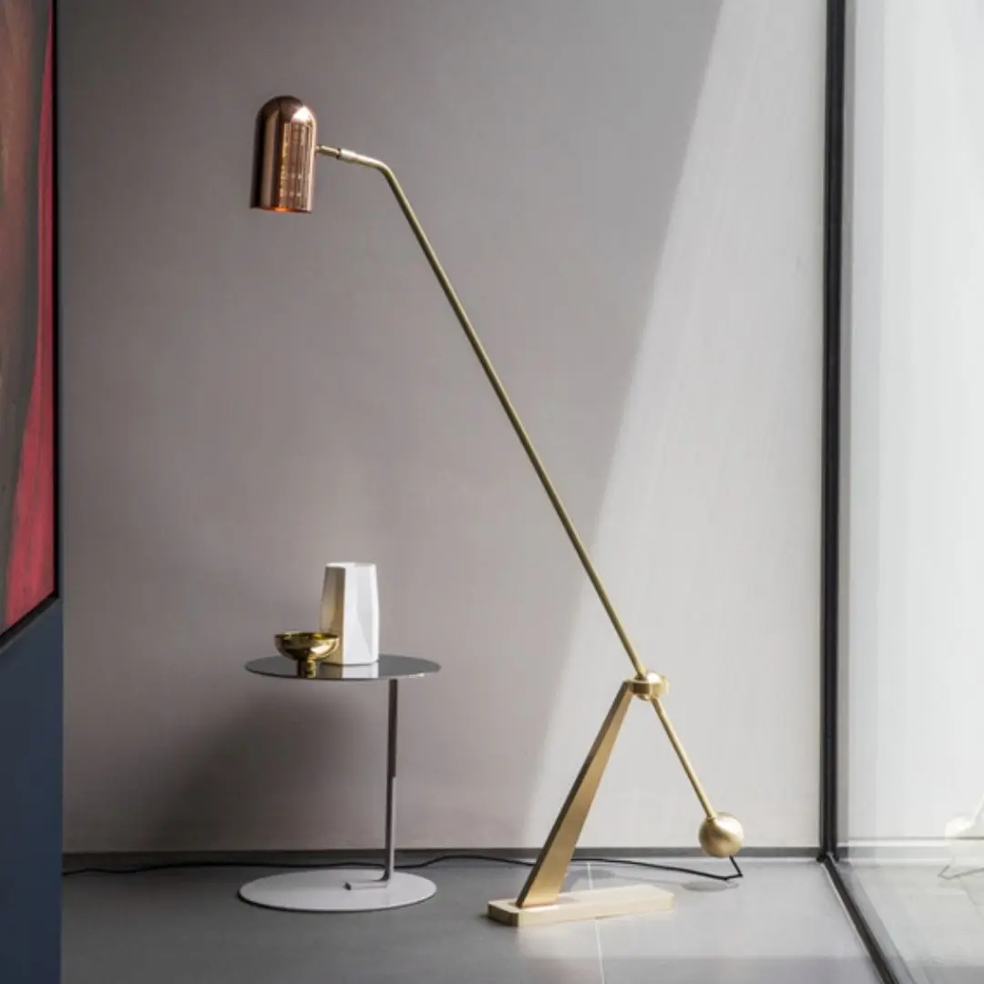 Modern tripod floor lamp with beige lampshadeElegant living room with green coffee table and art