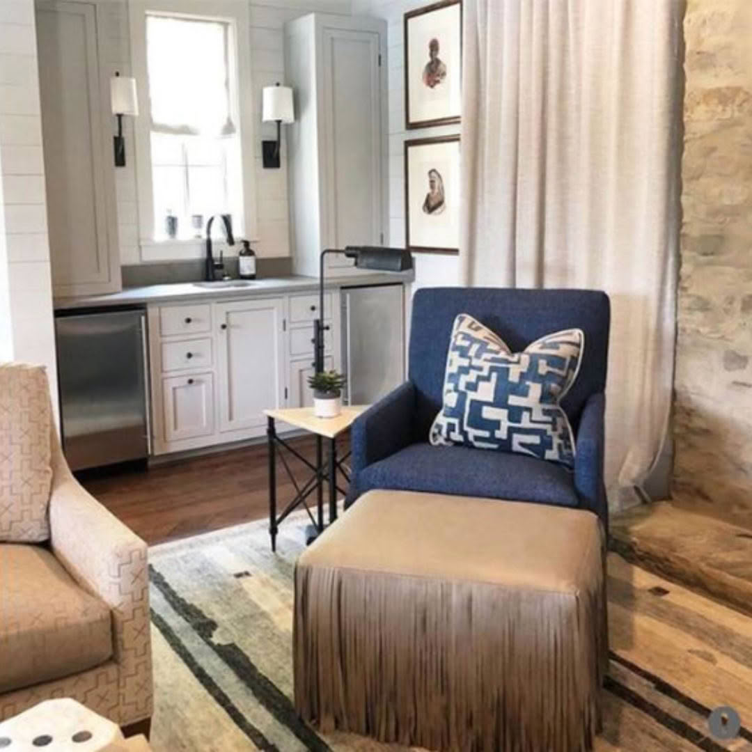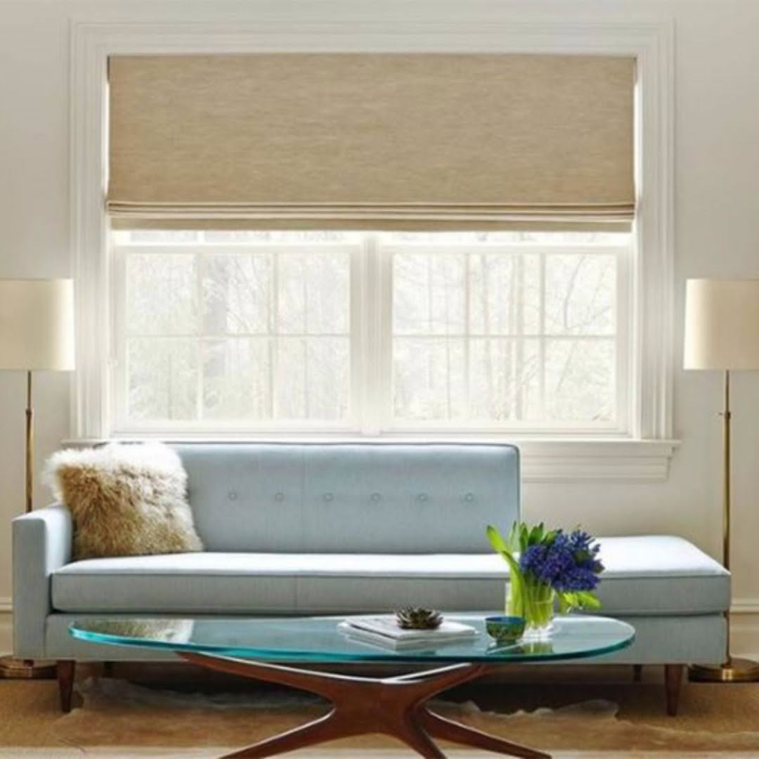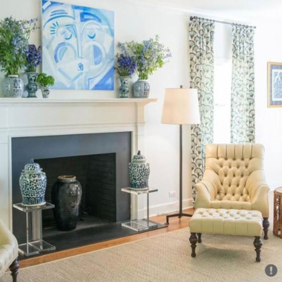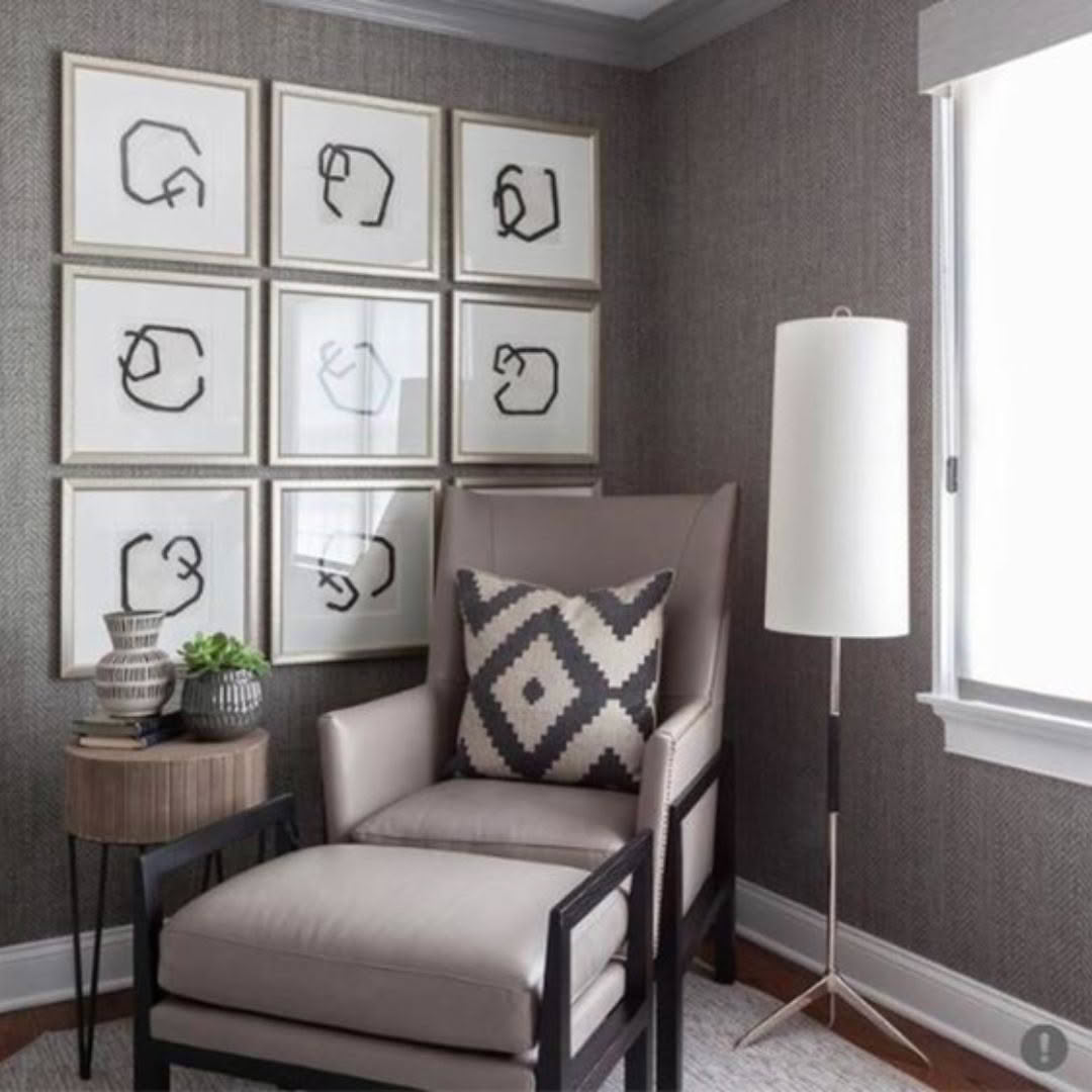 Modern tripod floor lamp with beige lampshadeElegant living room with green coffee table and art