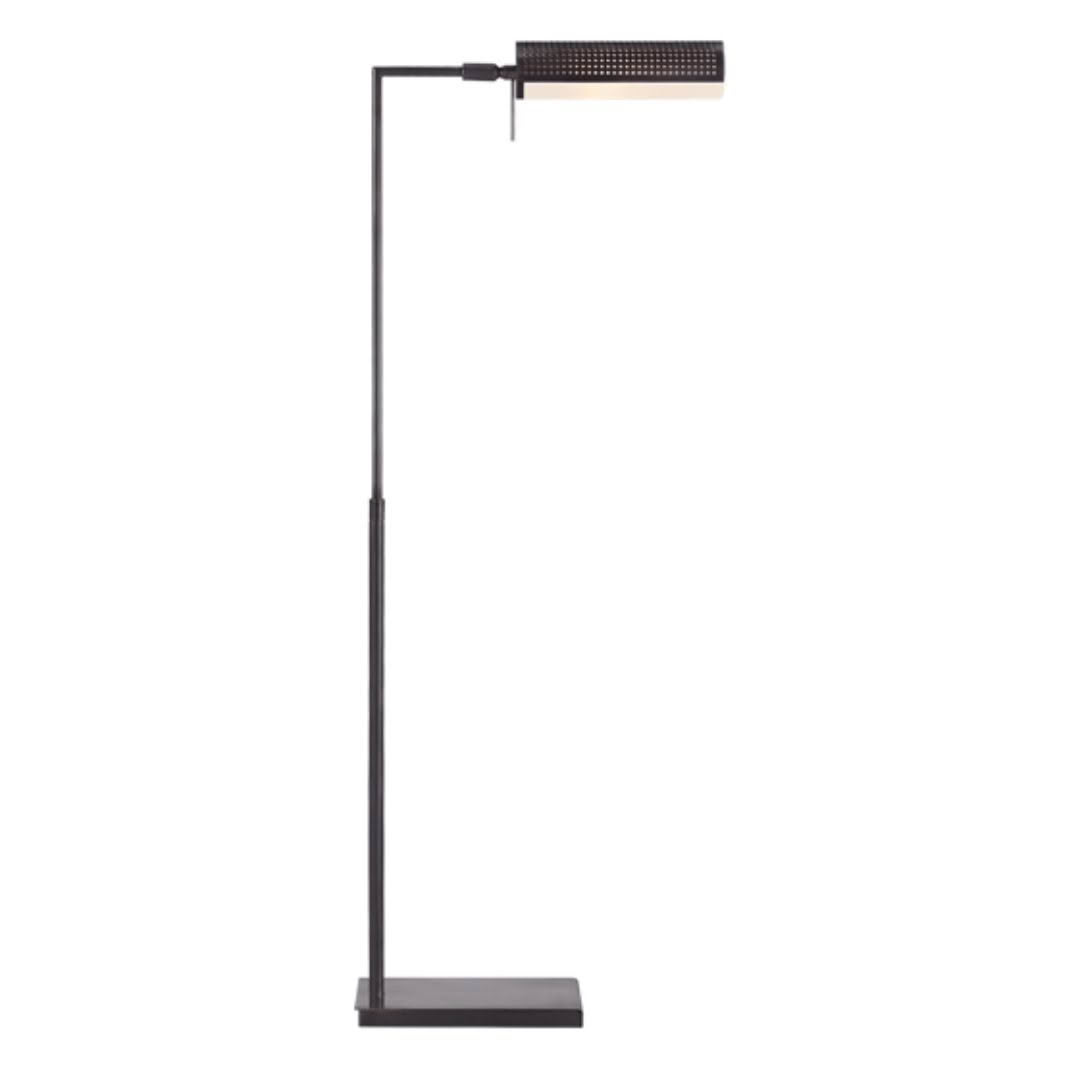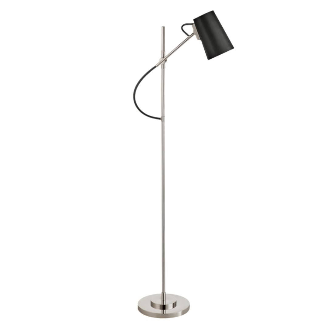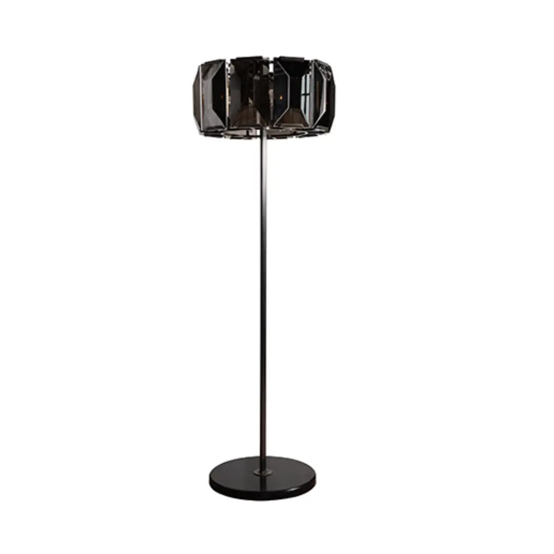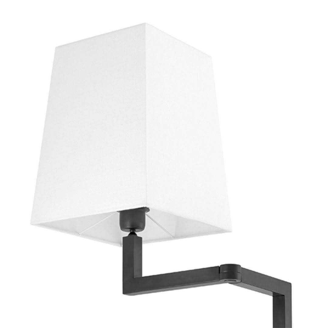 Tall black floor lamp with geometric design and beige shadeTall black floor lamp with geometric base and beige shade