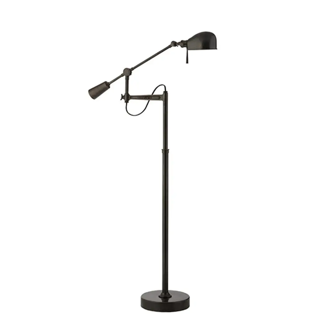 Modern adjustable black floor spotlight on standElegant vintage chair in richly decorated room