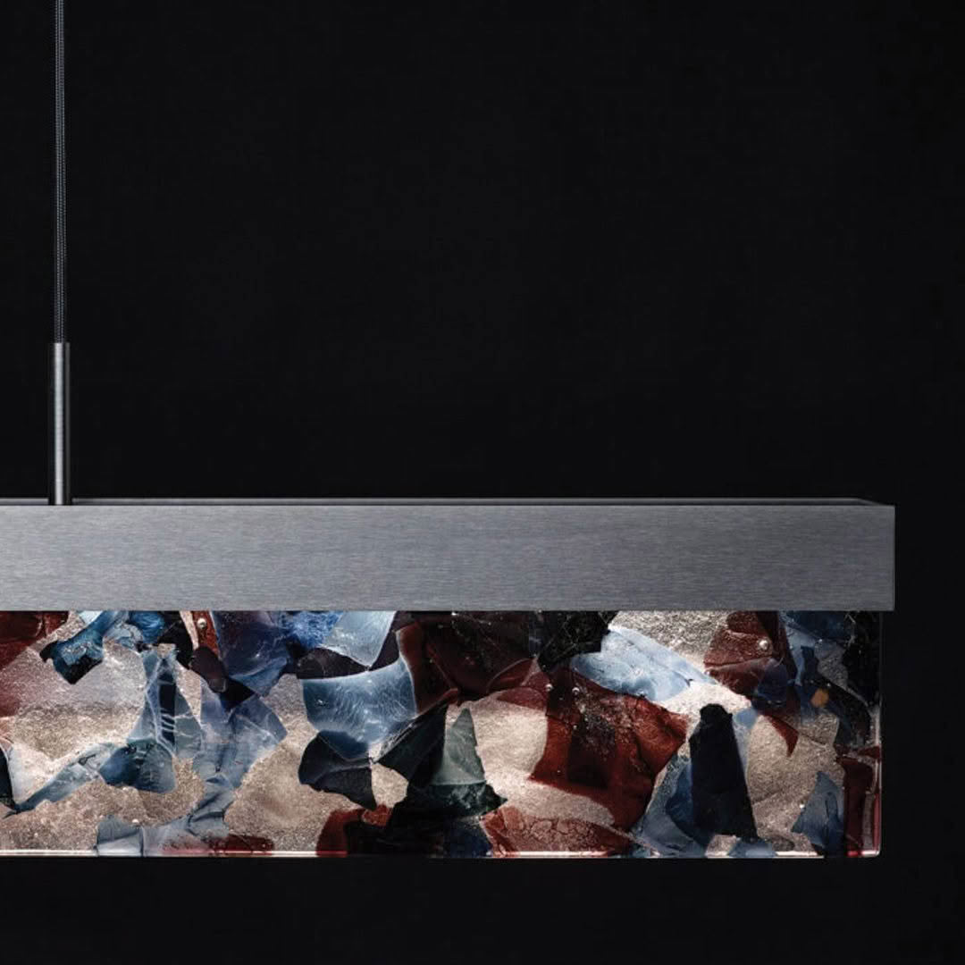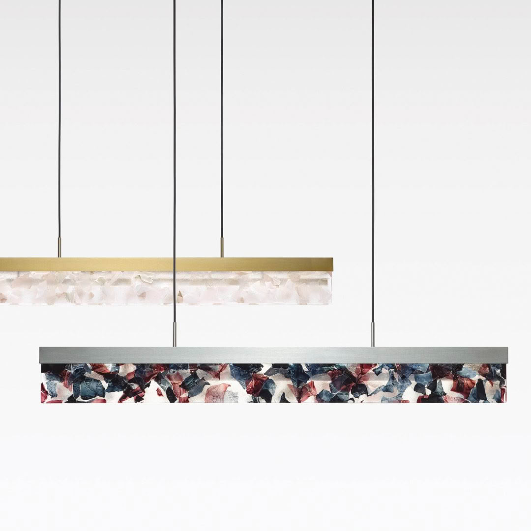 Fragment Line captures the dialogue between light and nature, where melted shards drift like clouds over horizons. The collection uses the recently developed Fragmentglass technique, based on fusing upcycled glass shards. This technology was developed for BOMMA by the designers at Studio DECHEM. This time, multicolored pieces of glass are combined into long, uniform panels that form the shade of the pendant light. The diversity of these fragments enables a fascinating play of light refraction.
