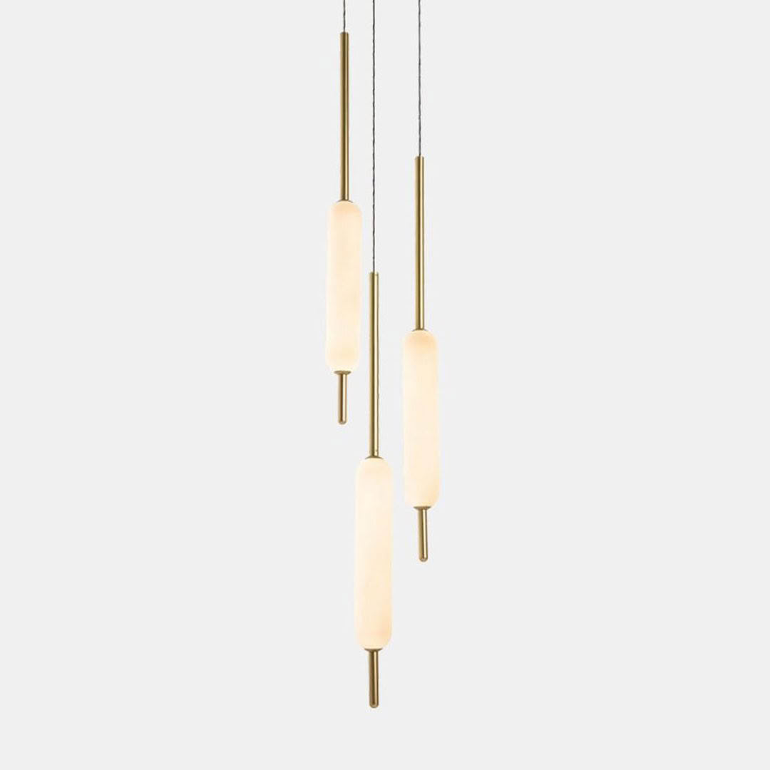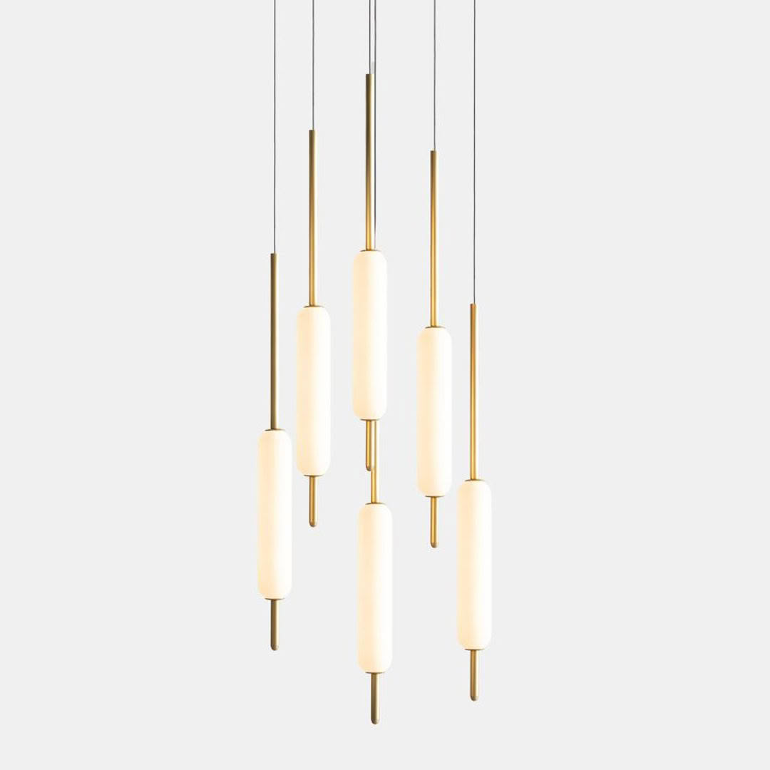 The shape of the light module is inspired by the Typha Latifolia, the botanical name of this beautiful spiky water plant. Each natural brass stem blooms in a LED light enclosed by tubular glass. Depending on the desired effect and the space to decorate, it is possible to choose from pendant lamps with one, three or six lights, wall lamp or floor lamp.