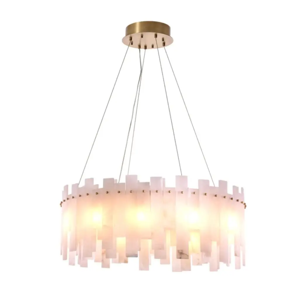 Elegant chandelier with multiple hanging translucent corn shapesElegant dining room with chandelier and round wooden table