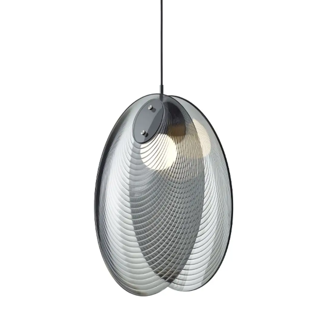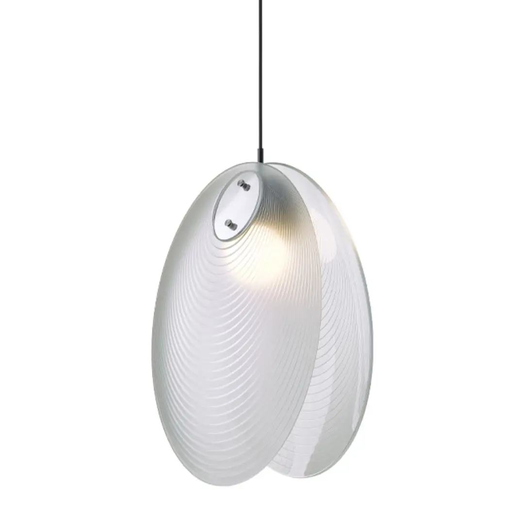 Elegant feather-designed hanging chandelier with warm glowClose-up of textured glass light fixture details
