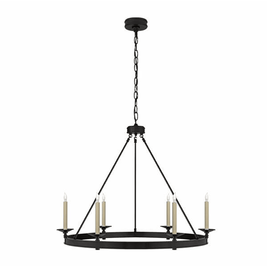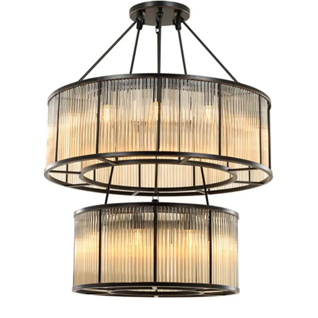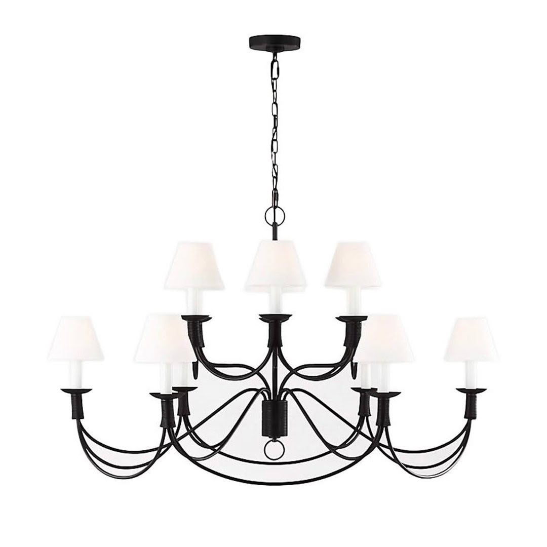 Ornate gold chandelier with black lampshades and lit bulbsOrnate gold chandelier with black shades and lit bulbs