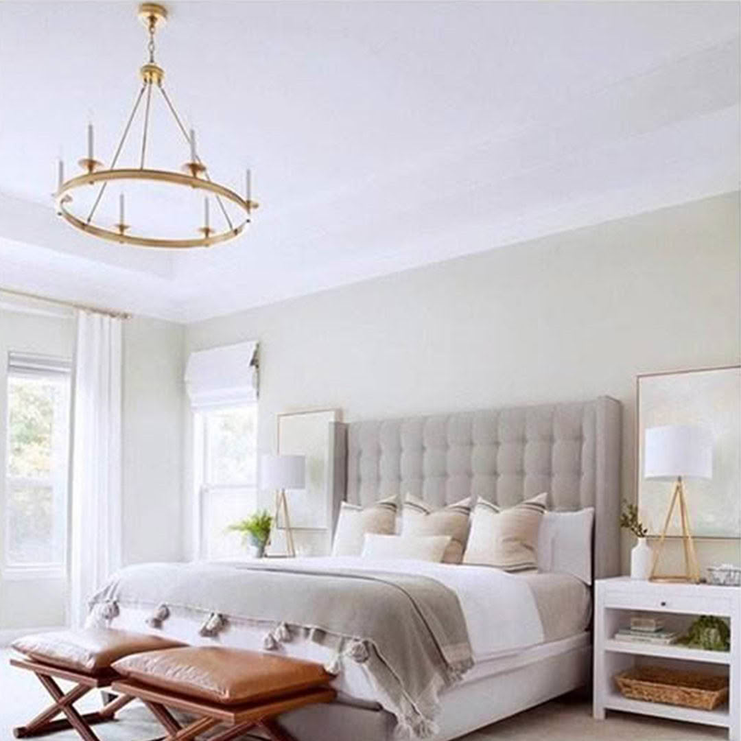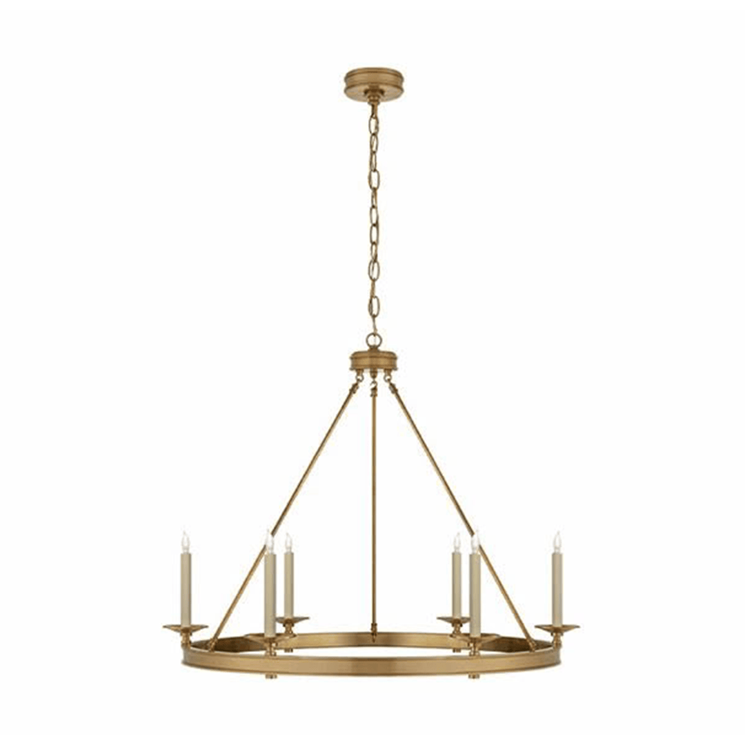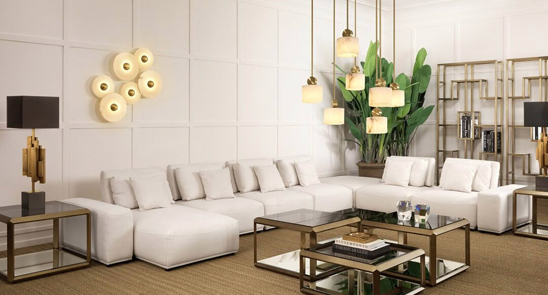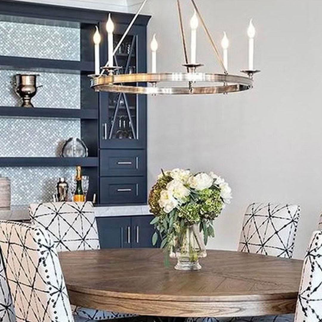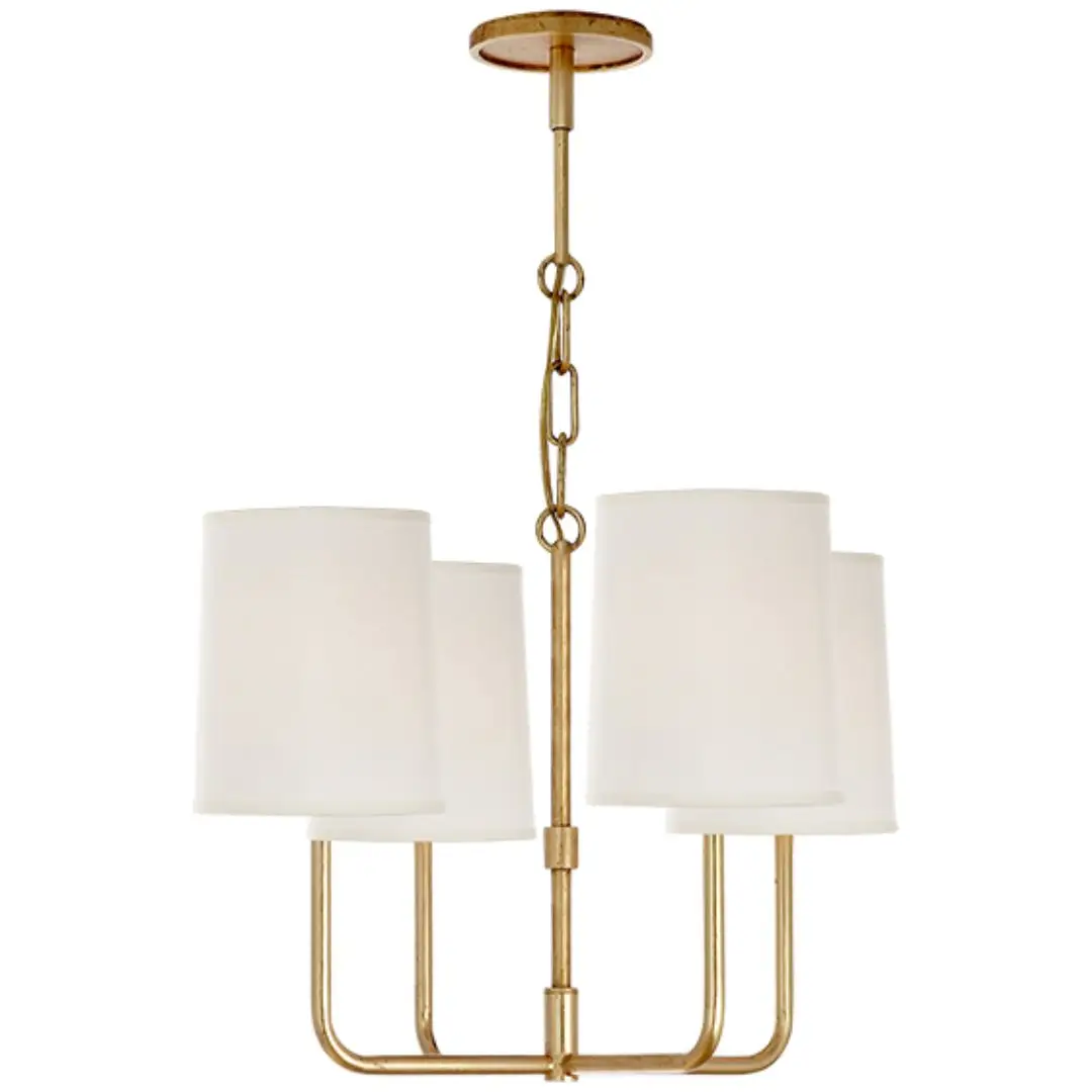 Gold starburst chandelier hanging against a white backgroundElegant home office with starburst chandelier and built-in shelves