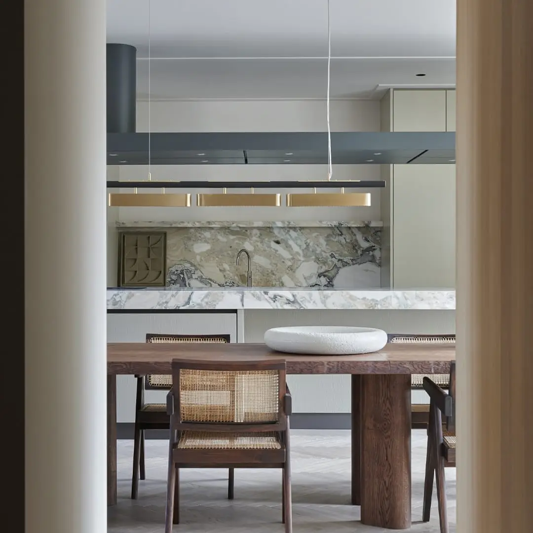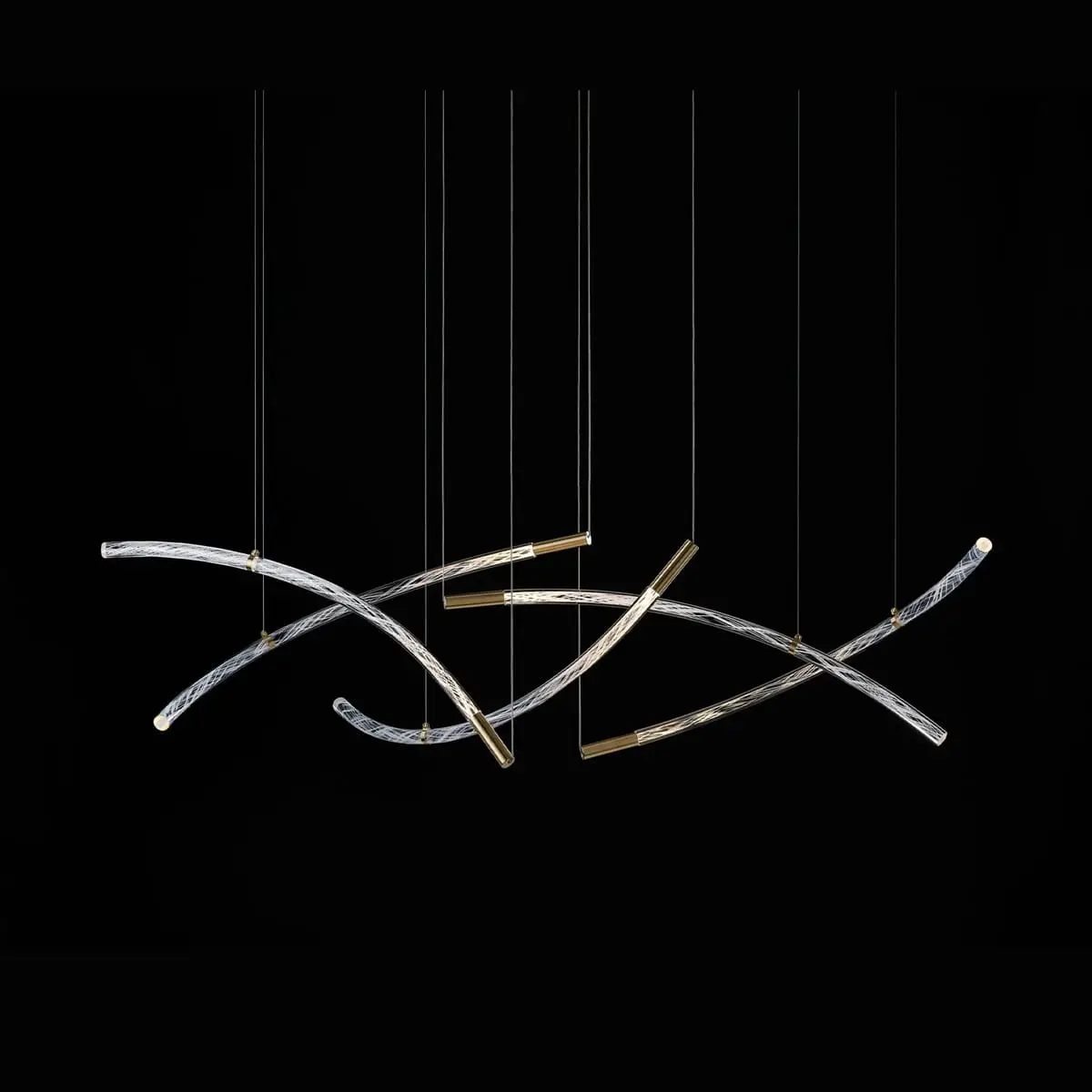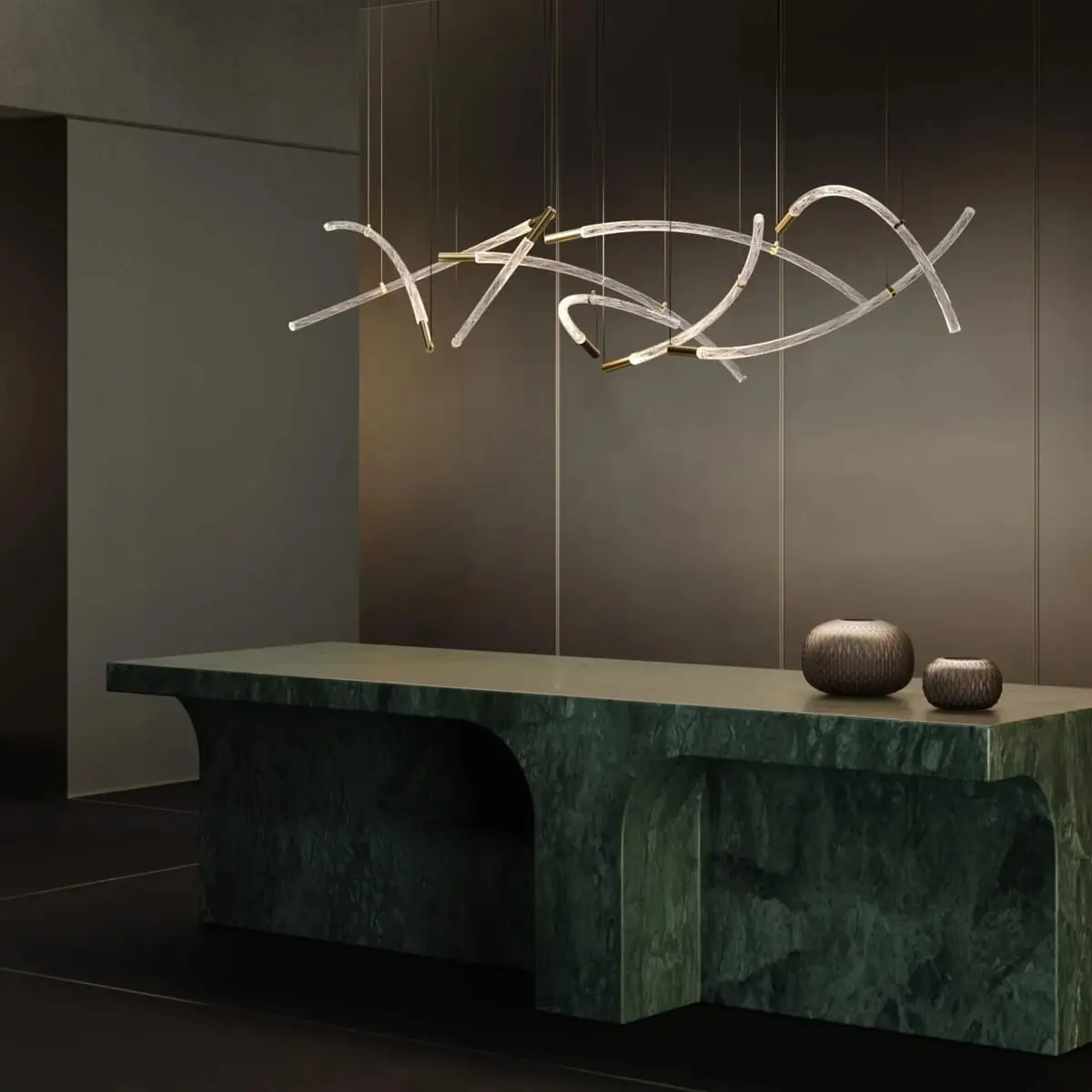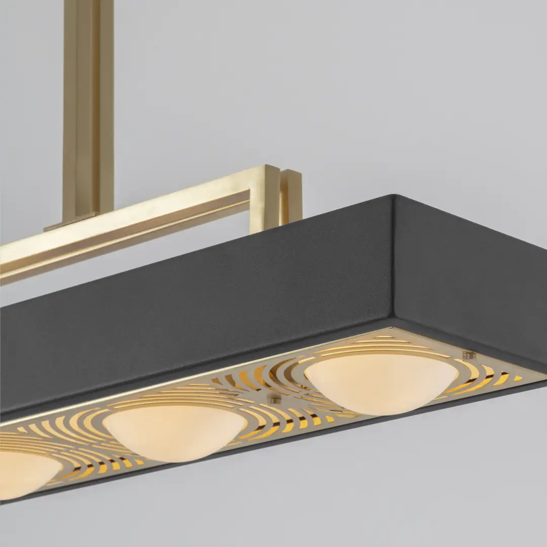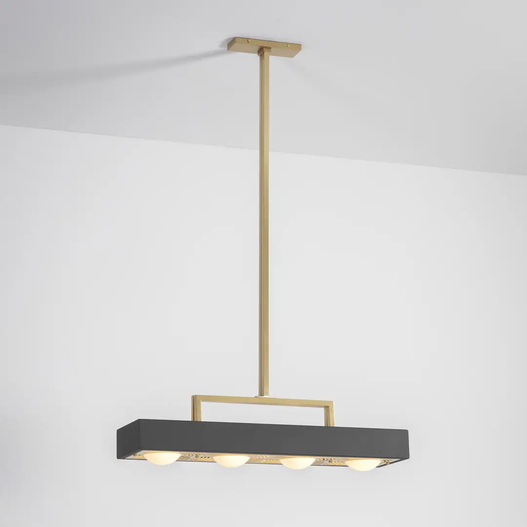 Modern linear suspension light with gold accentsElegant dark-toned bar with decorative chairs and lighting