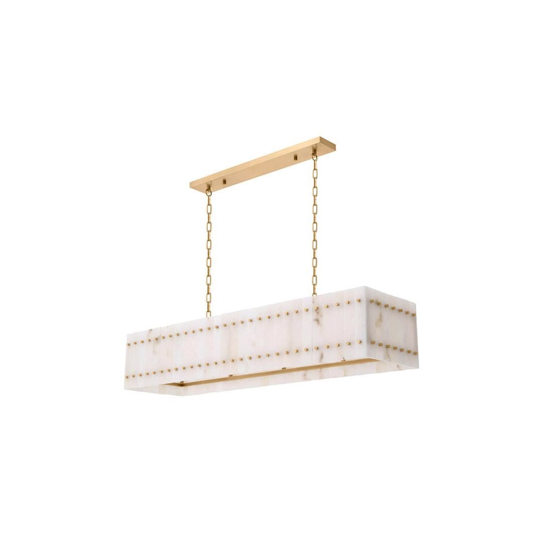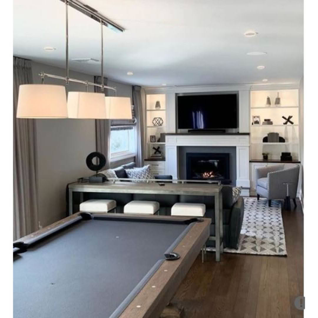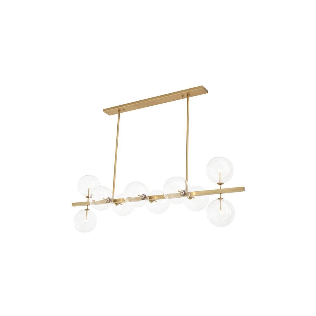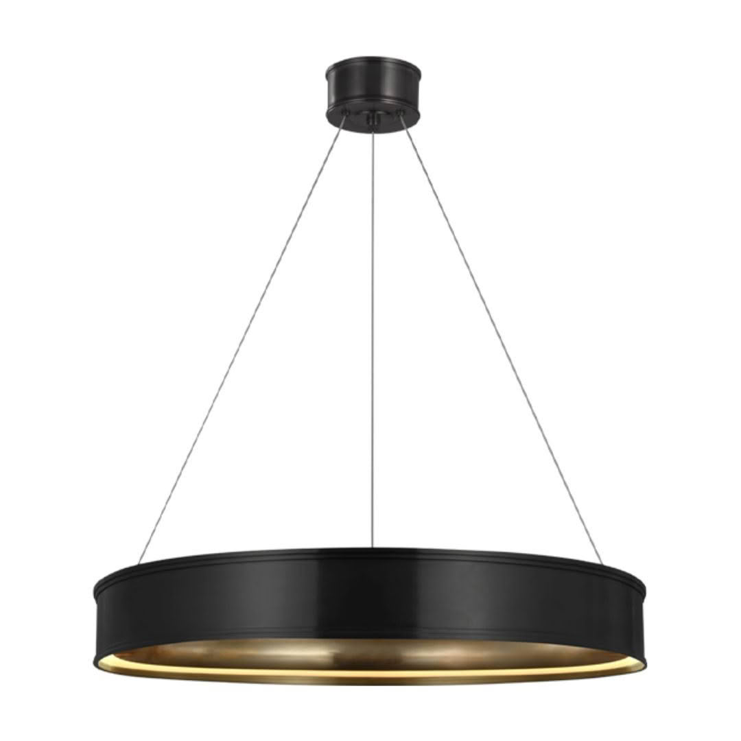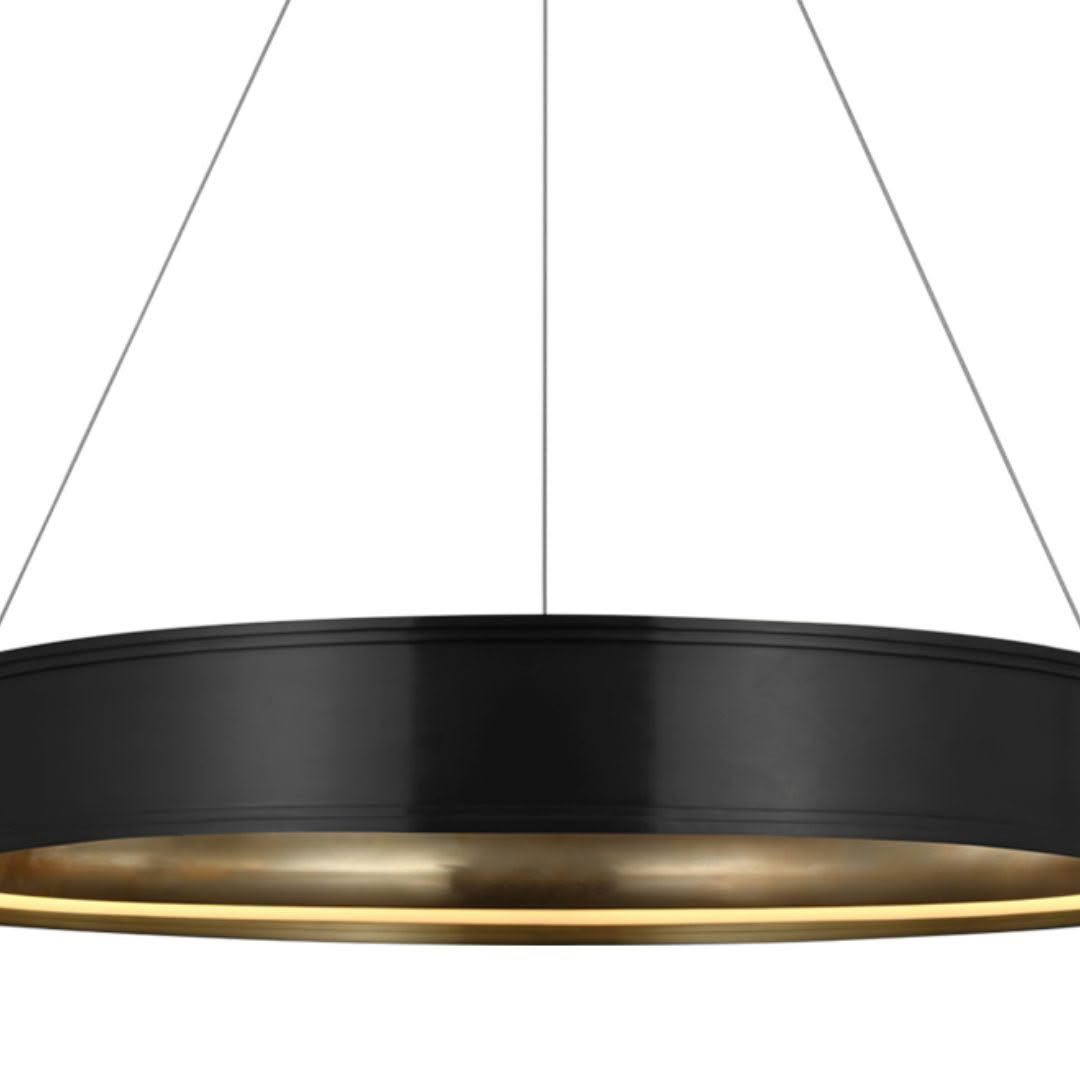 Modern linear suspension light with gold accentsElegant dark-toned bar with decorative chairs and lighting