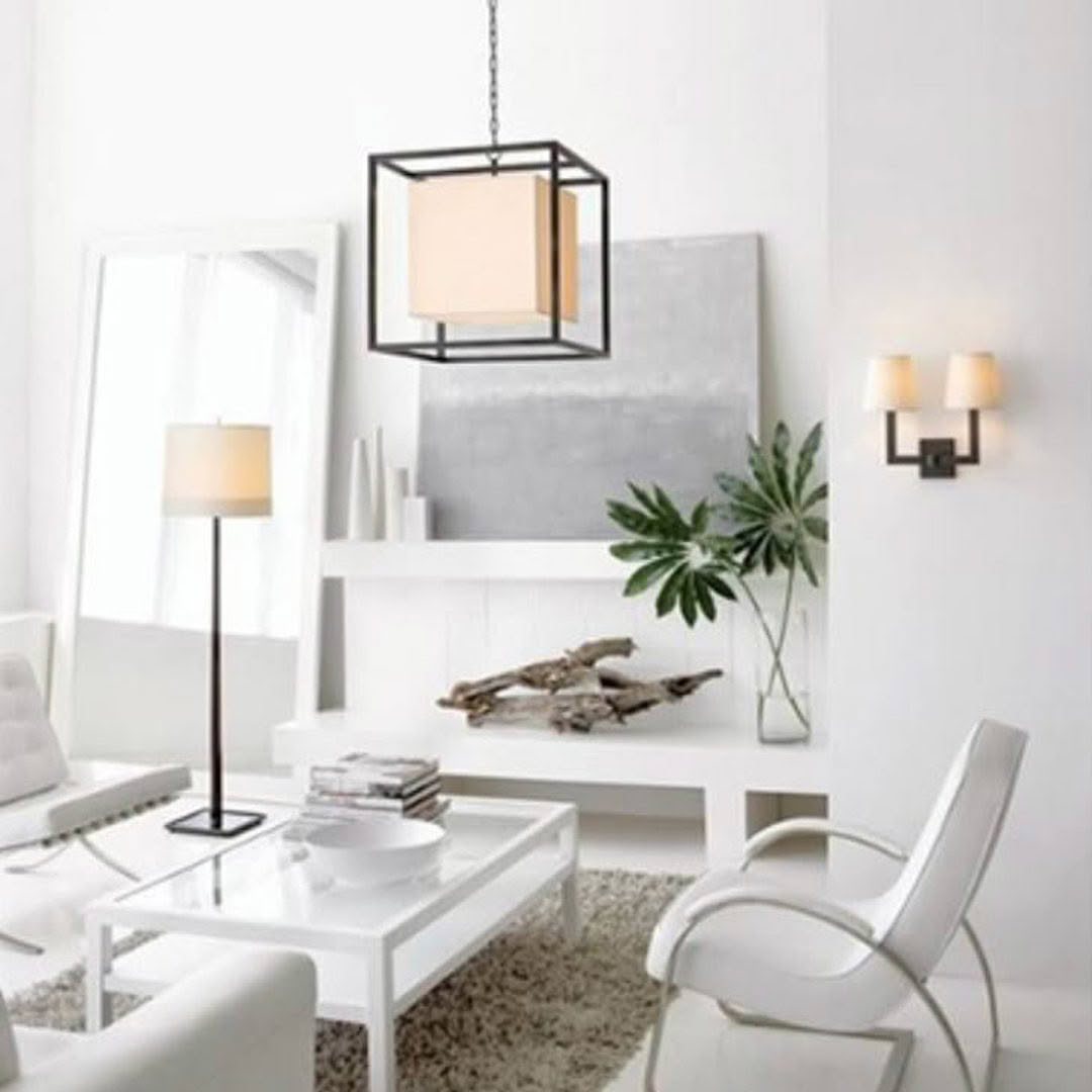 Modern chandelier with three white shades and chrome finishModern twin white lampshades on metal stand
