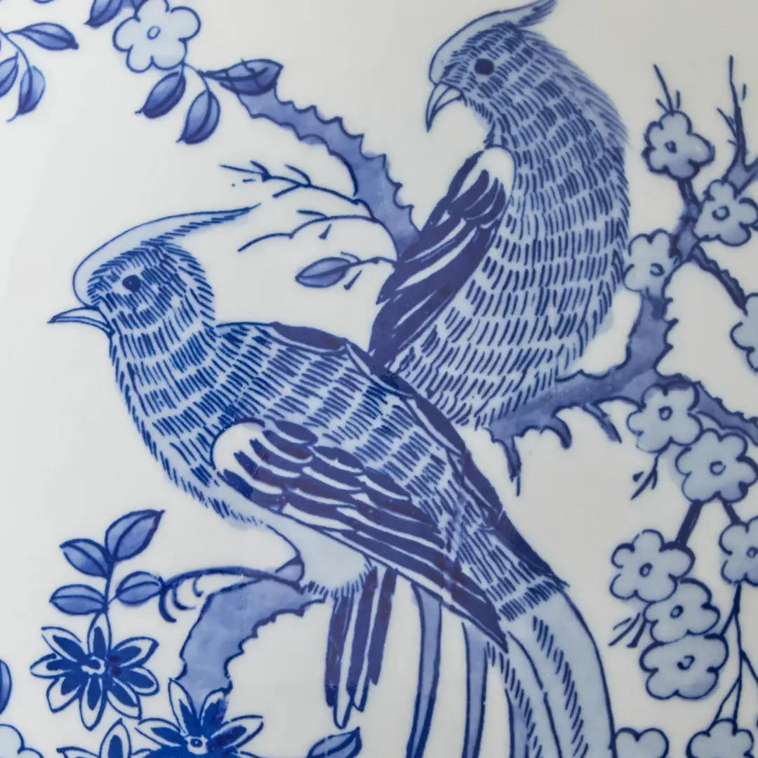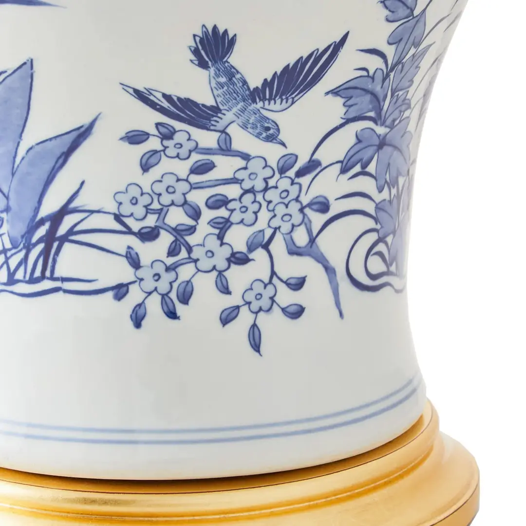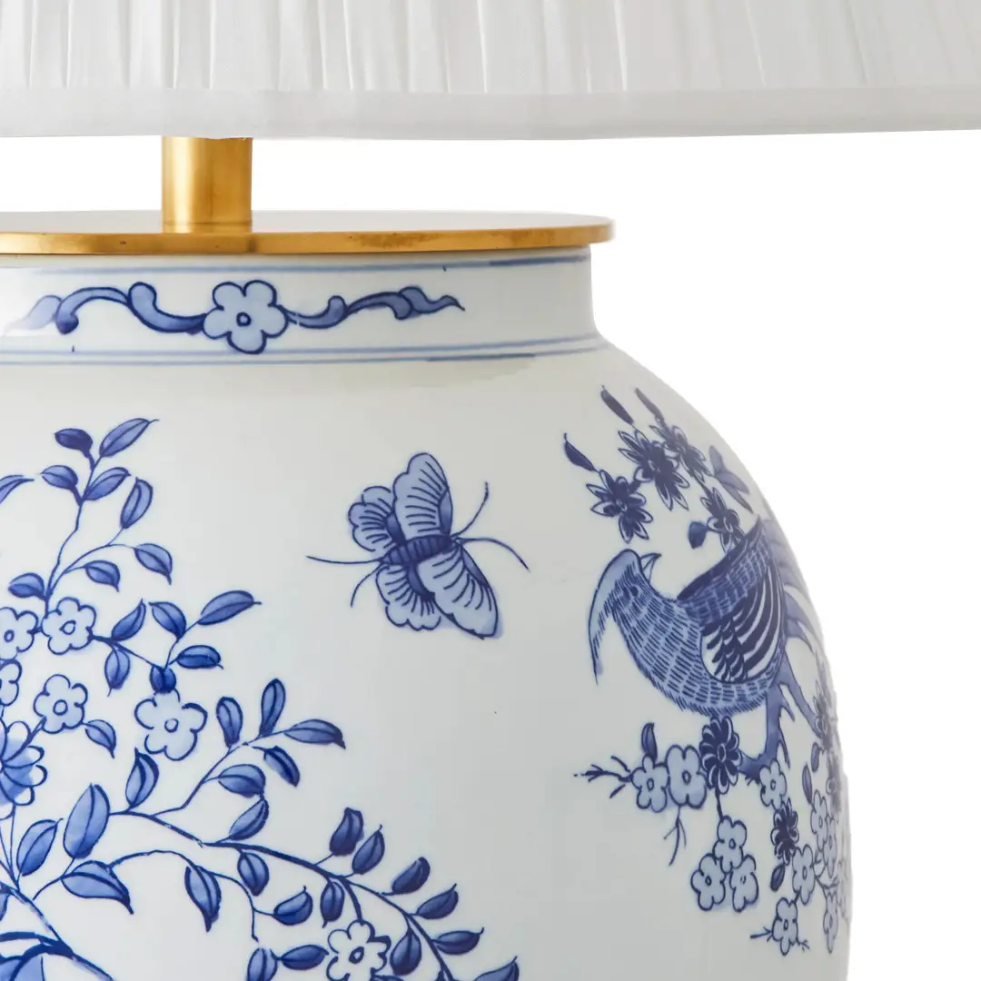 An exquisite painted motif sweeps across Ralph Lauren’s Blythe table lamp, depicting delicate florals and long-tailed birds in a classic blue-and-white palette. Expertly crafted from porcelain and enhanced by each brushstroke, the elegant curved form features solid brass details and is finished with a pleated silk shade.
