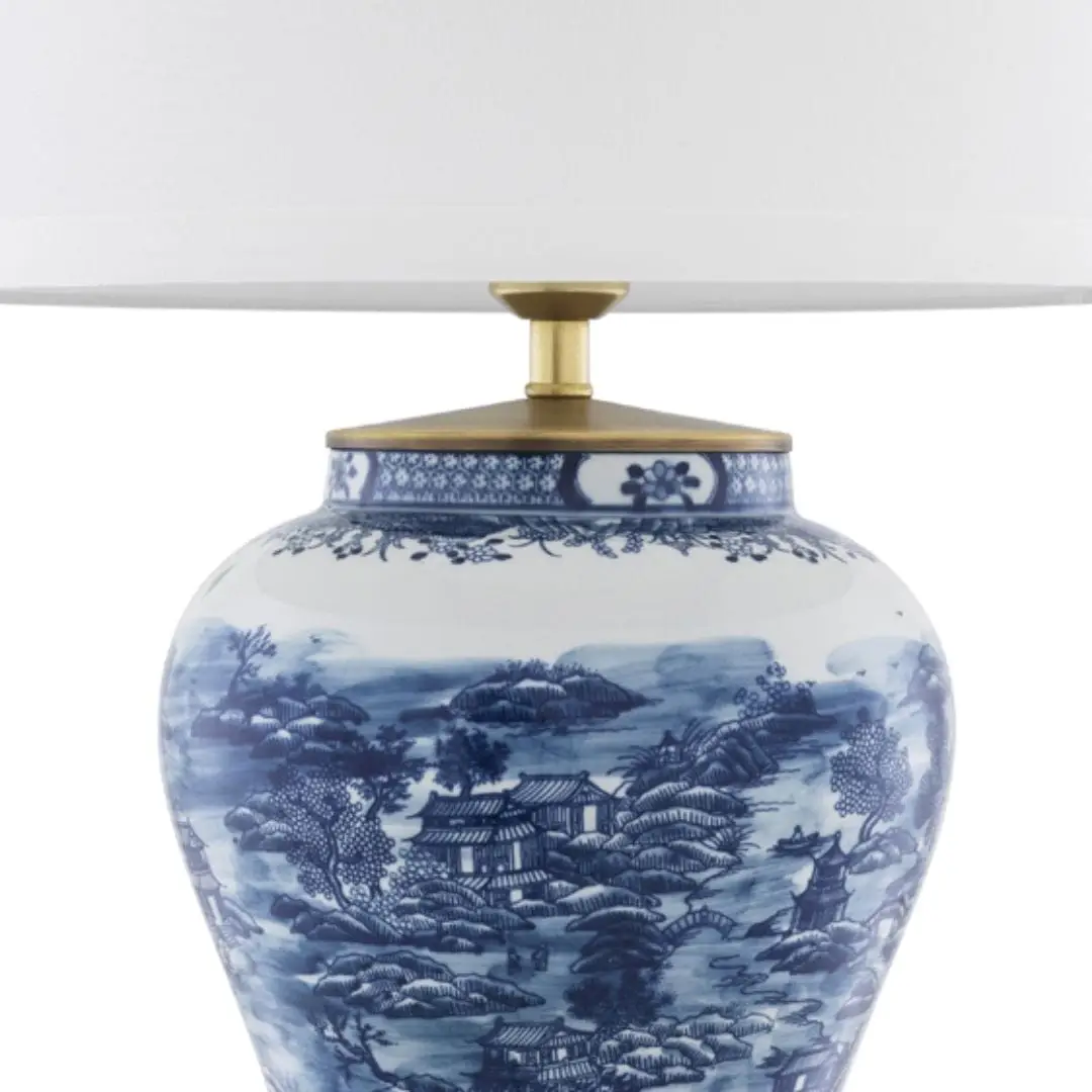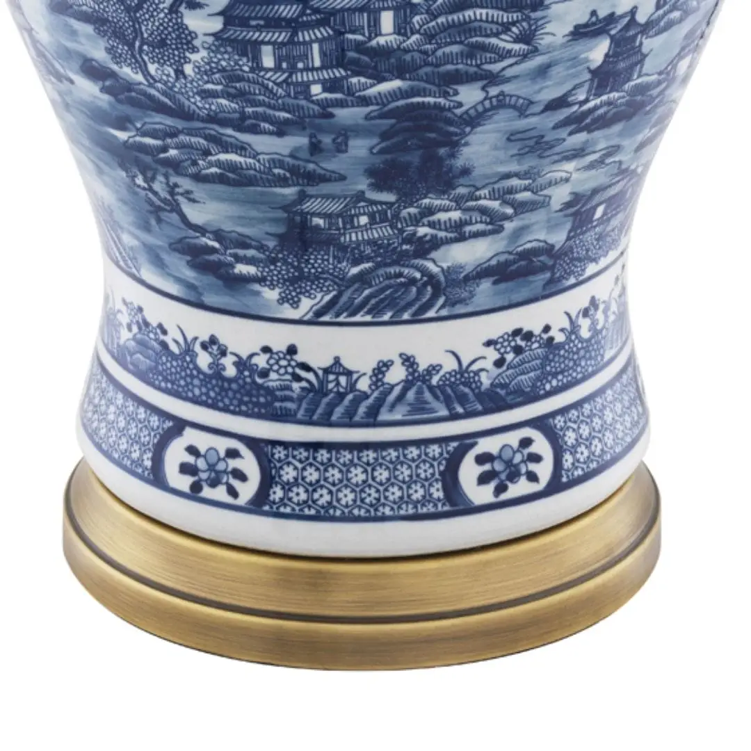 The traditional oriental Chinese Blue Table Lamp features an authentic Asian baluster vase body decorated with a finely detailed landscape in Ming blue and white. This alluring porcelain lamp has an antique brass finish lamp socket and base, and comes with a cream lampshade.