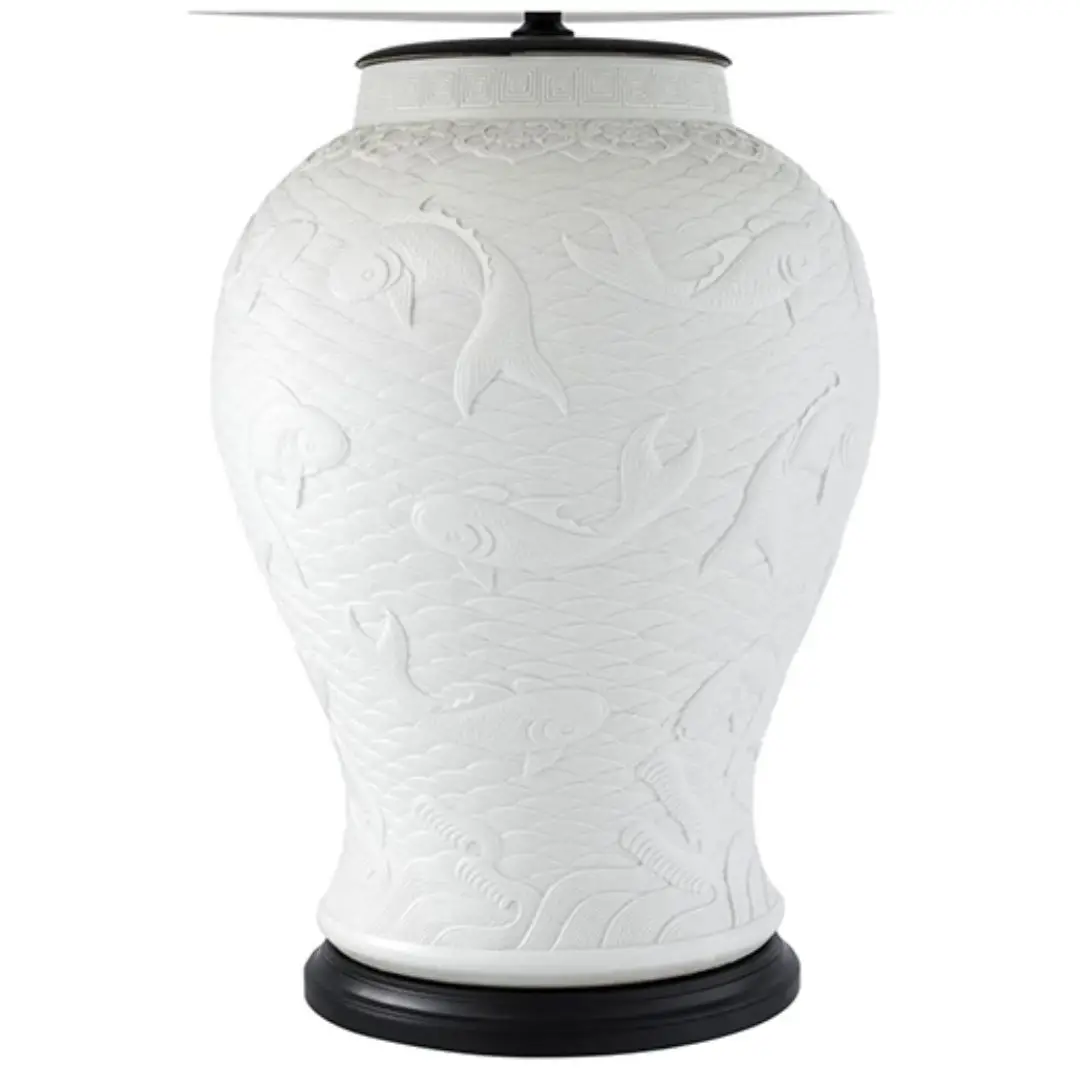 The white Dupoint Table Lamp is sure to be an eye-catcher in your home décor. This artisan made ceramic lamp base showcases a beautiful relief with Koi carp. It comes with an off-white fabric shade.