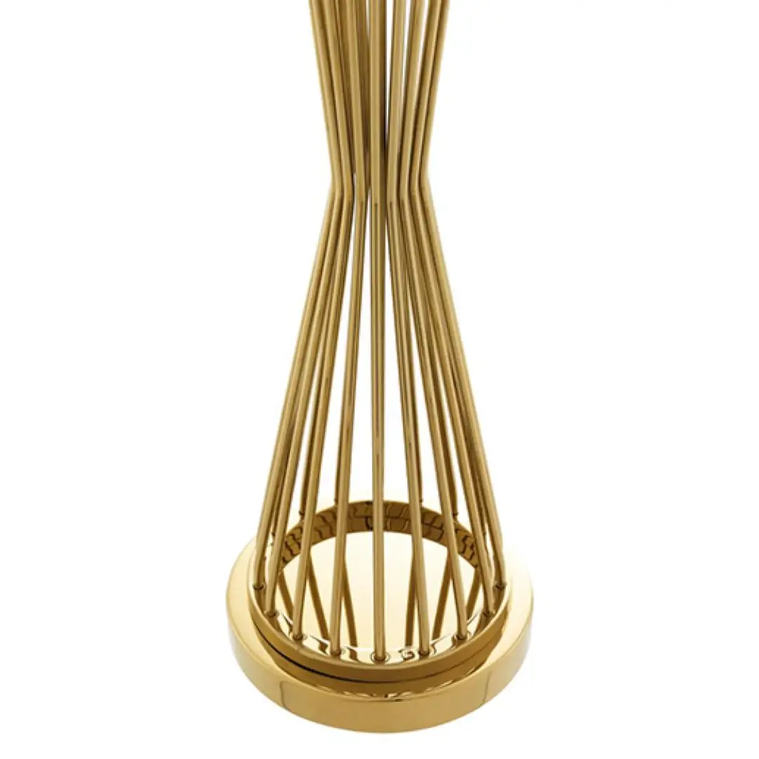 With its sleek hourglass shaped lamp base and structural lines, the Holmes Table Lamp is designed to stand out in style. The stainless steel open-work fixture features a gold finish and sports an off-white lampshade.