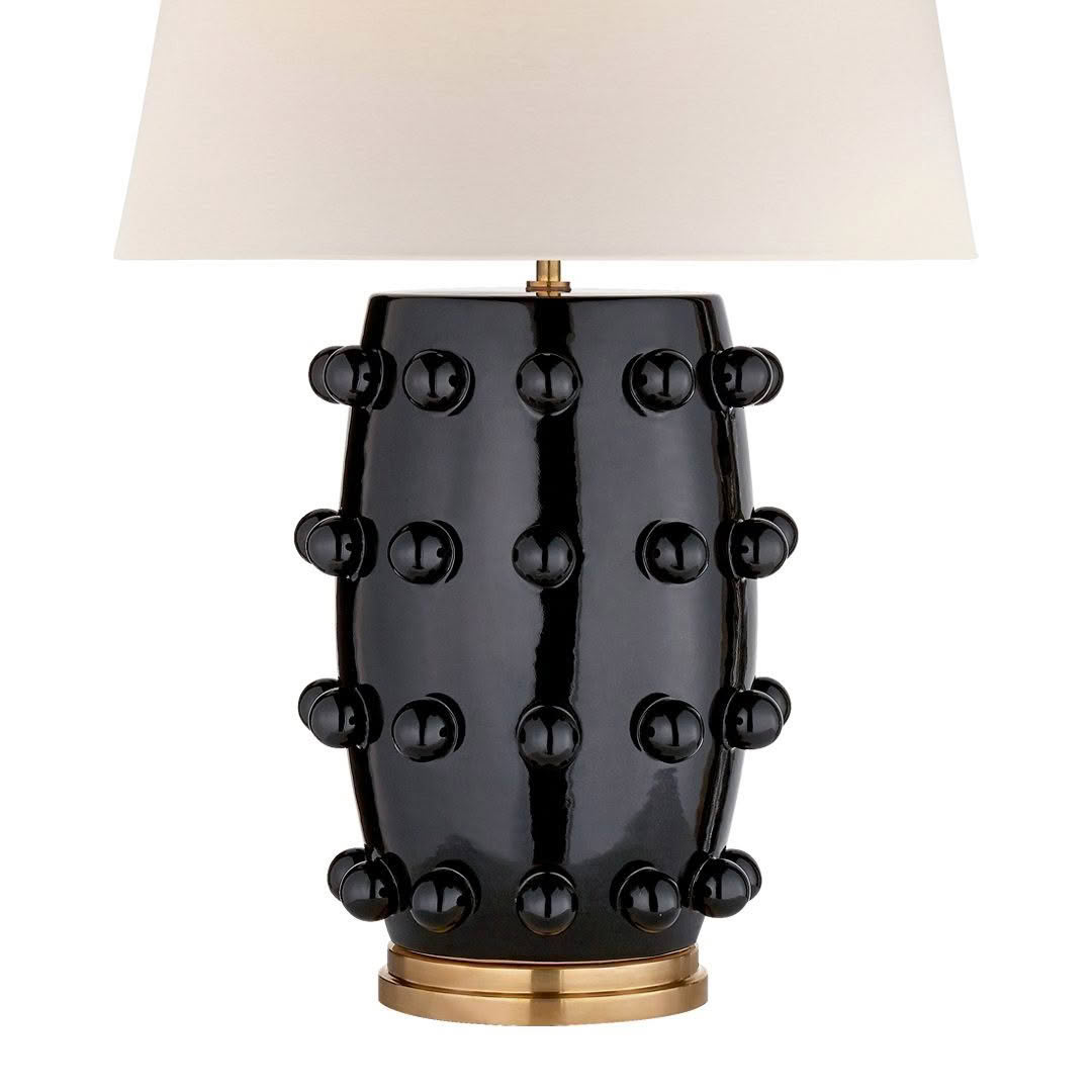 Offering both illumination and an eye-catching, eclectic modern focus point, the Linden Medium Lamp by Kelly Wearstler is a piece that universally elevates spaces from cozy beach cottages to sleek, modern offices. A hand-sculpted ceramic body is grounded by a solid brass base and features a repeating pattern of decorative spheres carefully arranged on the body of the lamp. The Linden Medium Lamp is offered in either Plaster White or glossy Black reactive glaze. It is available in either a traditionally illuminated model or cordless, with a rechargeable LED and Touch Dimmer, making it adaptable to bedside tables, credenzas, or any other space in need of visual interest and ambient illumination.