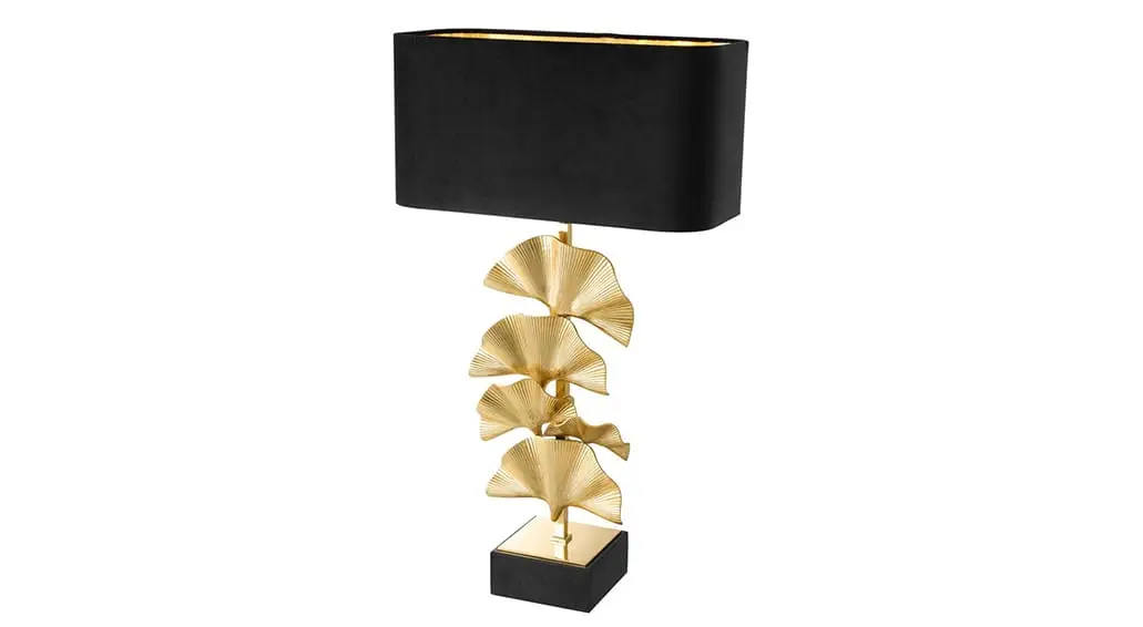 If you love the botanical jungle trend, the Olivier Table Lamp is a must have for you! With its elegant curves and intricate detailing, this arborous beauty will grant tropical opulence to your interior. The lamp base features 4 polished brass palm leaves and a black granite base plinth. It comes with a black velvet lampshade.