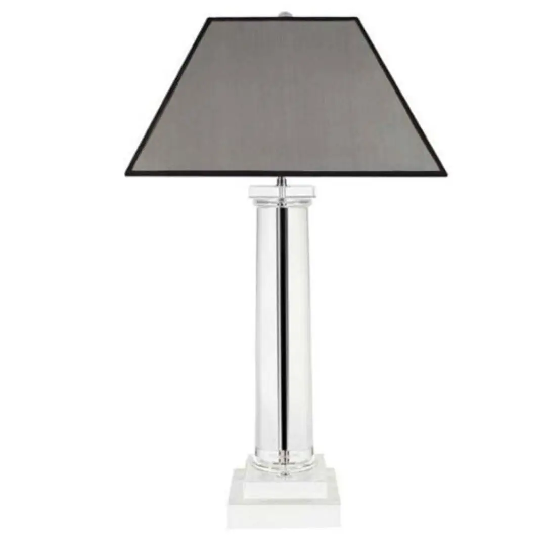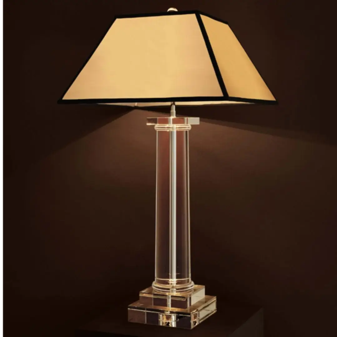 Modern clear glass table lamp with white shadeElegant lamp and vases on a wooden table