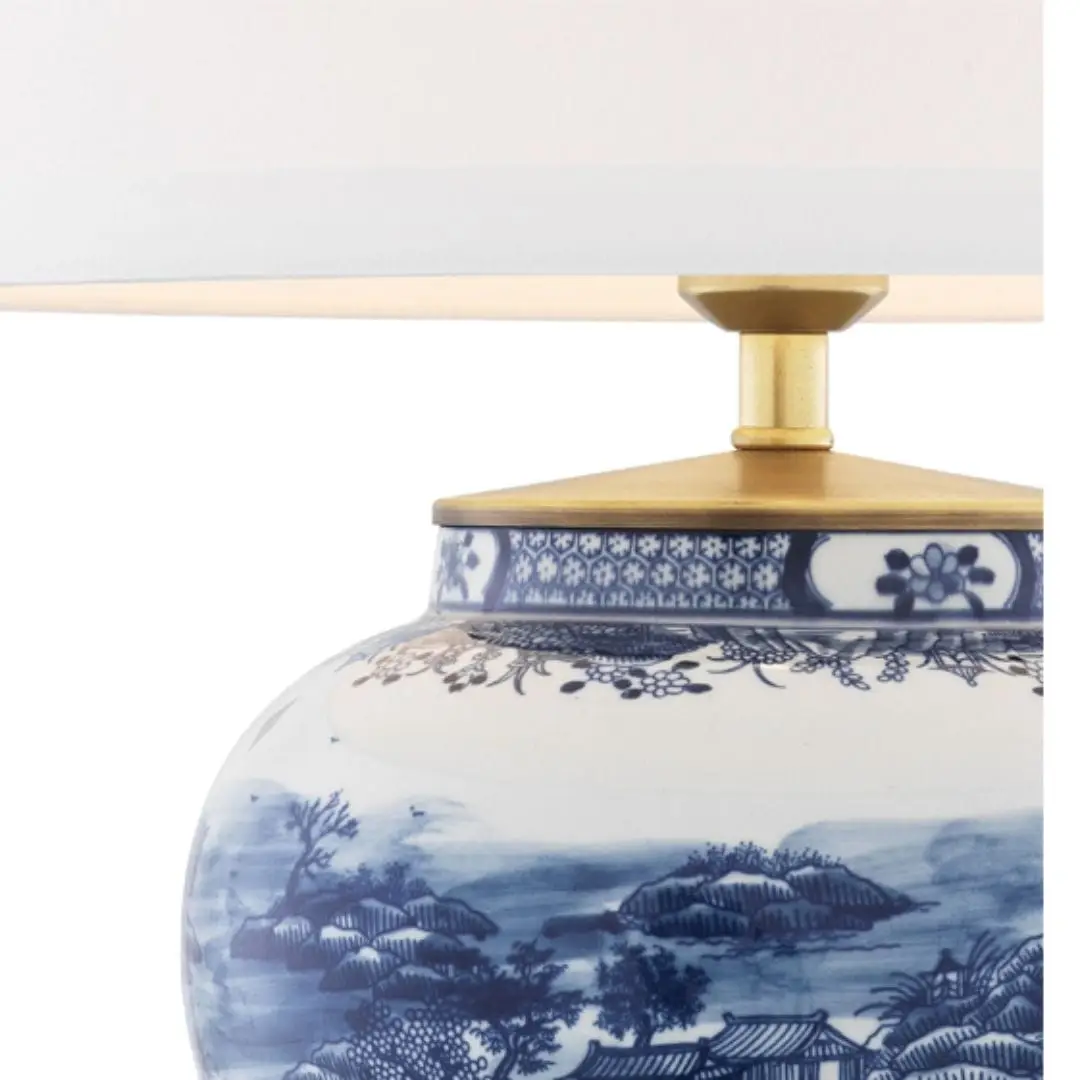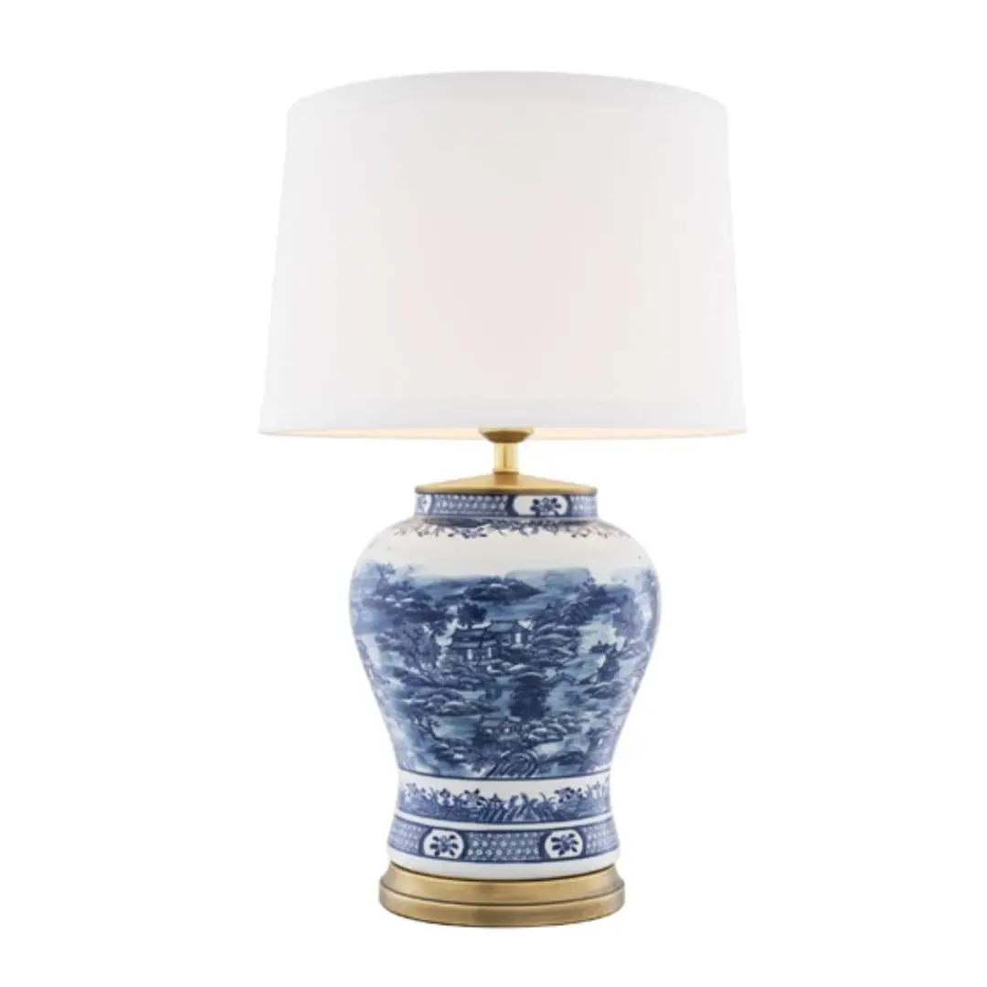 Blue and white porcelain table lamp with shade