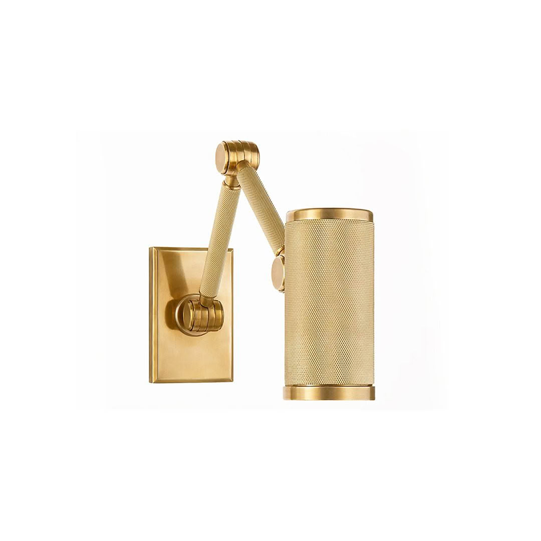Inspired by the utilitarian textures found in industrial design, the Barrett double-arm bed light features a knurled, diamond-shaped pattern embossed into the solid brass body. Presented with an extendable arm and an adjustable shade, the petite silhouette is equipped with modern functionality, including dedicated LED and a built-in dimmer switch.