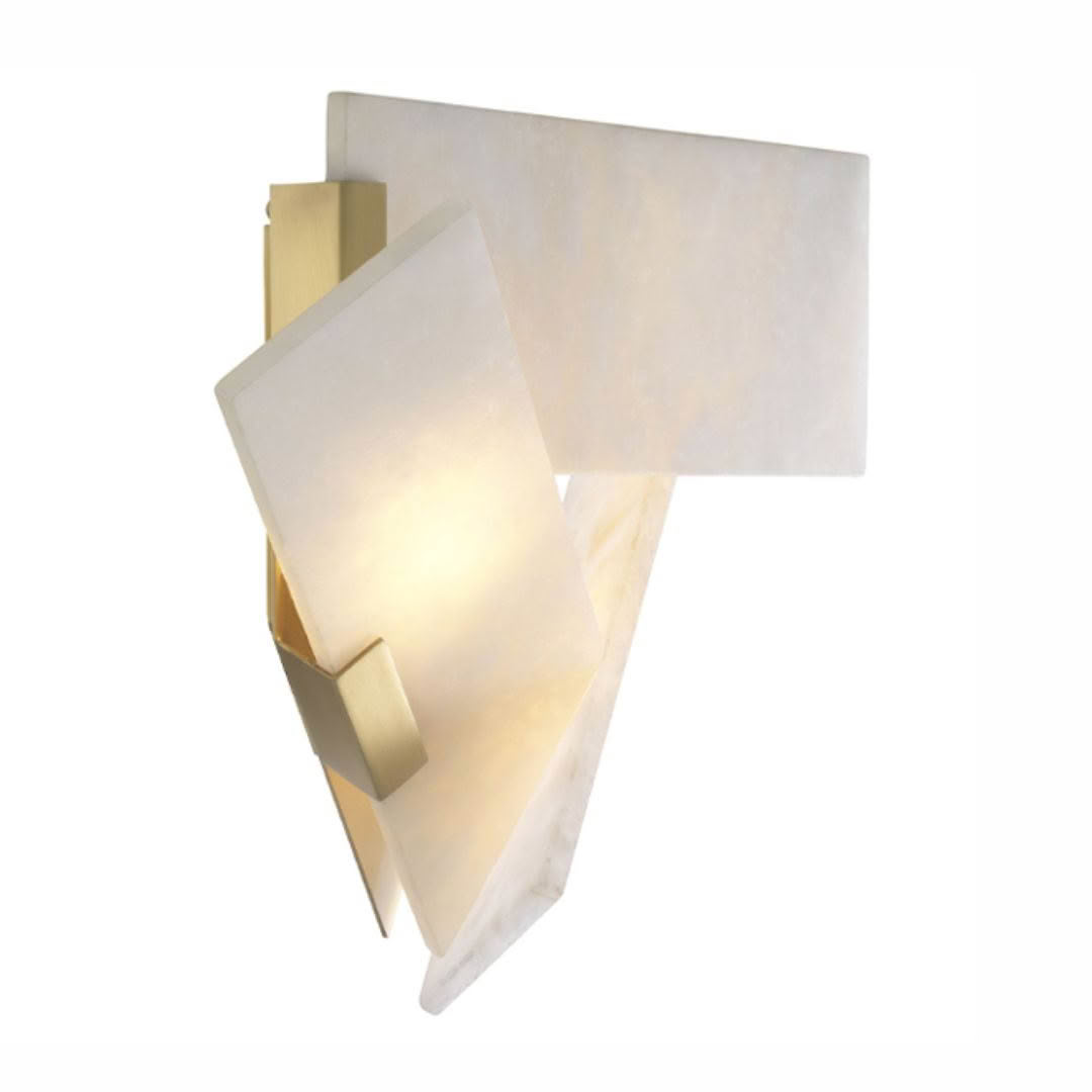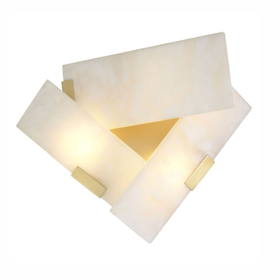 The antique brass finish Wall Lamp Bella Bianca is a modern wall washer light for contemporary interiors. Its triangular design provides a geometric play, with light shining through the alabaster plates and delicate openings. Providing a wonderful play of lines and surfaces, this wall lamp is a great choice for any living space.