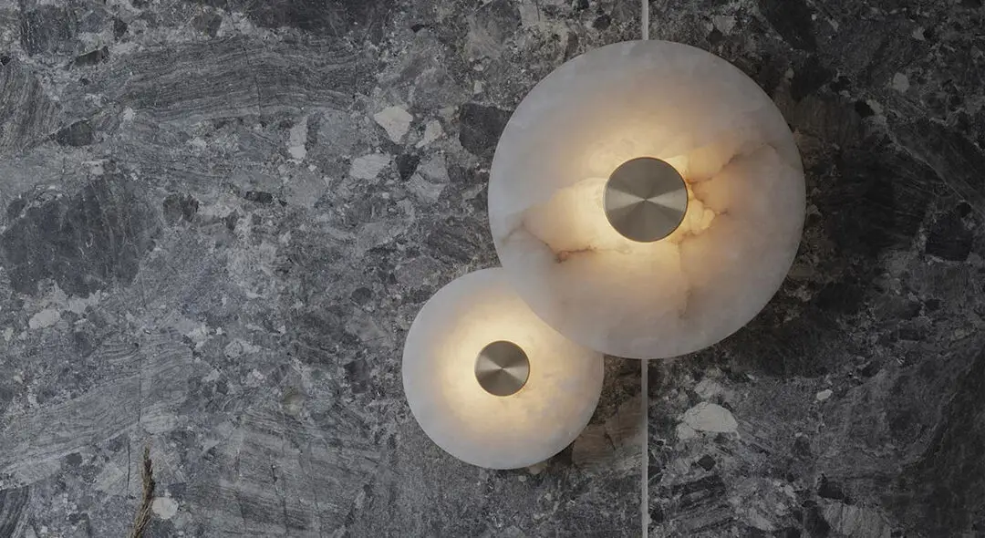 Bide is a singular disc shaped wall light available in two sizes designed to be used in multiples, overlapping and intertwining, to create beautiful sculptural silhouettes which exude a soft warm ambient glow. Both functional and decorative, Bide is a contemporary modular wall light that combines sophisticated brushed brass and delicate alabaster and is suitable for bathrooms for flexible usability.