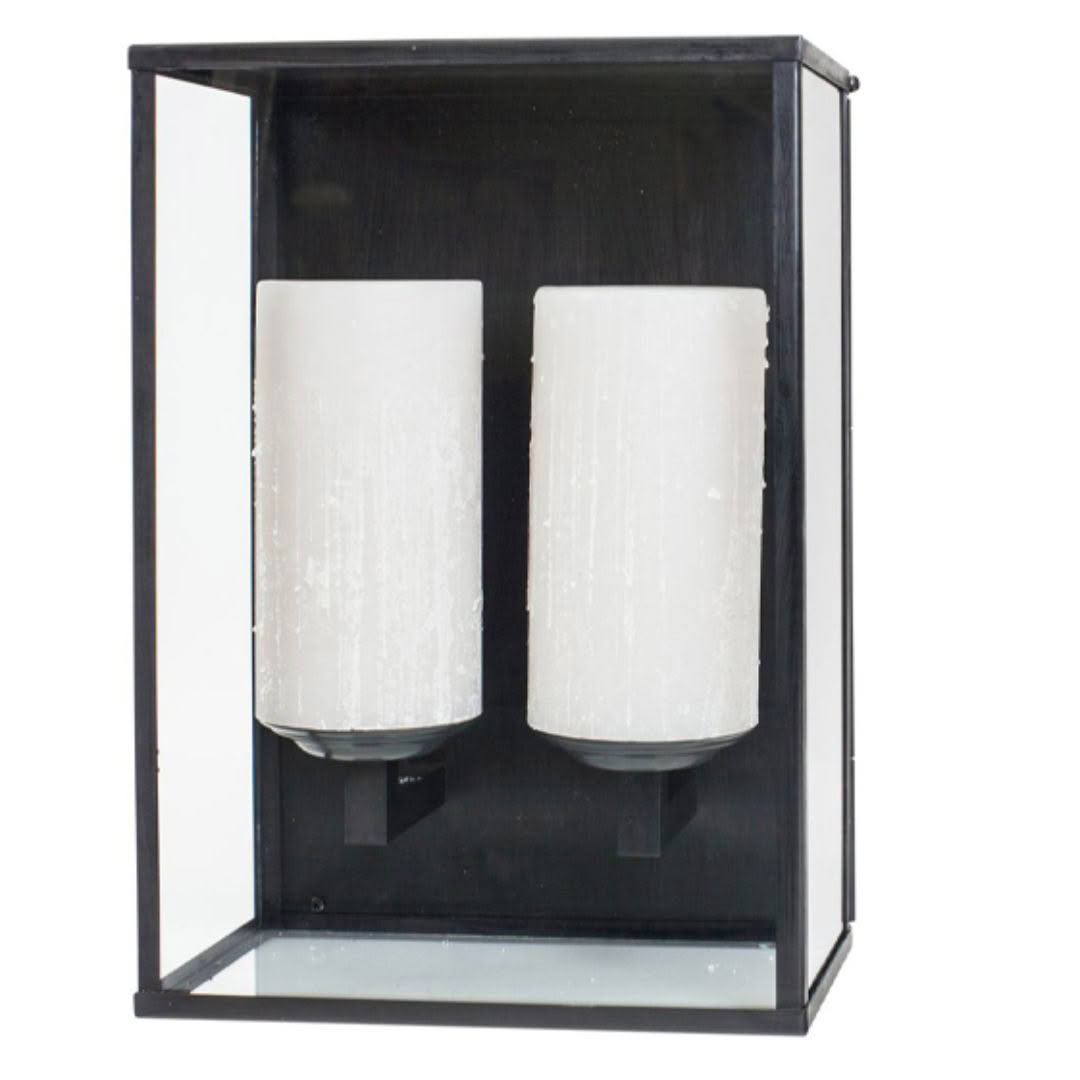 Outdoor black lantern wall sconce with illuminated bulbWall-mounted lantern with ivy on orange background