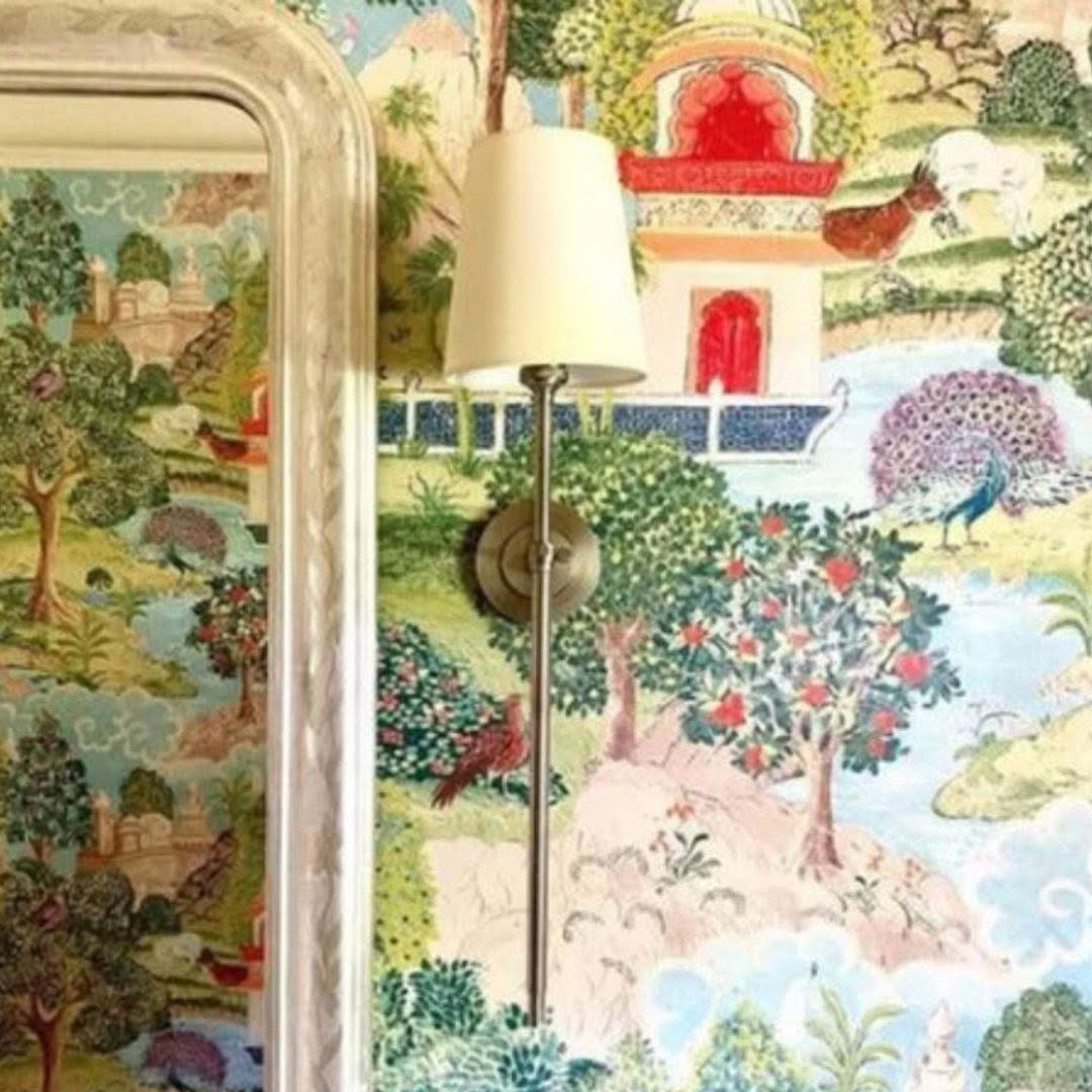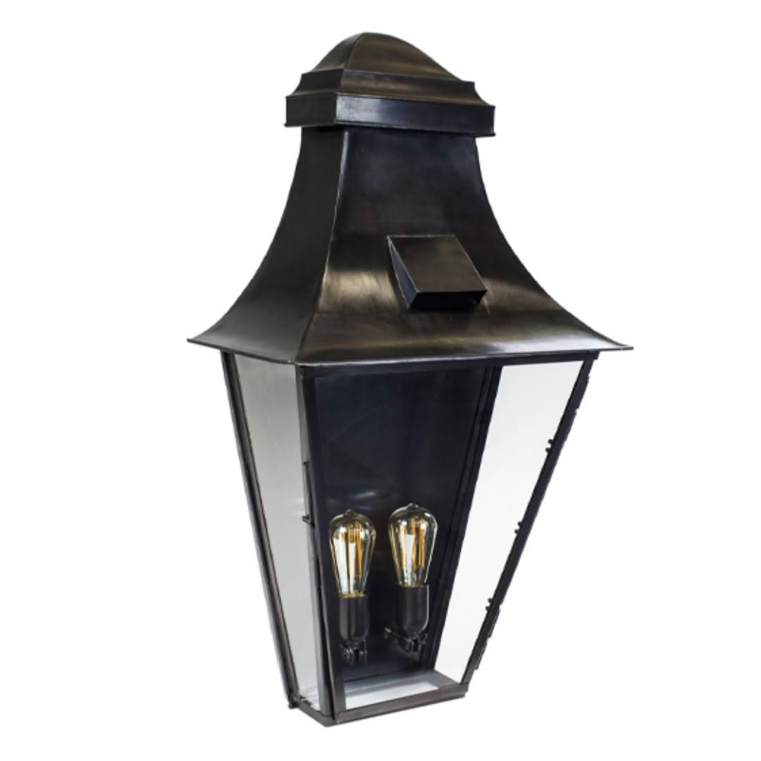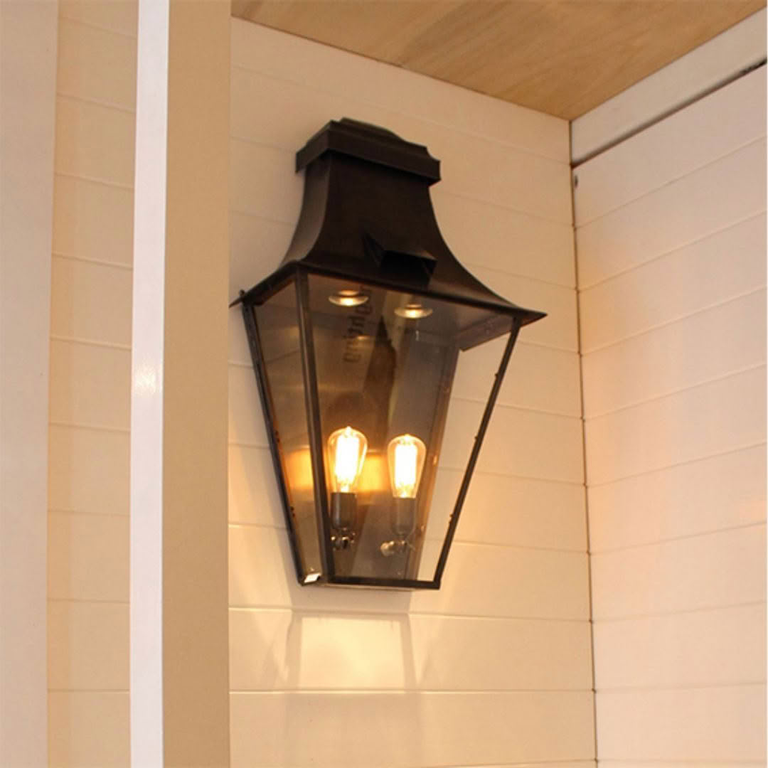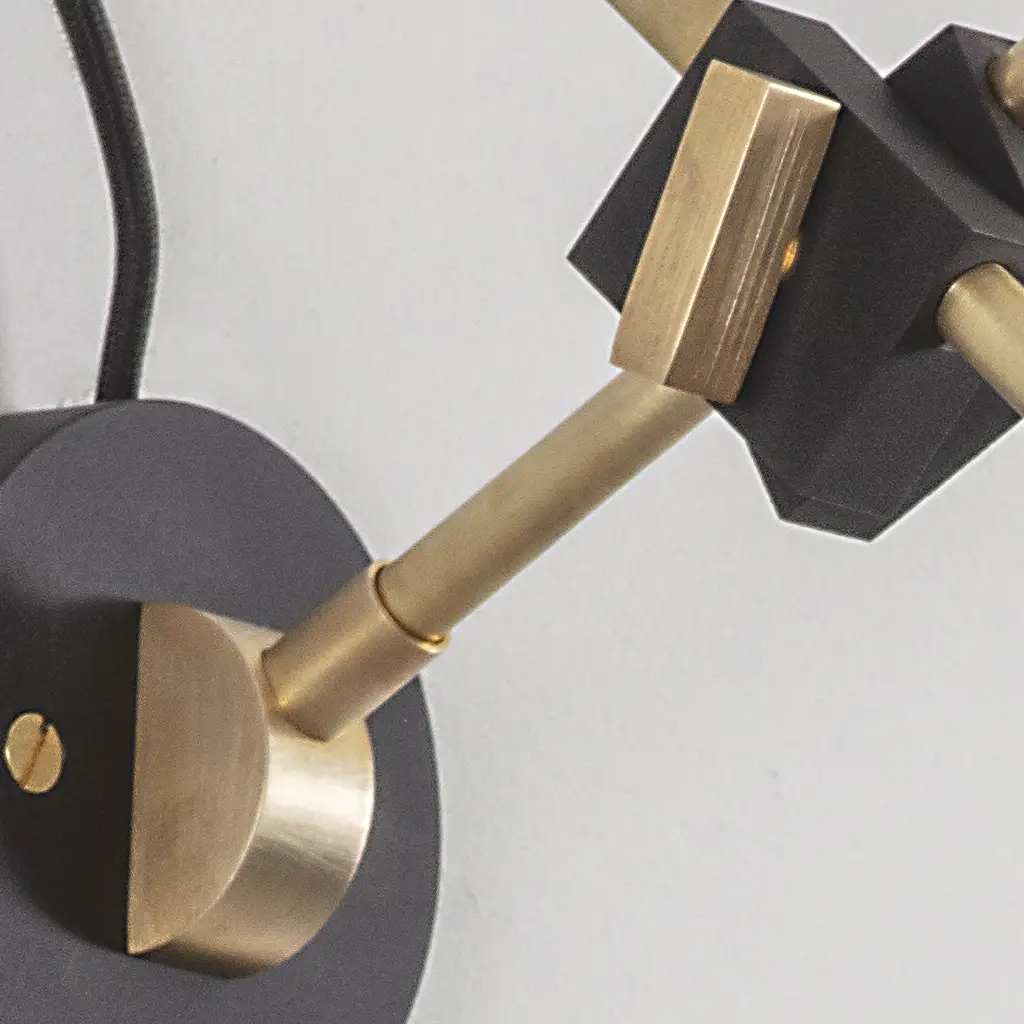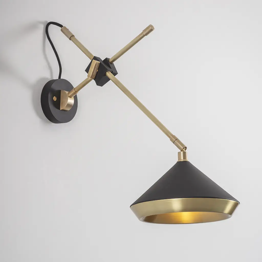 Black modern wall-mounted lamp with Edison bulbBrick wall with window and hanging light fixture