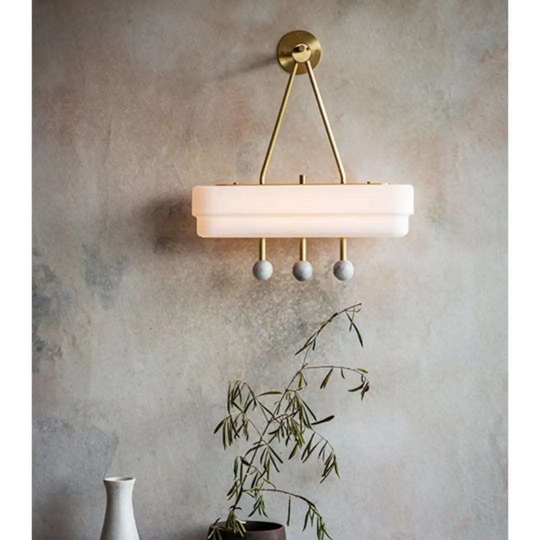 Showering any space in a gentle wash of light this Art Deco influenced wall sconce features a soft opal stepped glass shade, satin brass metalwork and opulent marble highlights.