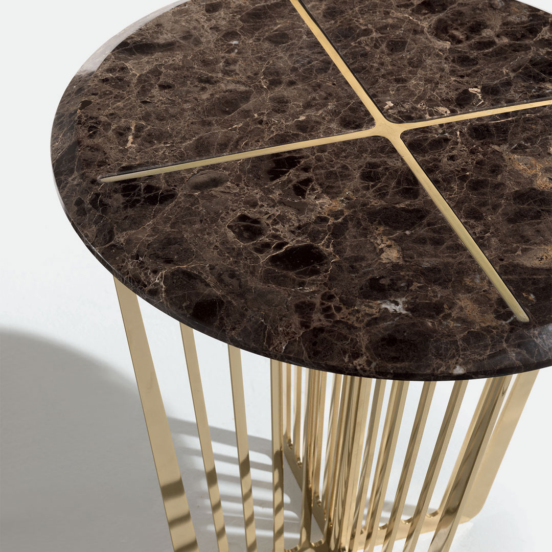 Lightness and solidity, an oxymoron that becomes reality in the Alfieri small table. The particular metal base is characterized by a vertical design that alternates a play of solids and voids. The top, available in various sizes, is made of marble, a precious and refined material. The final effect is unexpected due to the inlay on the top that takes up the lines of the base for a visual effect of continuity. The Alfieri small table in its beauty furnishes with ease both the living and night area for an elegant refined design.