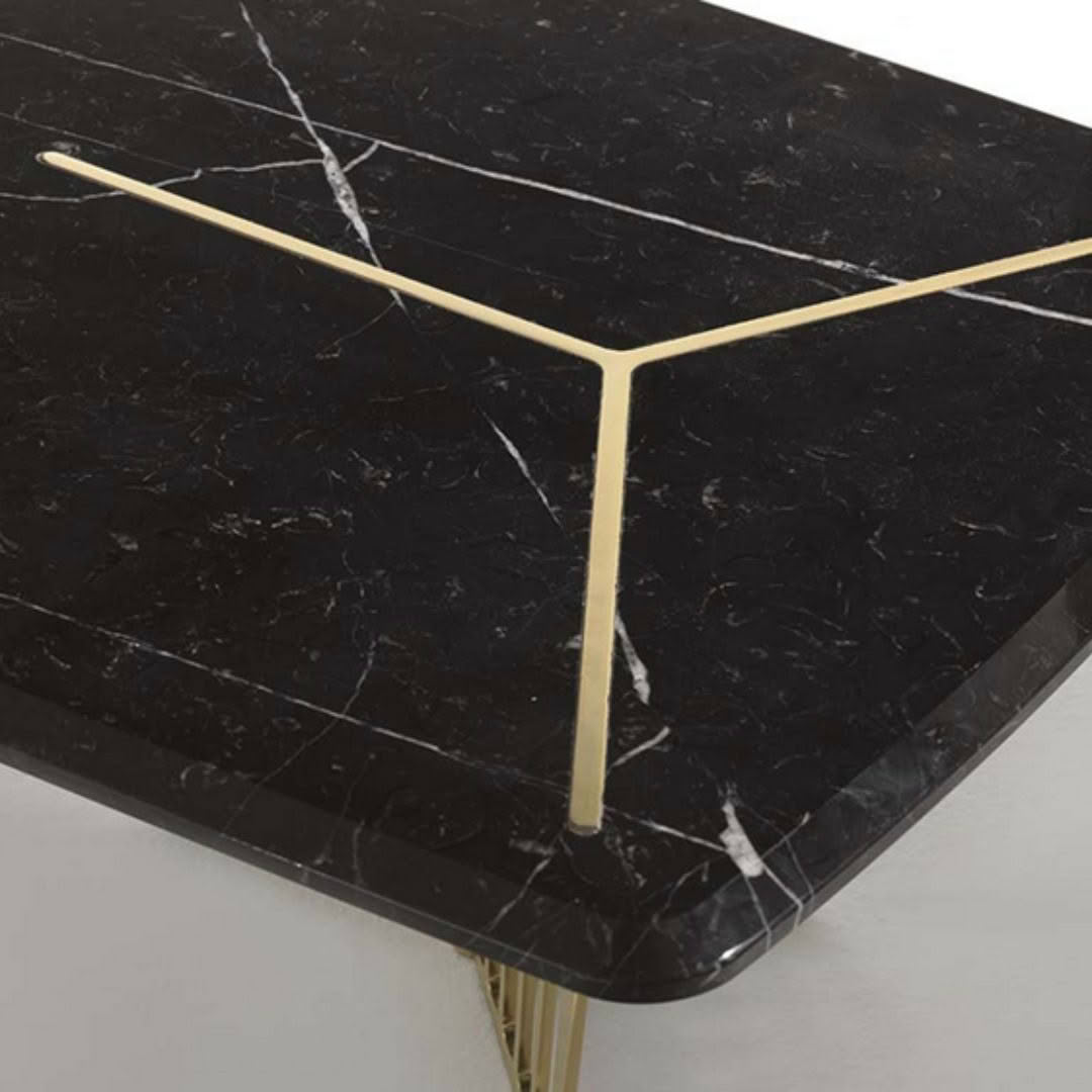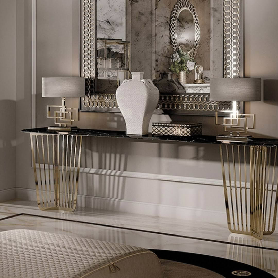 The peculiarity of the metal base and the top in marble with metal inlays make this item light and elegant.