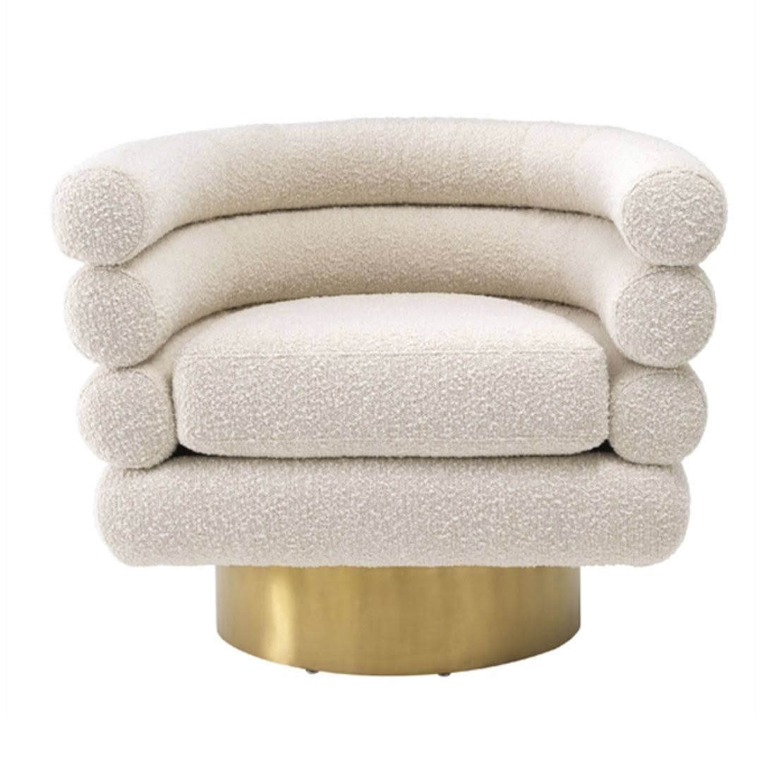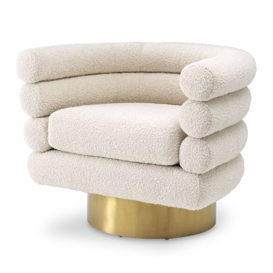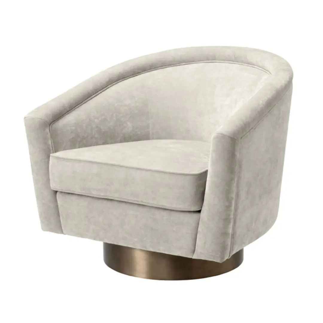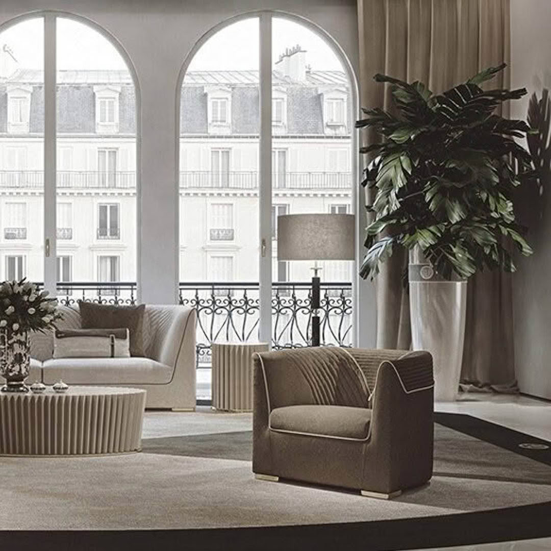 Tan swivel chair with embroidered cushionElegant living room with plush sofas and marble table