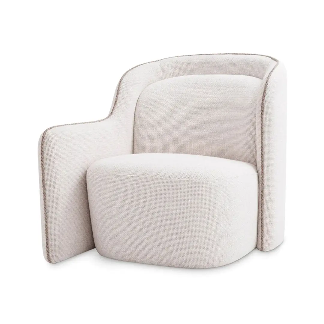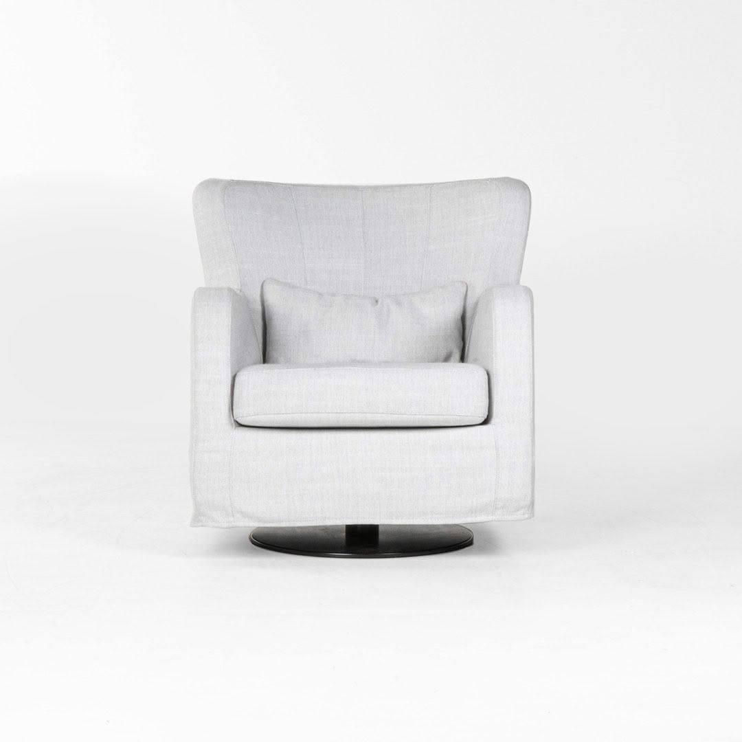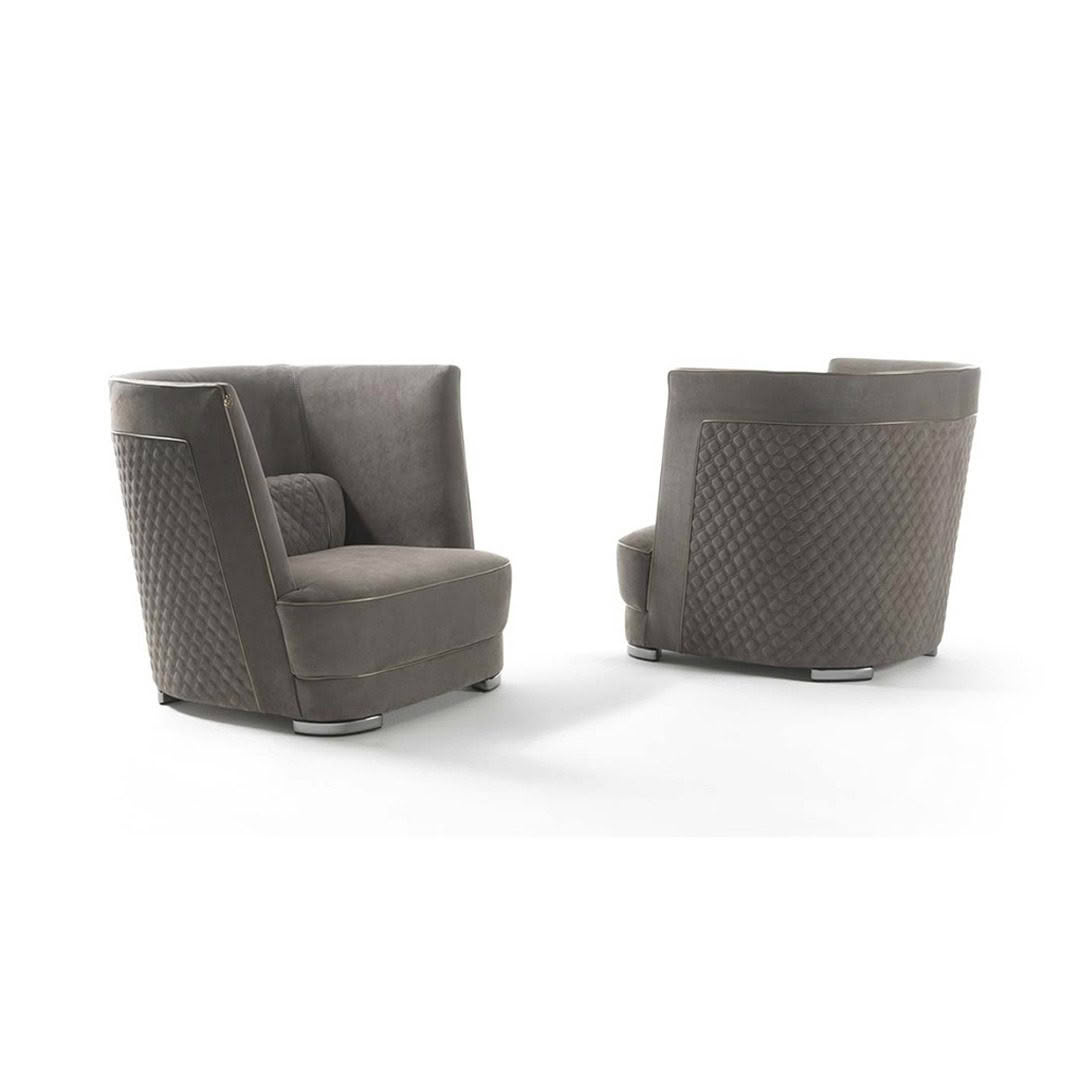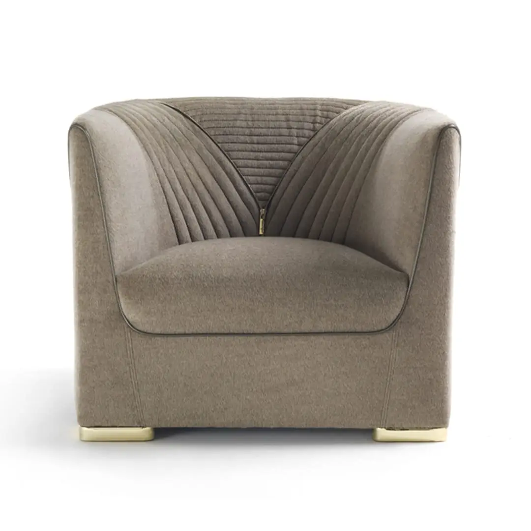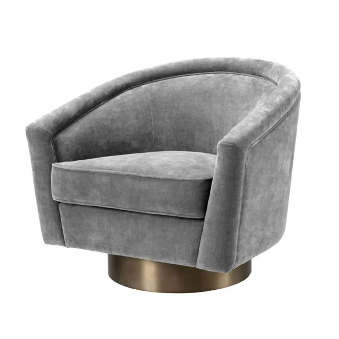 Tan swivel chair with embroidered cushionElegant living room with plush sofas and marble table