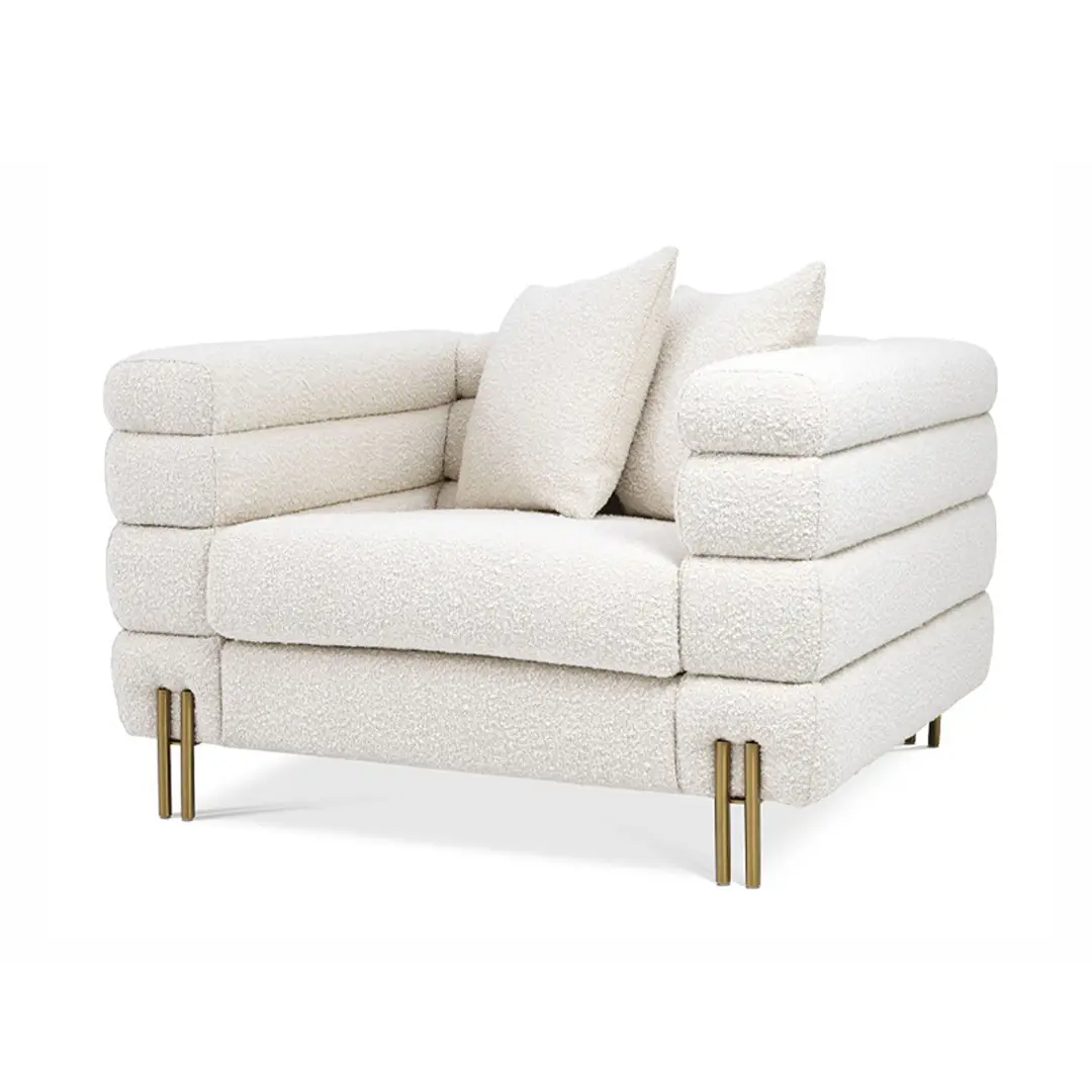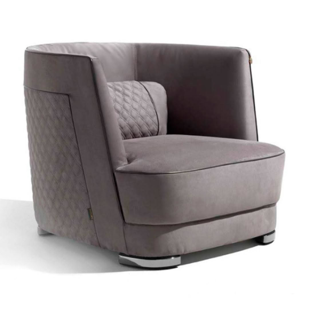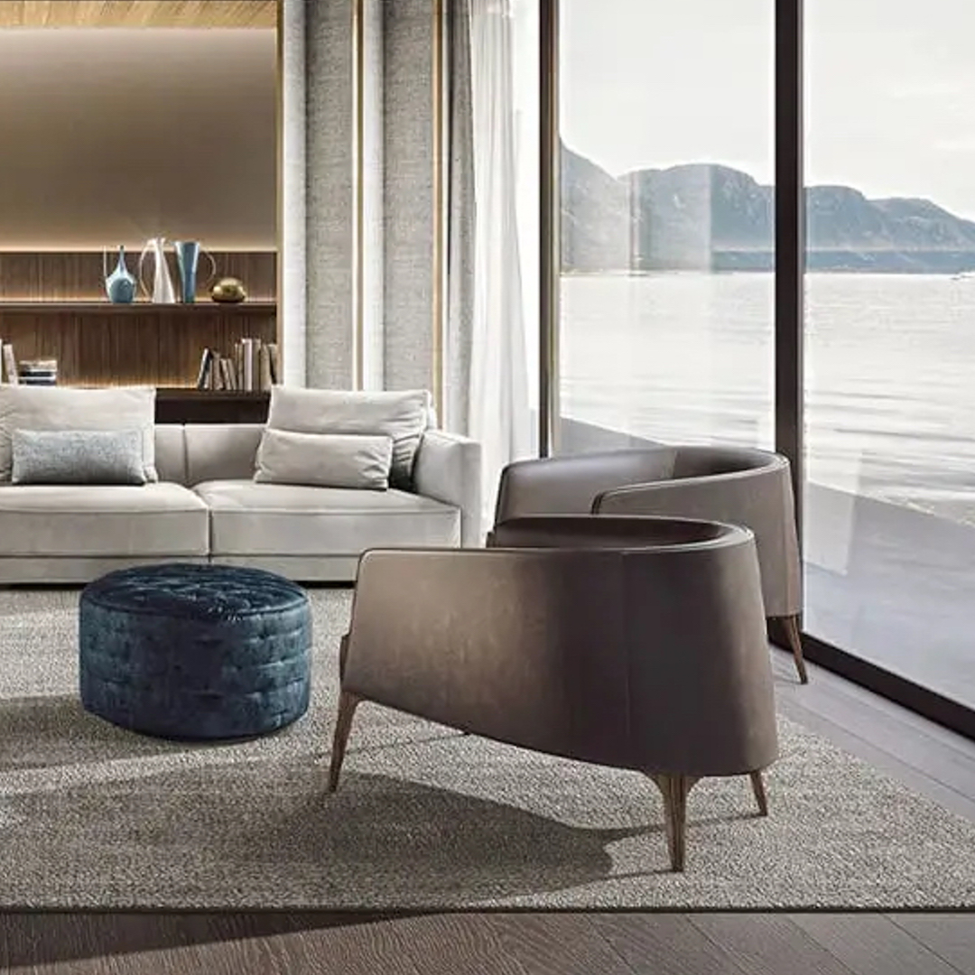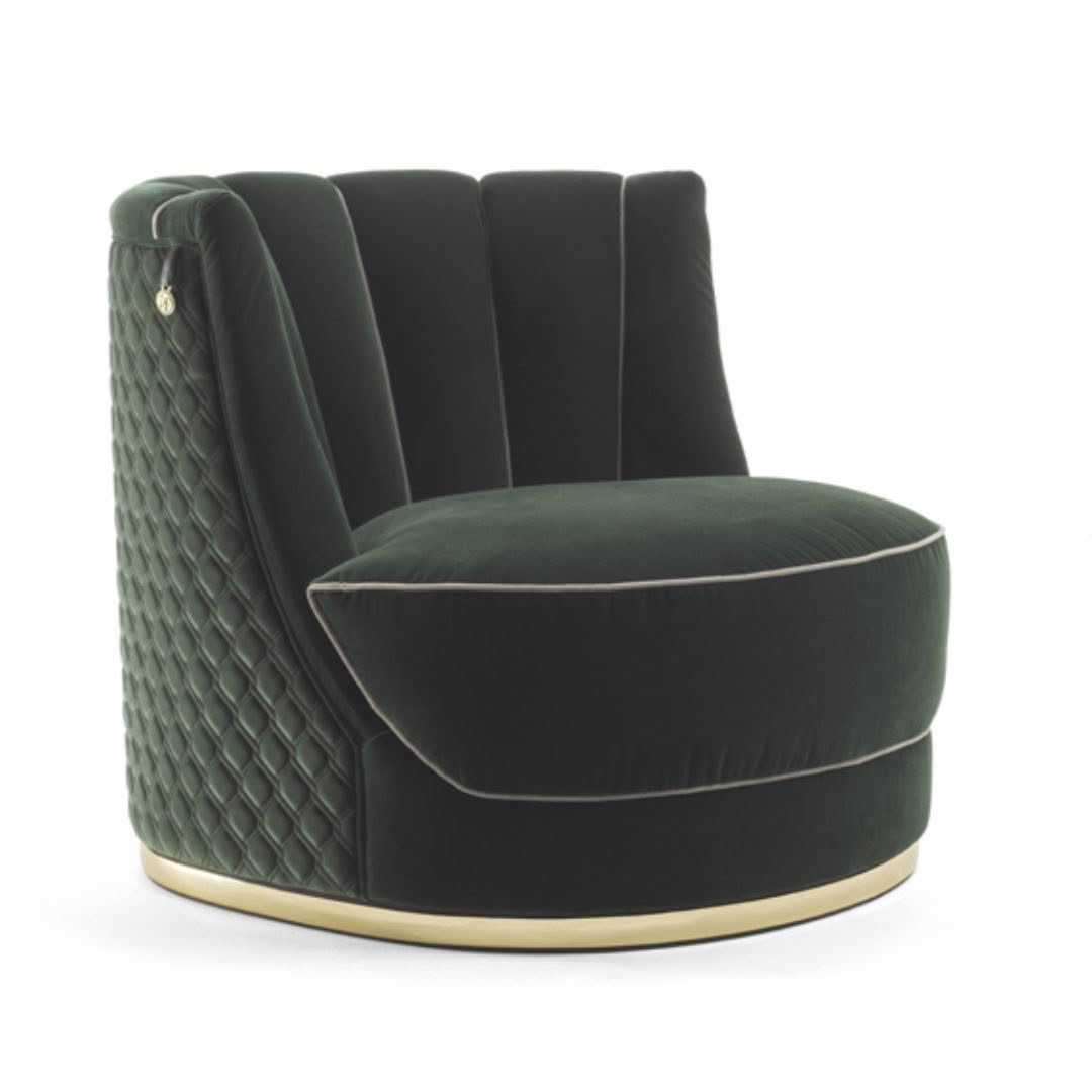 Tan swivel chair with embroidered cushionElegant living room with plush sofas and marble table